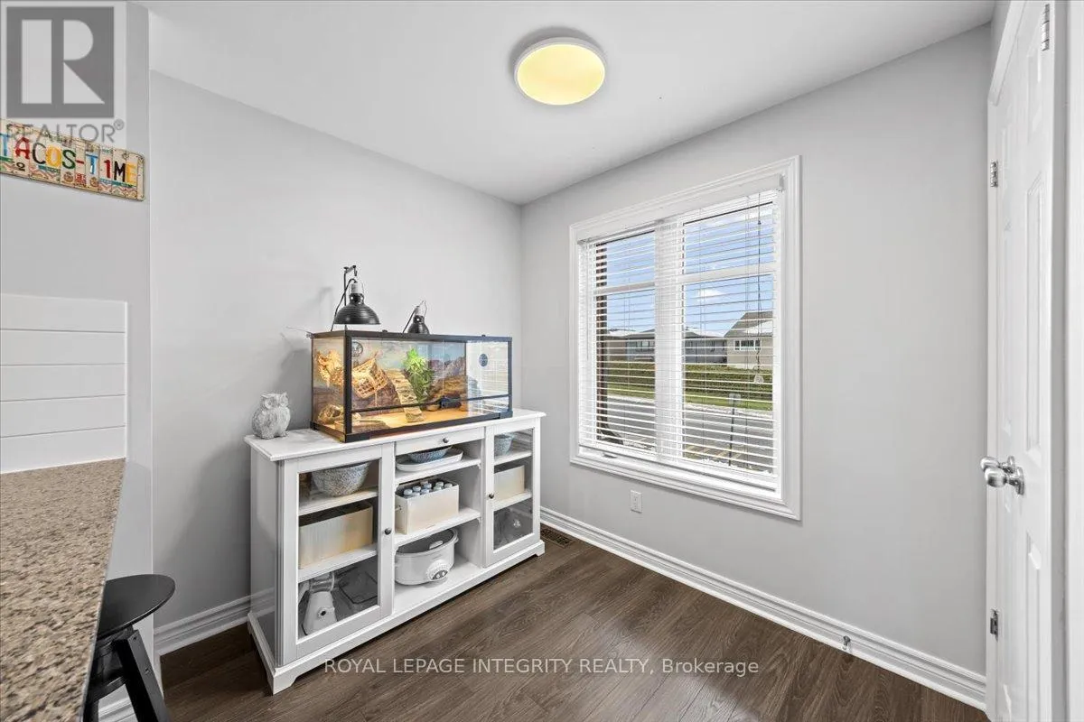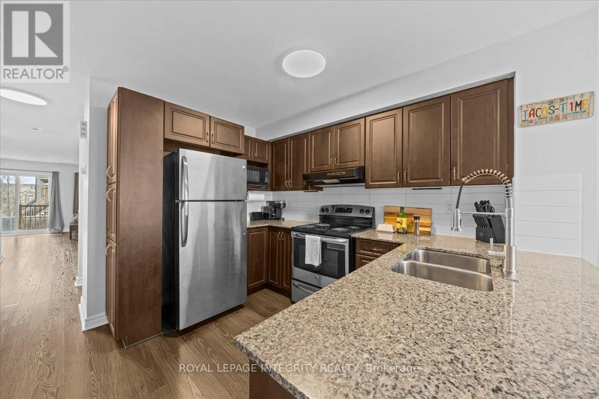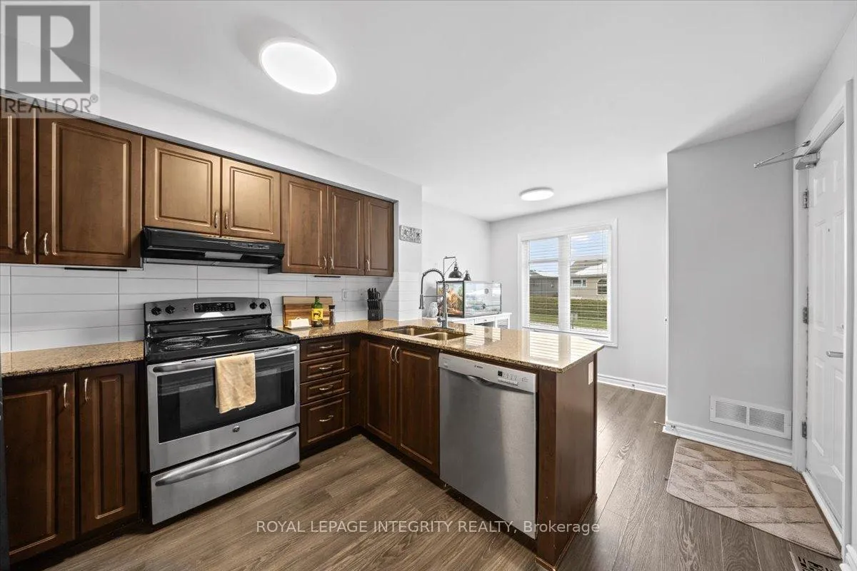 Cross Streets: Marble / Docteur Corbeil. ** Directions: Laurier to St-Jean, left on Docteur Corbeil. Welcome to 1124 Docteur Corbeil, Unit 11 - a beautifully maintained and freshly painted 2-bedroom, 2.5-bath stacked condo offering over 1,250 sq ft of total living space and two parking spaces, ideally located in the highly desirable Morris Village. Just steps from parks and multiple schools, and minutes to all of Rockland's amenities, this home perfectly blends comfort, convenience, and location. The bright entrance features a large closet and offers an immediate glimpse of the laminate flooring that flows throughout the main level. The kitchen boasts rich wood cabinetry, granite countertops, stainless steel appliances, a white tile backsplash, ample counter space, and a peninsula overlooking the eating nook. Pass by the updated main-floor powder room with new tile and granite countertops before entering the open-concept dining and living area, flooded with natural light from patio doors leading to a private balcony with storage - perfect for entertaining or BBQ dinners. The lower level offers two generously sized bedrooms, each with its own ensuite bathroom and large windows providing excellent natural light. Completing this level is a spacious storage area with convenient in-unit laundry. Freshly painted in November 2025, move-in ready, and ideally located, this home is sure to impress. Come take a look! (id:27476)