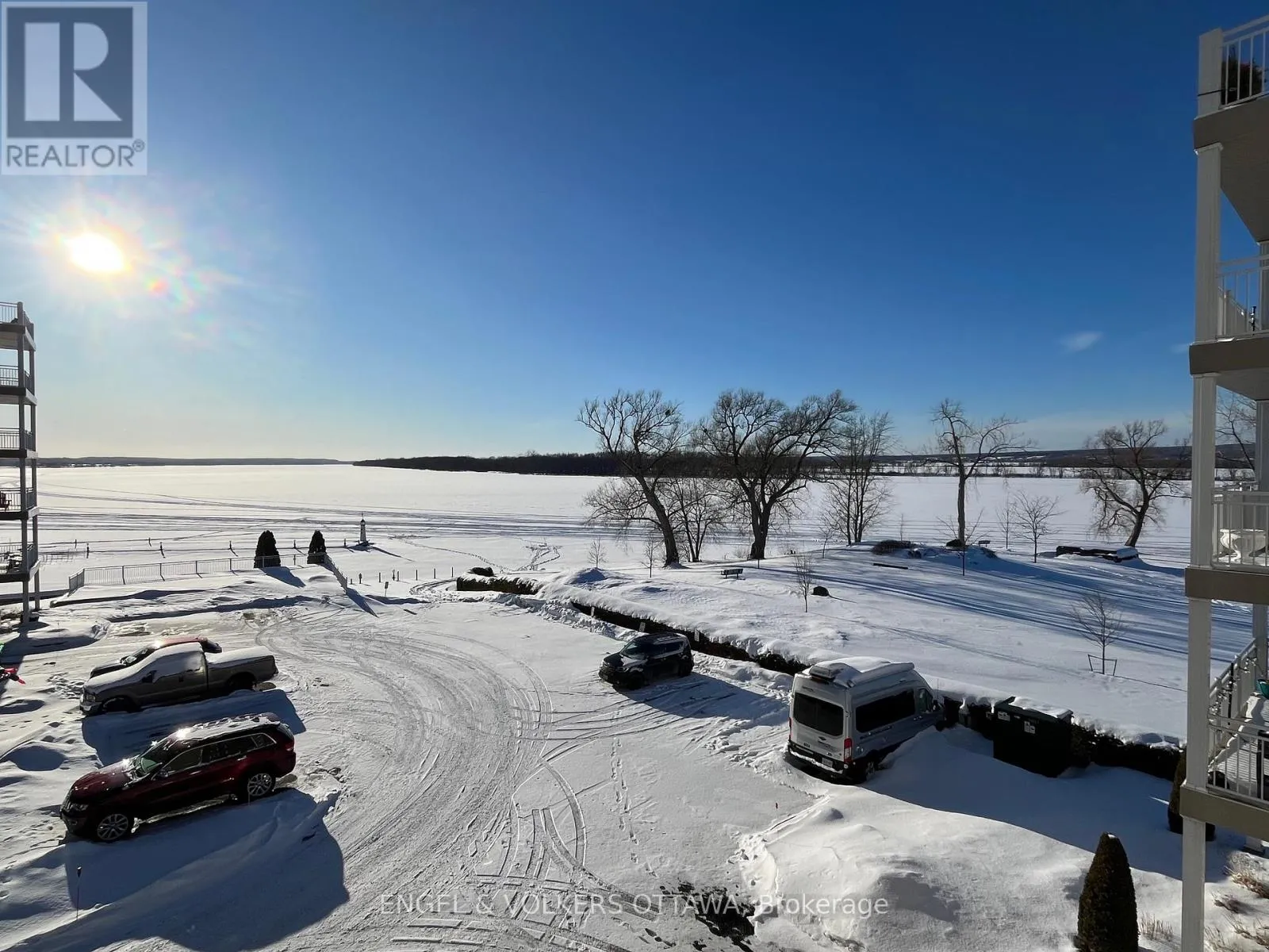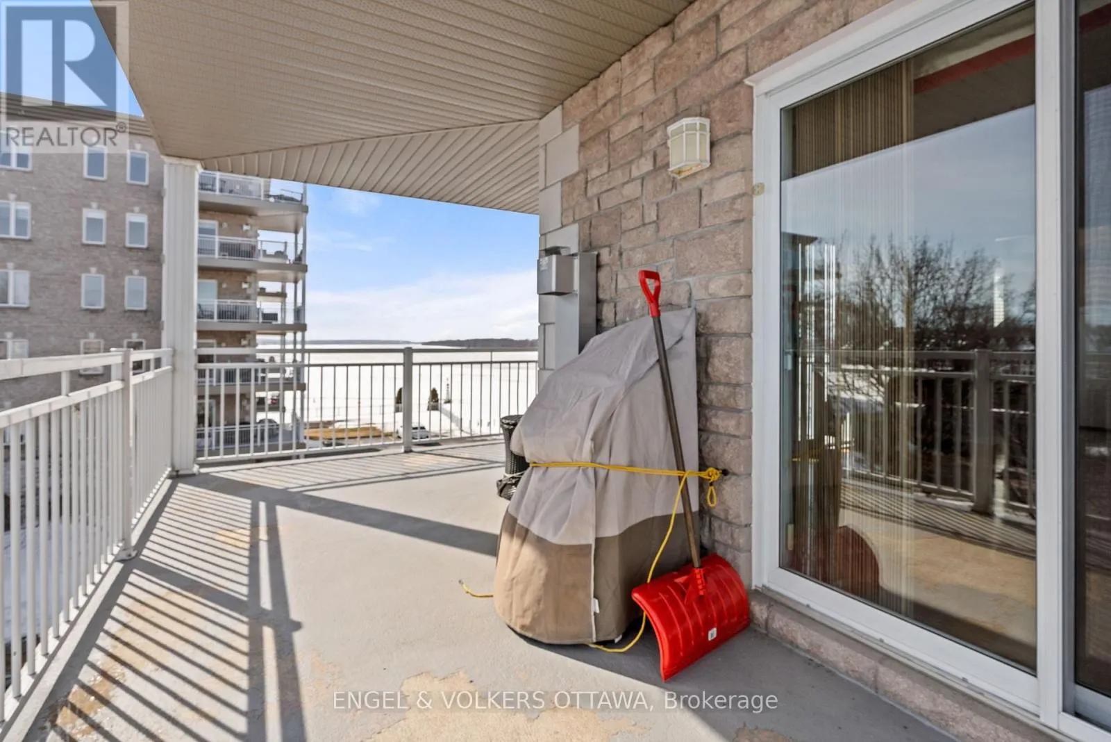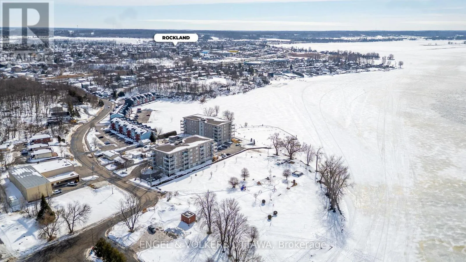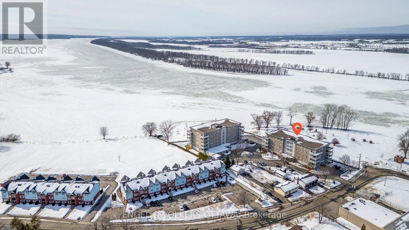 Cross Streets: Edwards St & Woods St. ** Directions: From Hwy 17, turn onto Edwards St. This bright and spacious corner unit with 1,165 sq ft of living space and a wrap-around balcony is positioned along the scenic banks of the Ottawa River. The apartment's position on the 2nd level of the building gives it direct waterfront views, incredible daylight, & beautiful sunsets over the water. Its living room is anchored by a gas fireplace, has access through two sliding glass doors to the river-facing balcony, & features hardwood flooring, which runs through the living areas, creating a warm, cohesive atmosphere. The well-appointed kitchen features white cabinetry, quartz countertops, stainless steel appliances, ample counter space & storage, & direct access to a corner pantry. A laundry room/powder room is found by the front entrance to the unit. The primary bedroom features a large walk-in closet, while the second bedroom includes a custom-built-in wall unit with a Murphy bed, shelving, & a dedicated desk area, making it ideal as both a guest room & a home office. The spacious main bathroom offers a luxurious soaking tub, a separate glass-enclosed shower, & additional cabinetry. This unit includes an underground parking space & a larger-than-average storage locker, also plenty of outdoor parking is available. The complex has a car wash in the garage, a workshop, a party room, an exercise room, & a scenic outdoor BBQ area with a dedicated kitchen & fridge, located just steps from the river. From the grounds, you can access the marina, Du Moulin Park, walking paths, & plenty of green space, making it ideal for those seeking a calm, quiet home. The town of Rockland has a small-town atmosphere while still being close to everyday amenities, restaurants, grocery stores, shops, & essential services along Laurier Street, as well as a library, YMCA, indoor pool, fitness facilities, & community programming. Quick access to Highway 17 makes commuting into Ottawa simple and efficient, all while living in a picturesque setting. (id:27476)