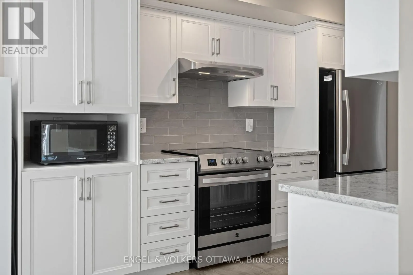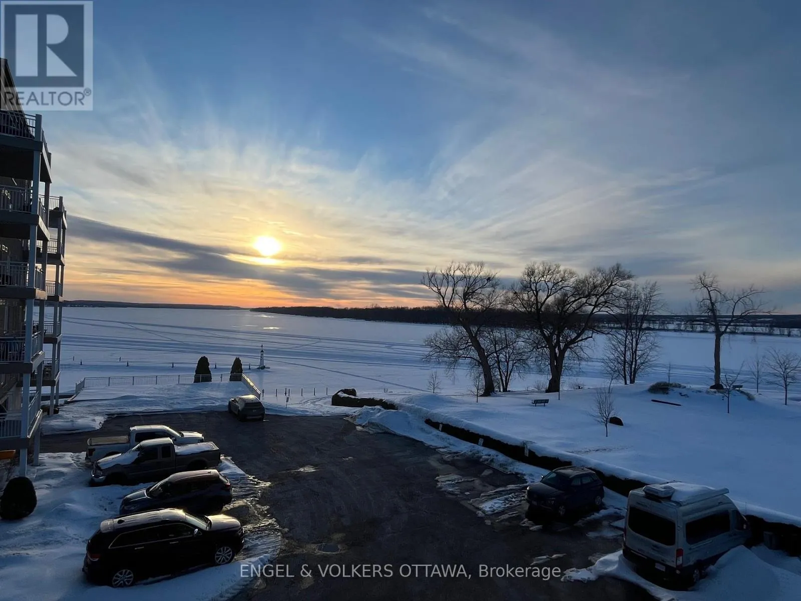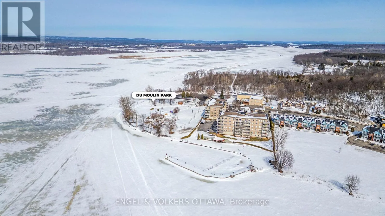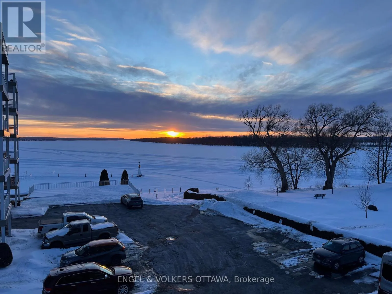 Cross Streets: Edwards St & Woods St. ** Directions: From Hwy 17, turn onto Edwards St. This bright and spacious corner unit with 1,165 sq ft of living space and a wrap-around balcony is positioned along the scenic banks of the Ottawa River. The apartment's position on the 2nd level of the building gives it direct waterfront views, incredible daylight, & beautiful sunsets over the water. Its living room is anchored by a gas fireplace, has access through two sliding glass doors to the river-facing balcony, & features hardwood flooring, which runs through the living areas, creating a warm, cohesive atmosphere. The well-appointed kitchen features white cabinetry, quartz countertops, stainless steel appliances, ample counter space & storage, & direct access to a corner pantry. A laundry room/powder room is found by the front entrance to the unit. The primary bedroom features a large walk-in closet, while the second bedroom includes a custom-built-in wall unit with a Murphy bed, shelving, & a dedicated desk area, making it ideal as both a guest room & a home office. The spacious main bathroom offers a luxurious soaking tub, a separate glass-enclosed shower, & additional cabinetry. This unit includes an underground parking space & a larger-than-average storage locker, also plenty of outdoor parking is available. The complex has a car wash in the garage, a workshop, a party room, an exercise room, & a scenic outdoor BBQ area with a dedicated kitchen & fridge, located just steps from the river. From the grounds, you can access the marina, Du Moulin Park, walking paths, & plenty of green space, making it ideal for those seeking a calm, quiet home. The town of Rockland has a small-town atmosphere while still being close to everyday amenities, restaurants, grocery stores, shops, & essential services along Laurier Street, as well as a library, YMCA, indoor pool, fitness facilities, & community programming. Quick access to Highway 17 makes commuting into Ottawa simple and efficient, all while living in a picturesque setting. (id:27476)