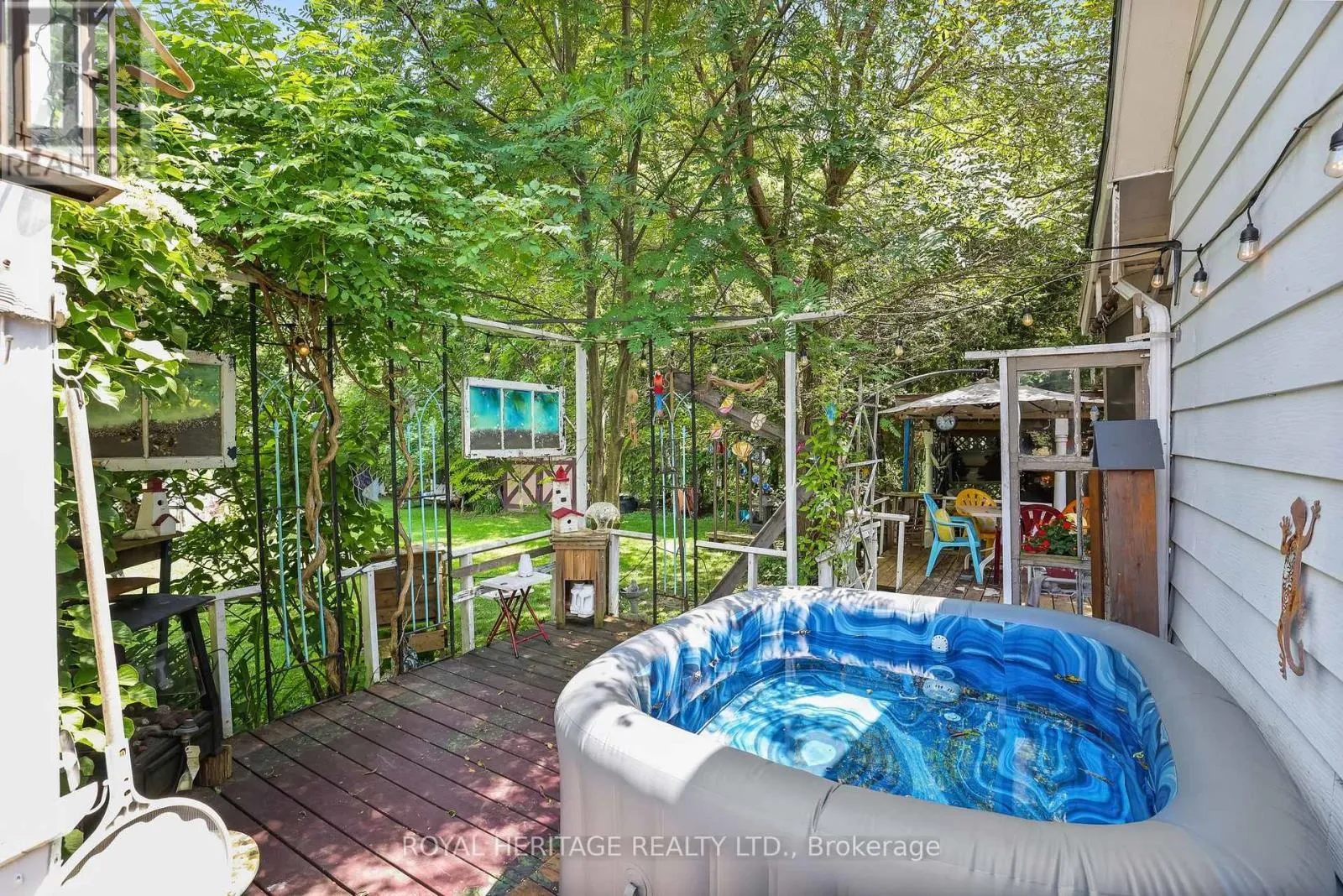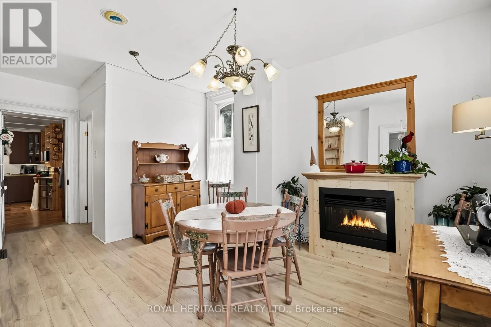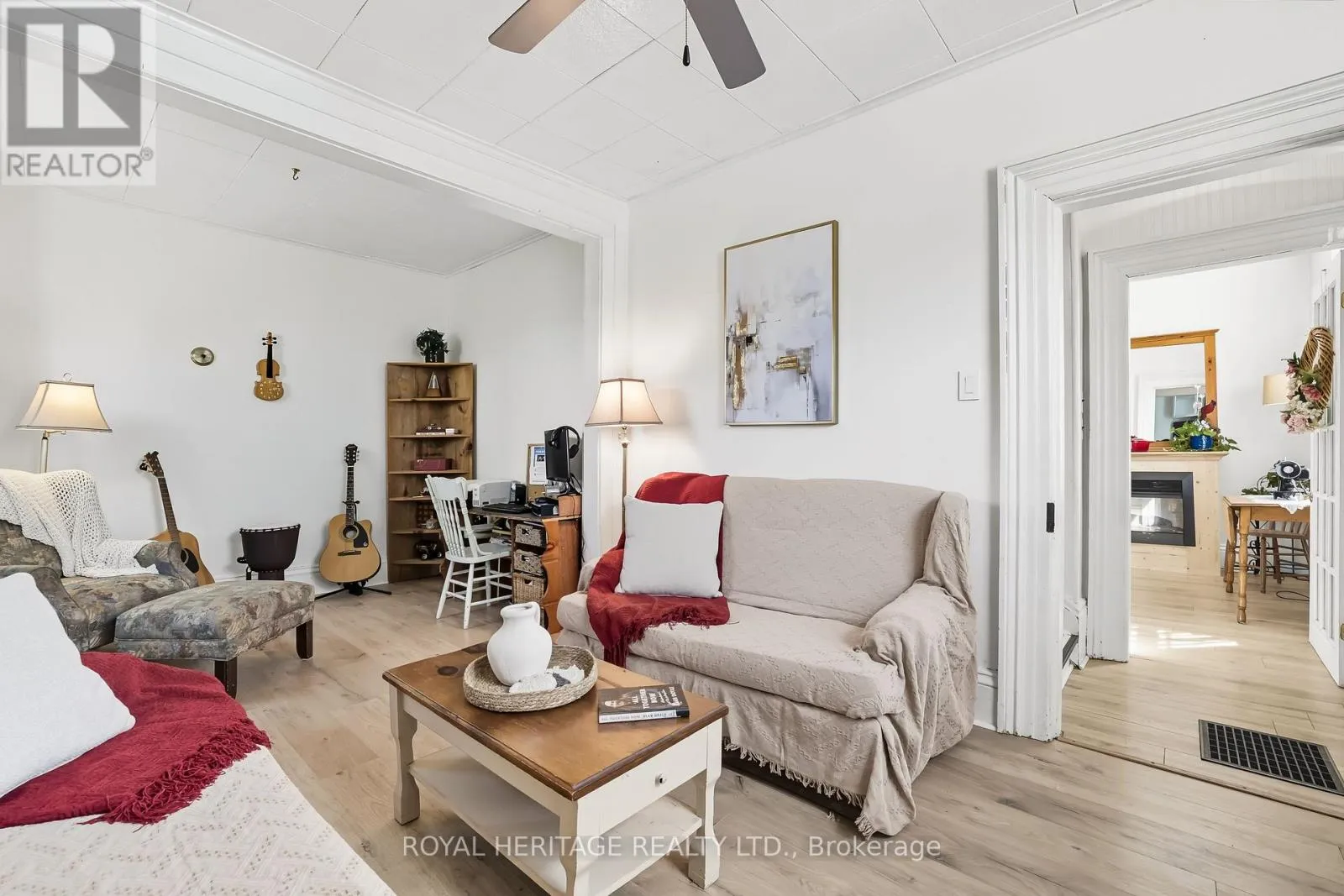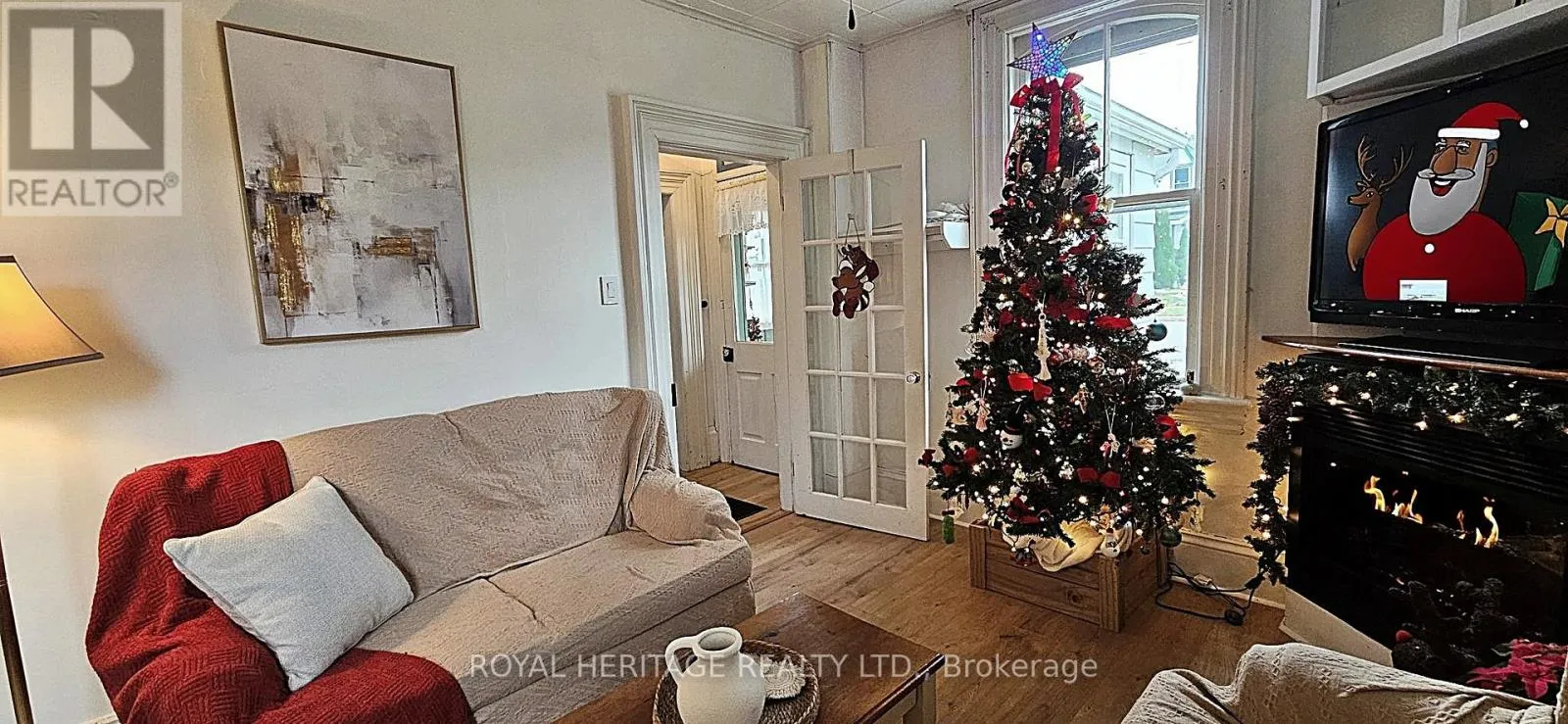 ELGIN & CONCESSION ST W Steps from downtown Bowmanville and a local school, this 2-bedroom, 2-bath century home is full of character and ready for its next chapter. Freshly painted throughout, it features a spacious living room with a built-in electric fireplace and tv nook and large dining room great for large gatherings, and a bright kitchen with plenty of cabinetry, windows overlooking the yard, a hanging pot rack, and classic butler doors. The front 3-season sunroom adds extra charm, while upstairs the primary bedroom offers a walk-in closet converted from the original nursery. Outdoors, the generous lot is made for entertaining and relaxation with a deck, hot tub, and above-ground pool, plus cozy nooks to enjoy year-round. Original windows and trims highlight the homes heritage, while the location offers unbeatable walk ability to shops, restaurants, schools, and amenities. A Bowmanville classic with space, charm, and endless potential to make your own. (id:27476)