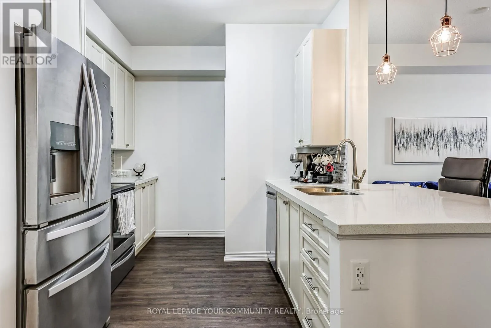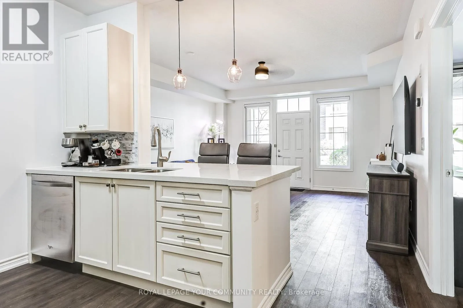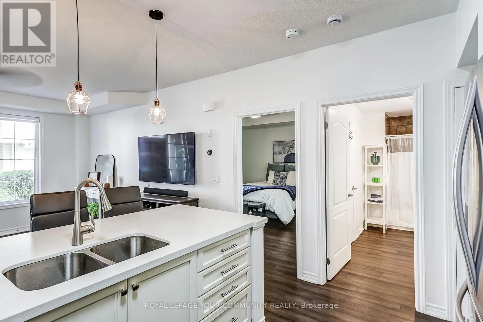 Bloor St / Townline Rd S Step into homeownership with this incredible condo townhouse - the perfect first home in a vibrant neighbourhood close to shops, parks, and all your daily essentials. This bright, modern, and freshly painted 1-bedroom, 1-bathroom unit offers over 800 square feet of stylish living space, with vinyl flooring throughout and soaring 9-foot ceilings that create an open, airy feel. Enjoy your morning coffee or unwind in the evening on your private porch - your own peaceful outdoor retreat. The sleek kitchen features quartz countertops, extended cabinetry, stainless steel appliances, and a breakfast bar which is ideal for cooking, casual dining, or entertaining guests. The sun-filled primary bedroom offers generous space and a large walk-in closet to keep everything organized, with an oversized semi-ensuite bathroom. Located on the ground floor, this unit offers comfort and convenience, including in-suite laundry and a private garage with direct access to the unit making daily life seamless. The community also features outdoor seating areas, a park, visitor parking, office space, a gym, and a recreation room with a full kitchen. Move-in ready and designed for easy living, this home is the perfect place to start your homeownership journey. Come see it today and imagine yourself living here! (id:27476)