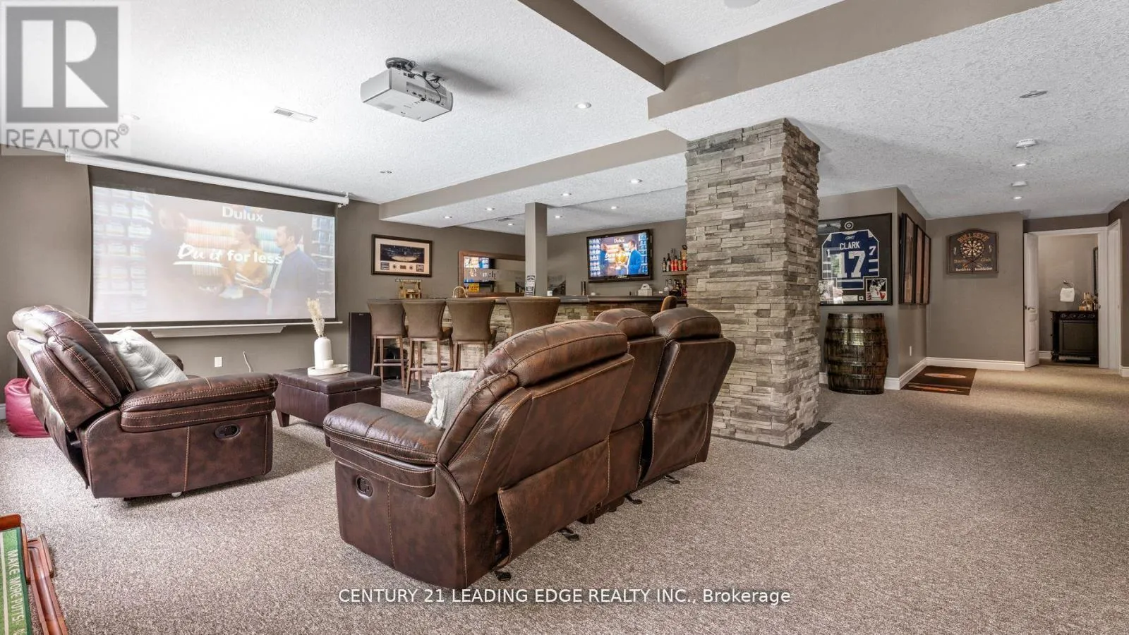 Nash Rd and Tooley Rd This custom-built 2-storey home is set on a deep lot on the desirable Tooley Rd. Boasting over 4,000 sqft of luxury living space, this property features 4 + 1 beds, 4 baths, & resort-style amenities. Vaulted ceilings grace both living & family rooms, complemented by pot lights and gleaming hardwood floors. The gourmet kitchen showcases breakfast bar, granite countertops and s/s appliances, opening onto a breakfast nook with walk-out access to deck overlooking the backyard. The expansive sunken main-level family room includes a cozy gas fireplace. Main-level laundry room with access to garage. The primary suite is a serene retreat with 2 separate walk-in closets, coffered ceilings, & 5pc ensuite. A decadent finished walk-out basement includes a theatre-like rec room with 103'' projection screen, pool table, & custom built stone bar. This space overlooks the backyard & is ideal for entertaining all ages. Enjoy your private in-ground pool, accompanied by a cabana- perfect for relaxing or hosting summer get-togethers. Experience premium sound with a professionally installed, built-in surround sound system on the main level, basement, & extending seamlessly into the backyard. With no expense spared, this custom audio setup transforms everyday living into a cinematic, immersive experience perfect for entertaining, movie nights, or relaxing outdoors with music at your fingertips. Take advantage of your own putting green backing onto a treed area & stream. The expansive lot offers privacy & green space, with a mix of brick & stone facade adding stately curb appeal. Additional outdoor perks include a garden shed & mature landscaping with in-ground sprinkler system. Attached 3 car garage & plenty of room for multiple vehicles in the private driveway. Tooley Rd is nestled between hwy 407 & 401, offering a mix of rural living & city amenities. It's located close to Pebblestone golf course, schools, grocery stores & many restaurants & shops to explore. (id:27476)