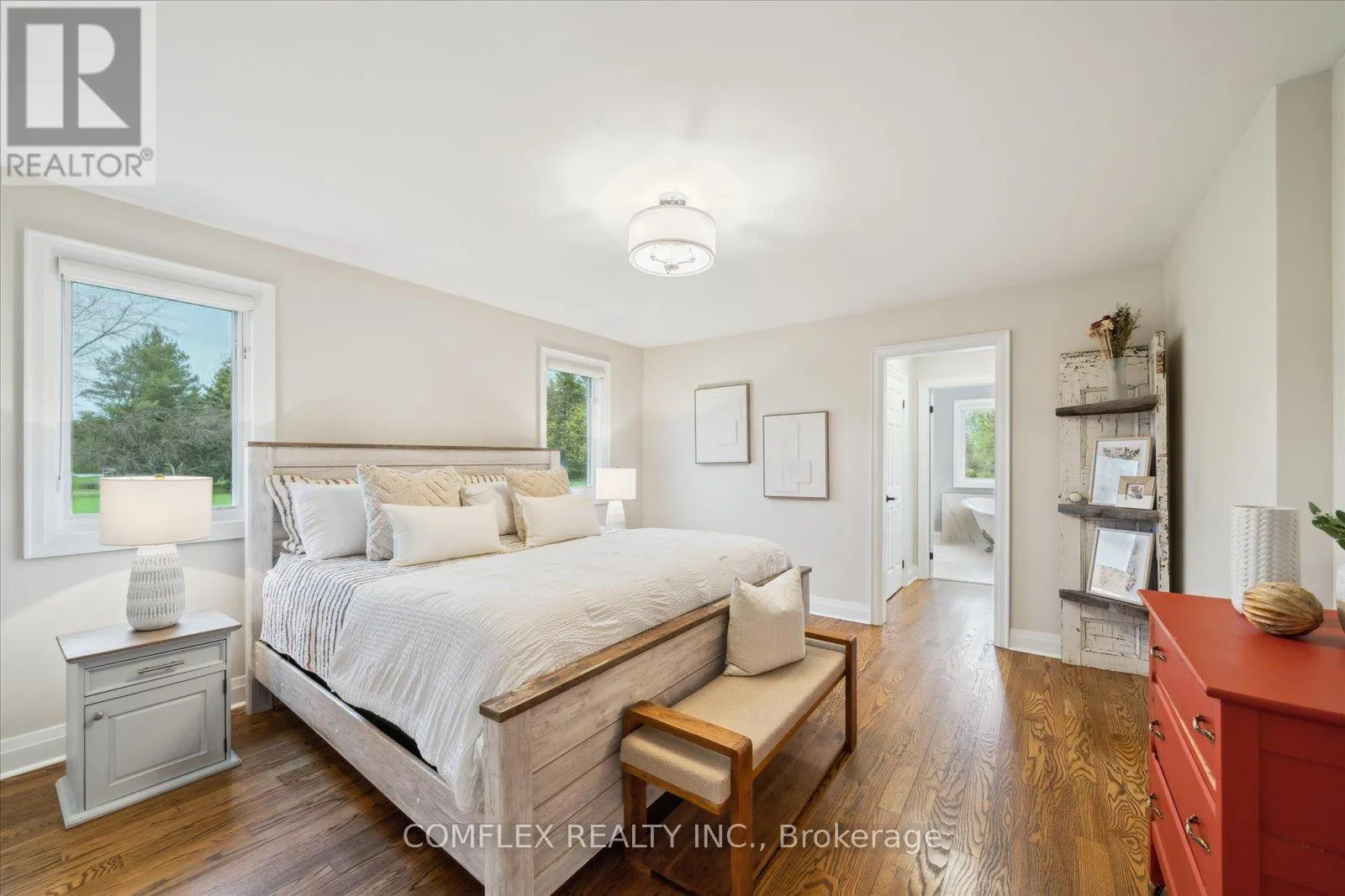 Cross Streets: On corner of Old Scugog Road and Taunus Court. First driveway on the left. ** Directions: Bowmanville Ave North, Left Onto Old Scugog Rd. Gorgeous Custom Bungaloft on 1.16 Acres in Prestigious Bowmanville Neighbourhood. Welcome to this exceptional, custom-built bungaloft, located on a court and serviced by natural gas. From the moment you arrive, the attention to detail is unmistakable. The exterior showcases timeless craftsmanship with custom stonework, copper accents, marble sills, and soaring rooflines that combine to create stunning curb appeal. Step inside to discover a bright and airy open-concept layout that perfectly balances elegance with comfort. The main living space features solid hardwood floors, recessed lighting, and a great room with cathedral ceiling and nat gas fireplace. The freshly renovated gourmet kitchen is a true centerpiece, complete with full-height glass cabinetry, Corian countertops, walk-in pantry, and stainless steel appliances. A sunny breakfast area opens to a charming sunroom, ideal for your morning coffee or a quiet retreat. Main floor also includes a beautifully updated laundry/mudroom and well-appointed bedrooms, each offering private or shared access to ensuite bathrooms for optimal convenience. Upstairs, the spacious loft is a standout feature, offering endless flexibility. With vaulted 10-foot ceilings, a skylight, gleaming hardwood floors, natural gas fireplace, and its own 3-piece ensuite. This large space is perfect as a family room, home office, or private in-law suite! Property offers ample space for children to play, room to build a shop or pool, gardening, or simply enjoying the outdoors. The covered patio provides a perfect spot for year-round entertaining. Freshly finished basement adds custom glass office, Wet bar, Engineered hardwood flooring, huge bedroom, and fitness space. Located just minutes from Bowmanville's vibrant urban center, two golf courses, and the Bowmanville Valley Conservation Area, this home offers the ideal balance of serenity and accessibility. Quick access to Highways 401 and 407/418. Roof 2018, Furnaces 2016, A/C 2019. (id:27476)