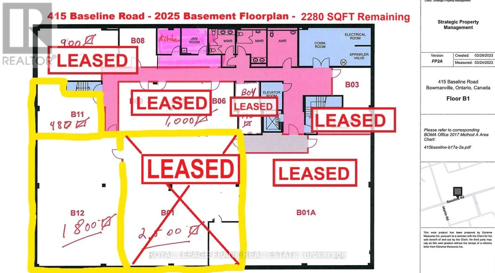 Cross Streets: Baseline Road / Martin Road. ** Directions: Basement Suites accessible via stairs or elevator. Located on South side of Baseline Road mins from Bowmanville Avenue HWY 401 Exit. Client RemarksVariety of exceptionally well maintained and renovated + accessible basement office suites at convenient 415 Baseline Rd. location in Bowmanville. Zoning supports both office and commercial uses for flexibility suitable for a variety of businesses. Common elevator + bathroms for Tenant convenience. Spacious parking lot + close to Hwy. 401. Affordable rent rate inclusive of utilities. Please see floorplan schedule for available suites, sizes and prices. Smallest available + B11 @ 490 sq. ft., largest + B01 @ 2,500 sq. ft. (id:27476)