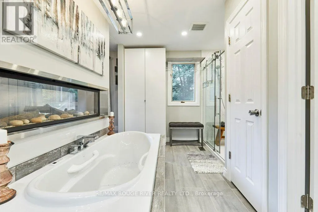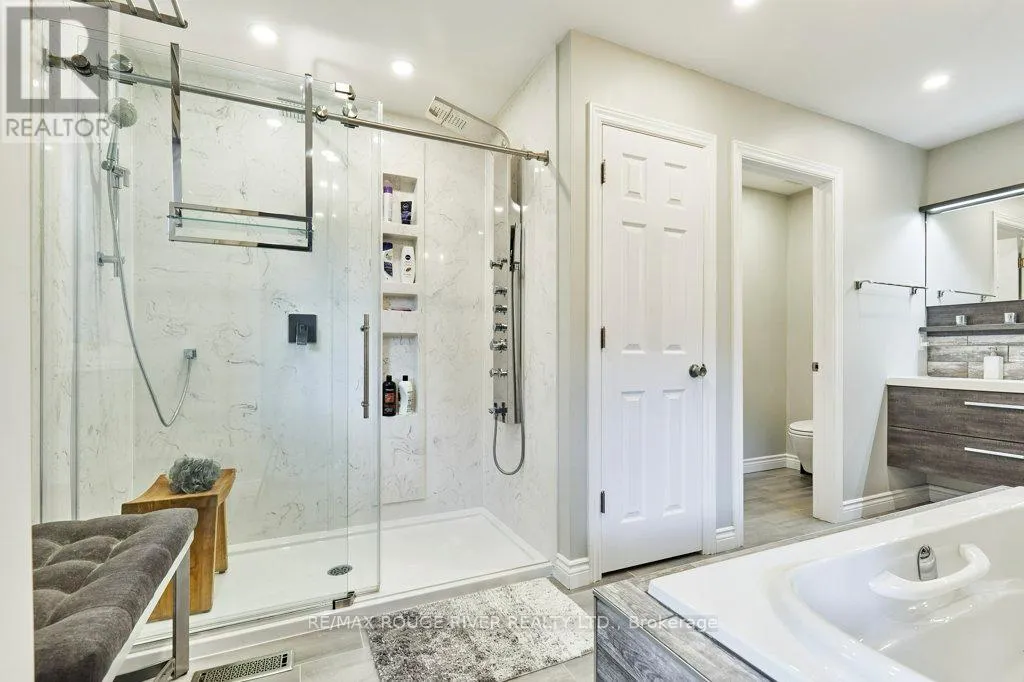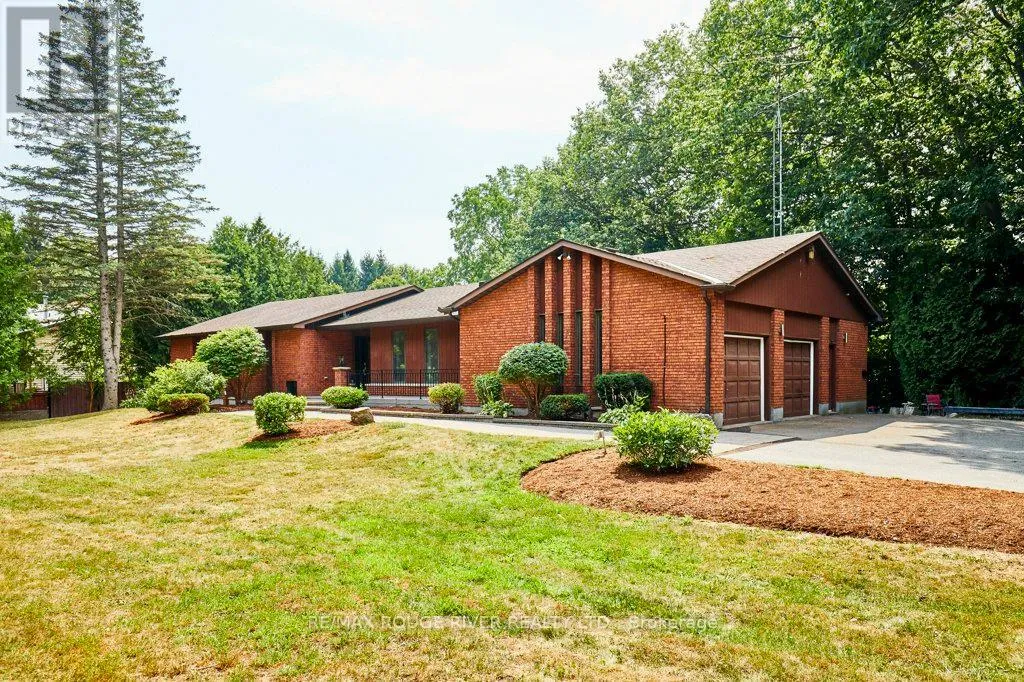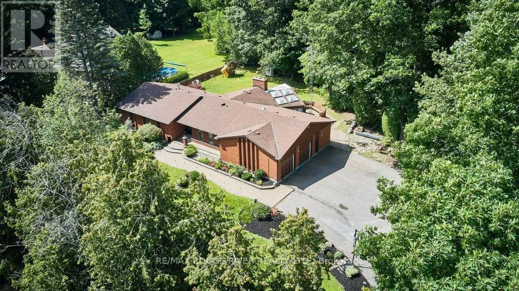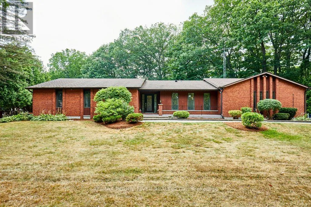 Cross Streets: King St (Hwy 2) and Townline. ** Directions: King St E to Varcoe; Varcoe north to Old Varcoe. A stunning oasis on 1.3 acres just steps from the Courtice retail & business corridor, backing on a beautiful, forested ravine. Spacious, custom built, brick bungalow with fully developed basement and almost 4500 sq ft of total living space. At the heart of the main floor is the open and expansive living room with vaulted ceilings and soaring gas fireplace, framed by oversize picture windows and the sunroom entry doors. The chef's kitchen overlooks the living room and features an impressive U-shaped island, European cabinets with granite counters, and premium appliances anchored by a JennAir 6-burner gas range. Meals are served either in the kitchen breakfast area (with its own built-in cabinets) or at the island counter; and, sometimes, in a private exquisite dining room, with room for everyone and bursting with character. A cosy family room overlooks the living room and there's also a huge pantry room adjacent to the kitchen with tons of built-in cabinets, shelves and drawers as well a contemporary upright freezer. The epic primary suite boasts a 5-piece ensuite bath, 2-sided gas fireplace and super-efficient PAX wardrobe systems. Walk out directly to the balcony, then down a few steps to the 8-seater Hydropool hot tub platform. Two more spacious bedrooms, full bath and a bright, airy sun room round out the main floor living space. The walkout basement has two sections: the south half is designed to complement the main floor space, with rec room/theatre, games room, exercise room with 3-piece bath, extra bedroom and office. The north half is a self-contained family suite with separate entrance, living room with fireplace, bedroom, kitchen, 3-piece bath and laundry. Oversize 2.5 garage with custom designer epoxy floor is nearly 600 sq ft with ample space for cars, toys and workshop or as a well-appointed man-cave. Exterior includes 10-car driveway; massive front verandah; storage building 10' by 20'; and a huge yard with gardens, walkways and tree buffers. (id:27476)