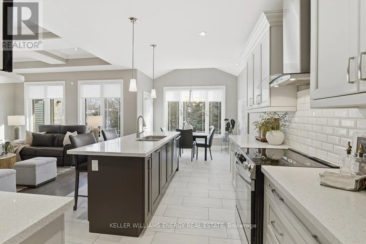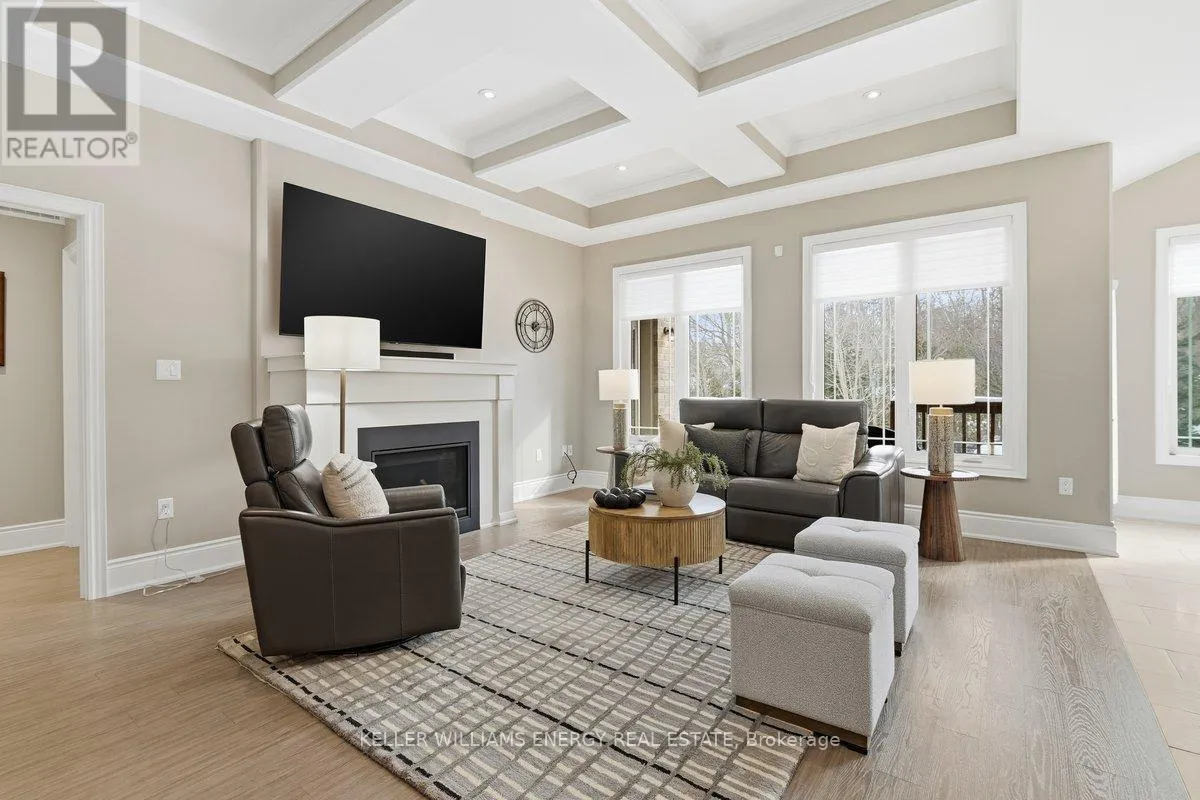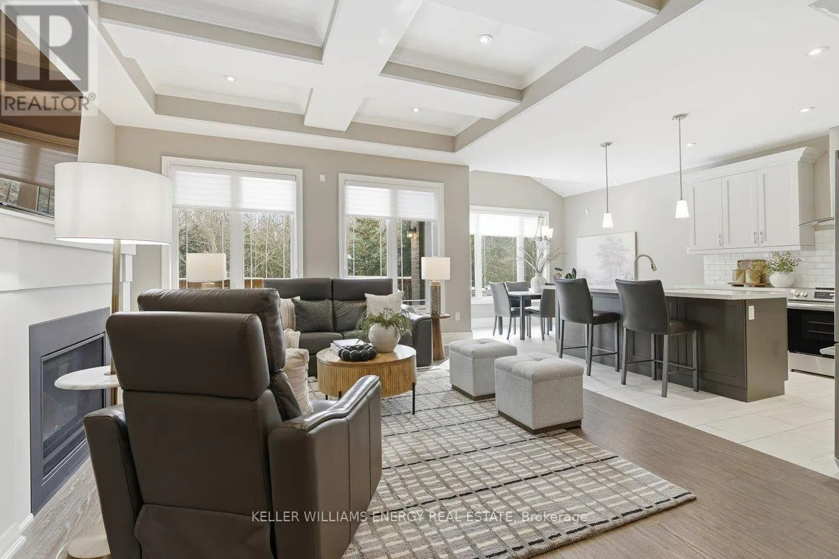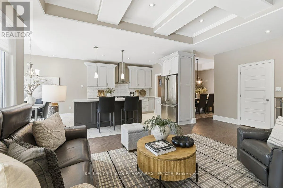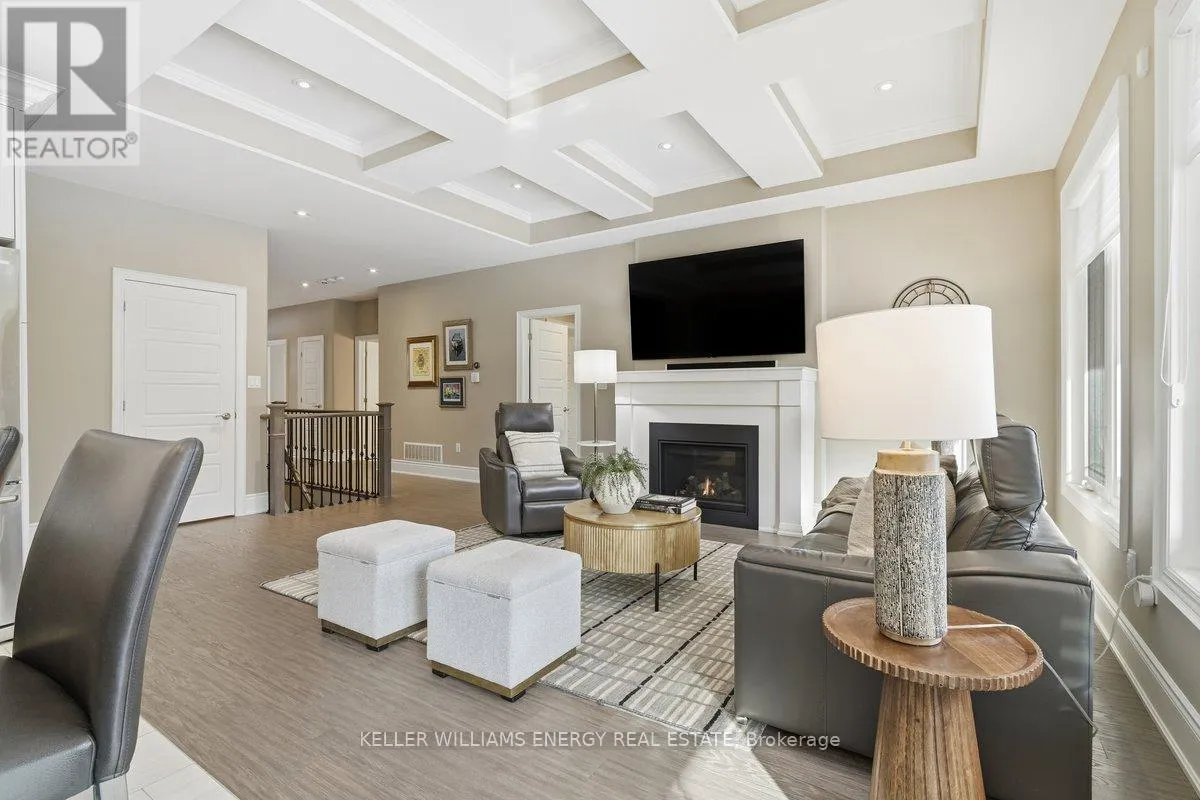 George Reynolds & Hancock Rd Holland Homes Custom luxury bungalow backing onto environmentally protected land. Wrapped in tumbled stone and brick with a dramatic high-pitched roofline, this rare offering delivers privacy, permanence, and peace. Over 90 builder upgrades in this Charnwood 50 model elevate every detail. You must see the pictures! Open-concept main level is finished in engineered hardwood, oversized baseboards, anchored by a great room with 9 foot coffered "waffle" ceilings, and a chef's kitchen with a statement island overlooking the fireplace. A sun-filled breakfast area walks out to a covered deck and fenced yard... no rear neighbours, no future development, just birds, trees, and sky. The primary retreat features a spa-inspired ensuite with heated floors, freestanding soaking tub and separate glass shower. A second bedroom enjoys its own private ensuite, ideal for guests or home office flexibility. Main-floor laundry allows true one-level living The finished lower level adds a half-bathroom and an oversized media lounge perfect for movie nights, games, or visiting family. The unfinished area offers storage and opportunity to add your own custom rooms Quietly positioned on the east end of George Reynolds Drive, this low-traffic setting offers a country feel while being surrounded by green space. This is downsizing and upgrading at the same time! (id:27476)