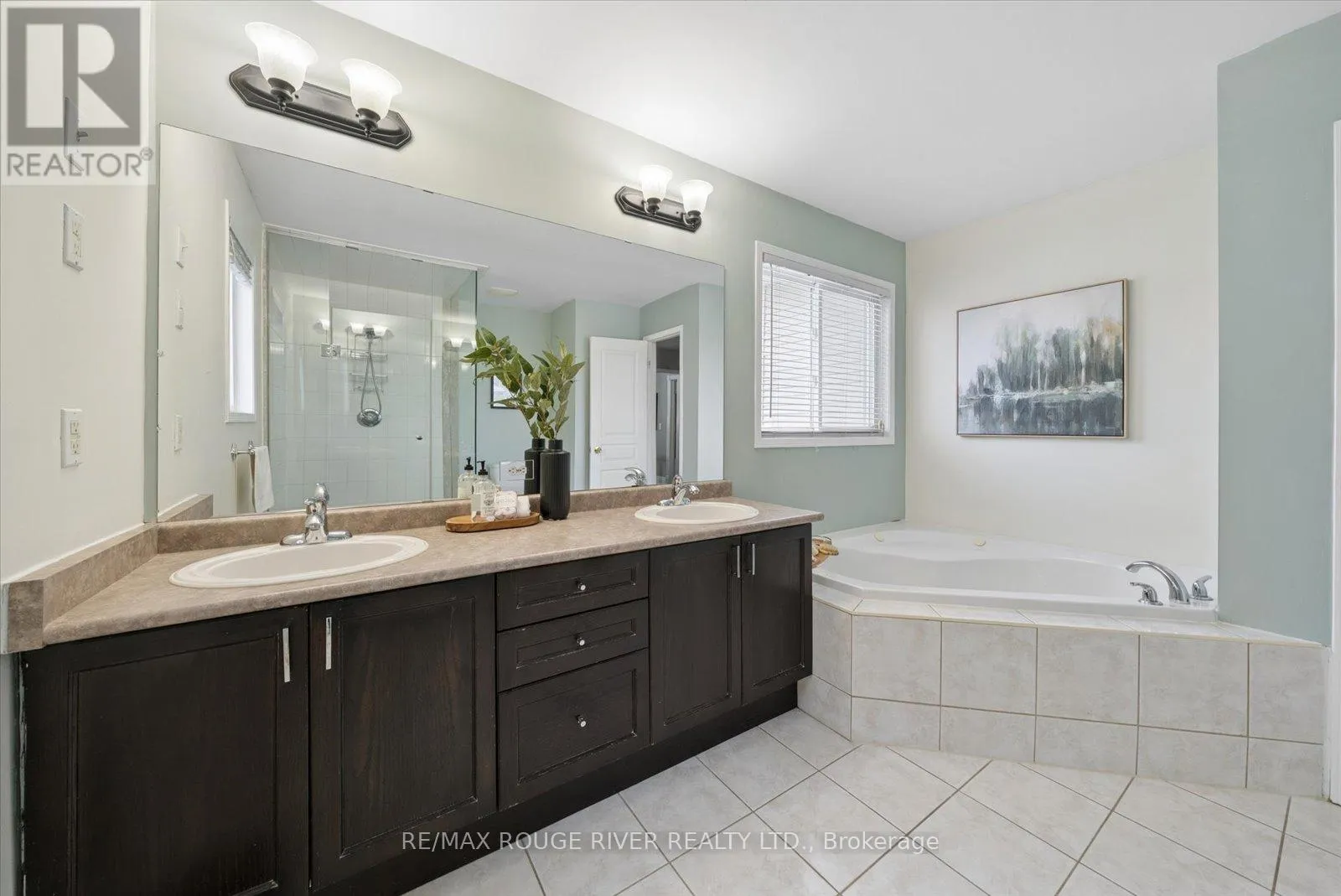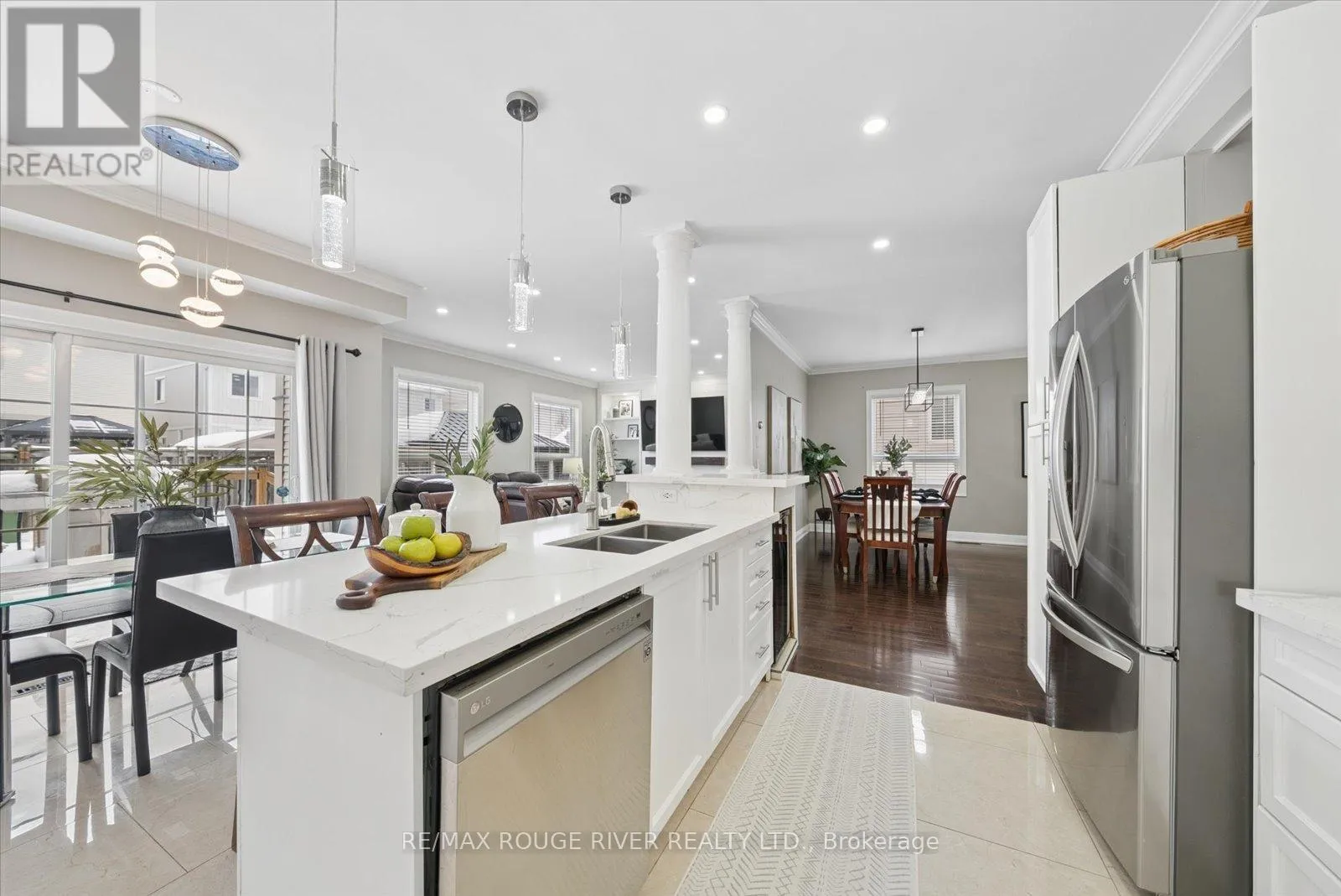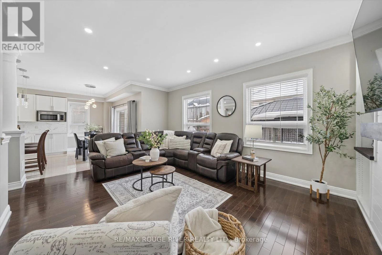 Bons & Liberty Welcome to Liberty Crossings, one of North Bowmanville's desired family neighbourhoods. This impressive 5-bedroom, 3-bathroom residence offers 2,721 sq. ft. of meticulously maintained living space designed for comfort, functionality, and style. The main floor features a bright, spacious front foyer, 9-ft ceilings, pot lights, and rich hardwood flooring throughout. A main floor laundry room with direct garage access adds everyday convenience. The upgraded eat-in kitchen is the heart of the home, complete with quartz countertops, upgraded stainless-steel appliances, tons of cabinetry, flowing seamlessly into the inviting family room. Here, a gas fireplace with custom built-in cabinetry creates the perfect atmosphere for both relaxation and entertaining. The upper level showcases five generously sized bedrooms, ideal for growing families or those needing extra office or guest space. The primary retreat offers a quiet escape, featuring a large walk-in closet and a spacious 5-piece ensuite. The beautifully renovated second bathroom includes double sinks and a modern glass shower, providing both luxury and practicality for busy mornings. An additional bedroom with its own private balcony adds a rare and charming architectural touch. The double car garage offers excellent storage capabilities, making this home as functional as it is elegant. Perfectly situated within walking distance to schools, parks, shopping, dining, and essential amenities, with everything conveniently located within 1 km. This is a prime opportunity to secure a spacious family home in a highly sought-after community. (id:27476)
