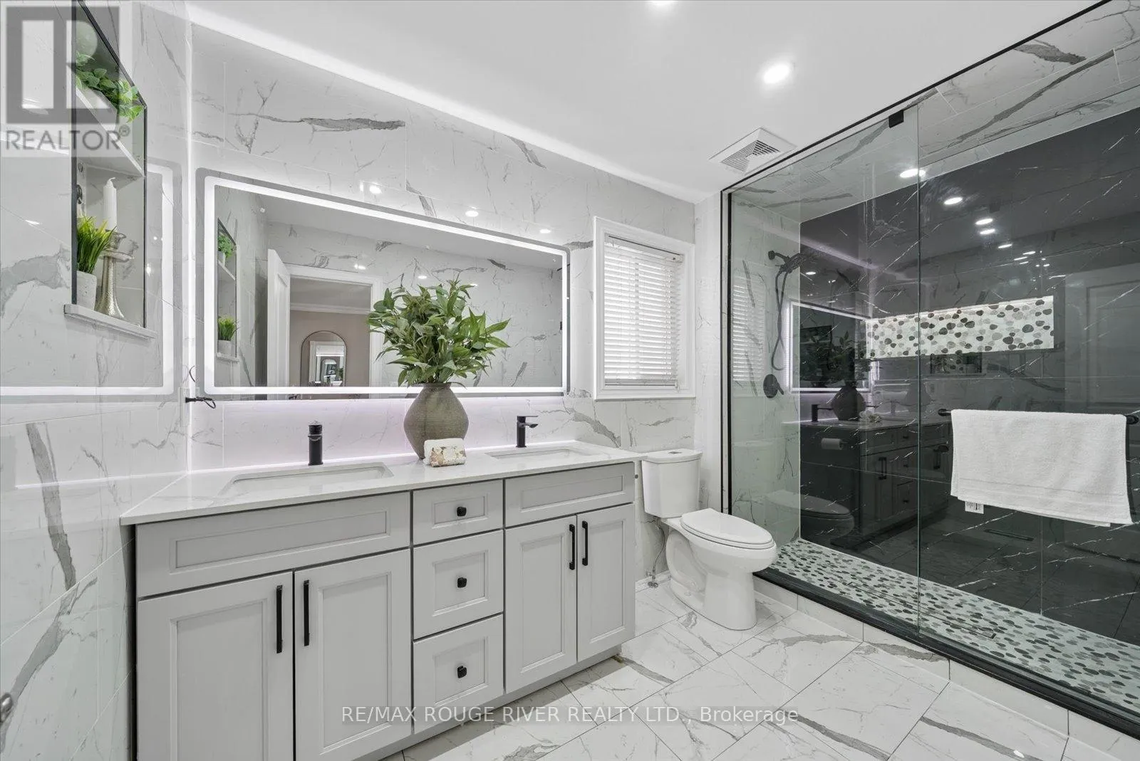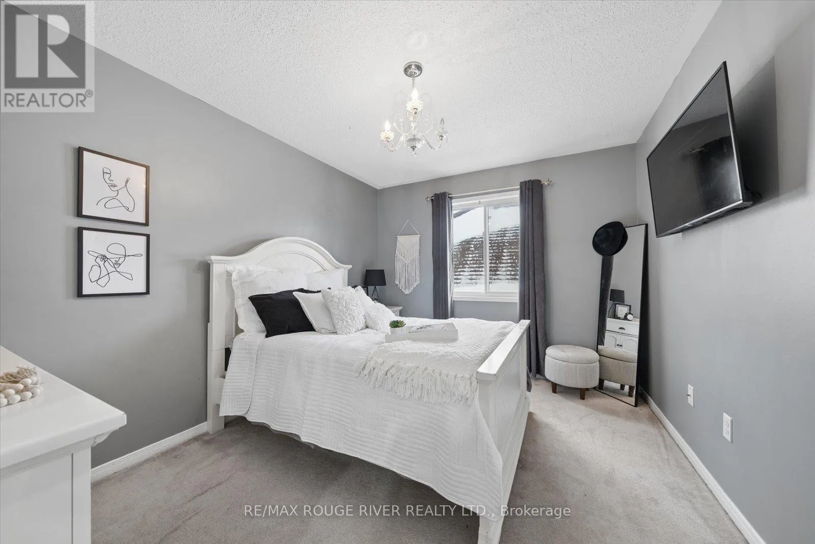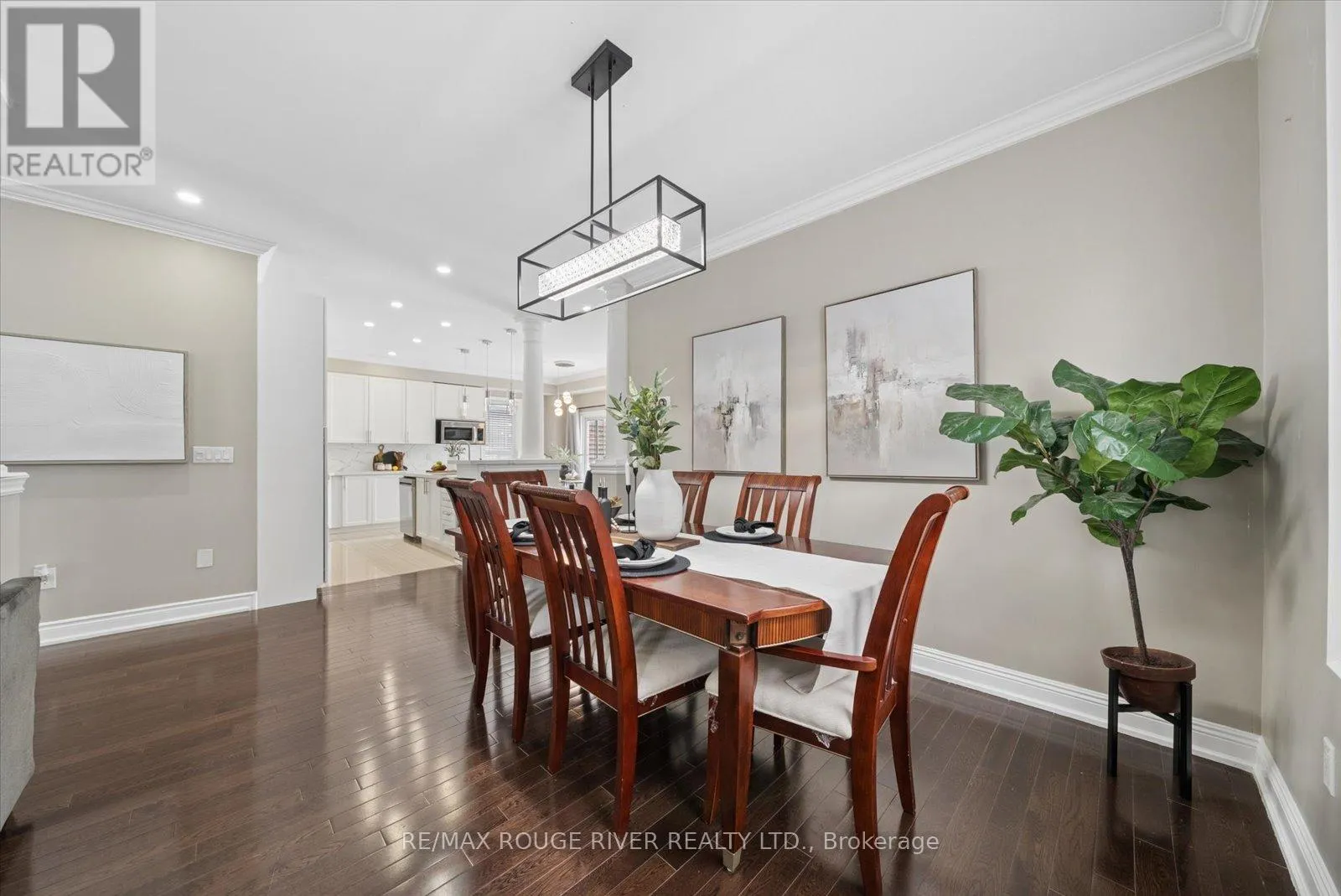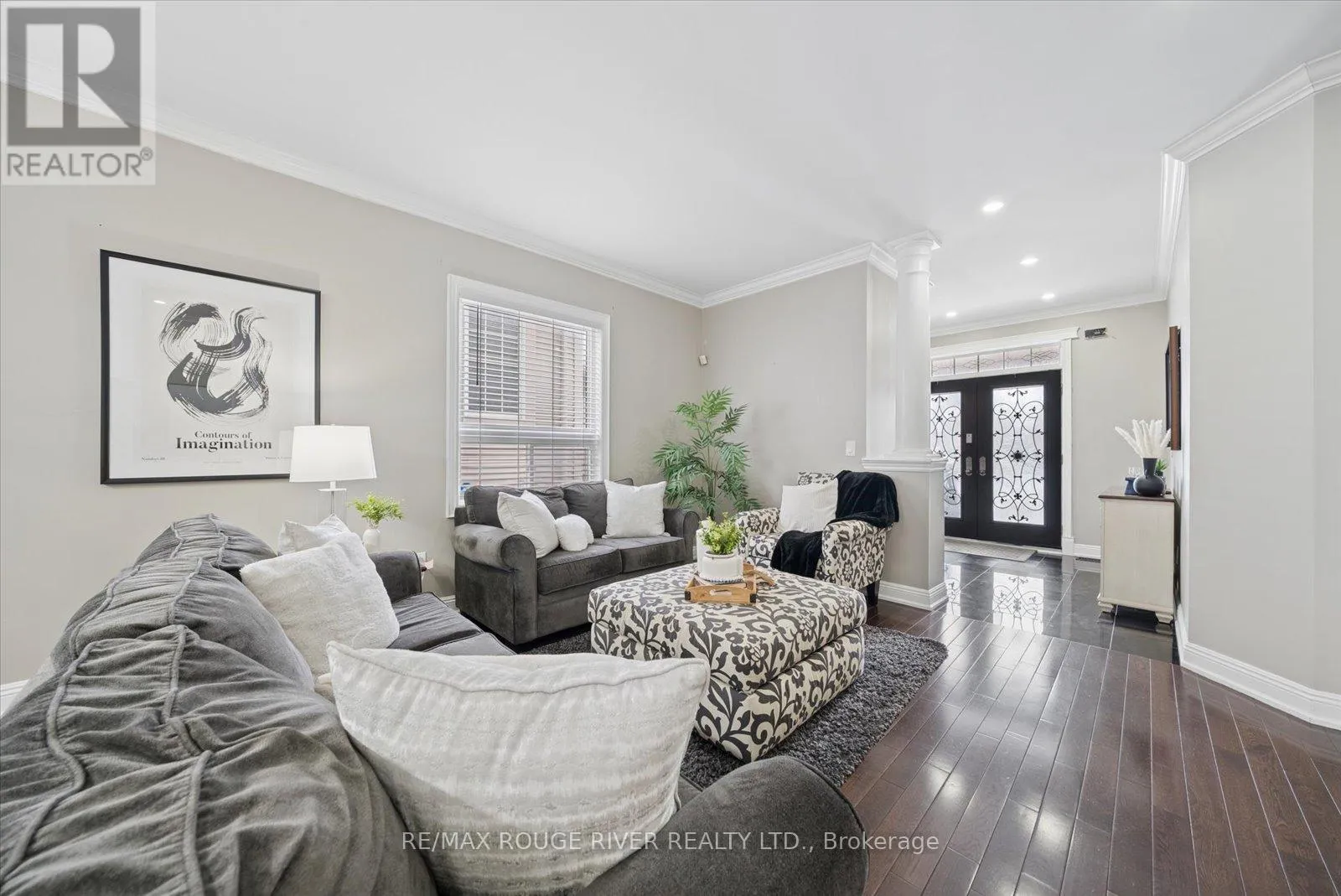 Bons & Liberty Welcome to Liberty Crossings, one of North Bowmanville's desired family neighbourhoods. This impressive 5-bedroom, 3-bathroom residence offers 2,721 sq. ft. of meticulously maintained living space designed for comfort, functionality, and style. The main floor features a bright, spacious front foyer, 9-ft ceilings, pot lights, and rich hardwood flooring throughout. A main floor laundry room with direct garage access adds everyday convenience. The upgraded eat-in kitchen is the heart of the home, complete with quartz countertops, upgraded stainless-steel appliances, tons of cabinetry, flowing seamlessly into the inviting family room. Here, a gas fireplace with custom built-in cabinetry creates the perfect atmosphere for both relaxation and entertaining. The upper level showcases five generously sized bedrooms, ideal for growing families or those needing extra office or guest space. The primary retreat offers a quiet escape, featuring a large walk-in closet and a spacious 5-piece ensuite. The beautifully renovated second bathroom includes double sinks and a modern glass shower, providing both luxury and practicality for busy mornings. An additional bedroom with its own private balcony adds a rare and charming architectural touch. The double car garage offers excellent storage capabilities, making this home as functional as it is elegant. Perfectly situated within walking distance to schools, parks, shopping, dining, and essential amenities, with everything conveniently located within 1 km. This is a prime opportunity to secure a spacious family home in a highly sought-after community. (id:27476)