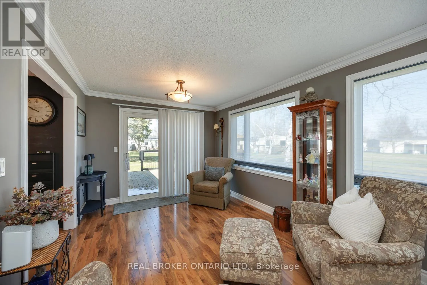 Cross Streets: Wilmot Trail/Driftwood Ln. ** Directions: Exit 401 at Bennett Rd and head south. Turn east onto Wilmot Creek Dr. Follow to Wilmot Trail and turn east on Wilmot Trail. Turn south on Driftwood. Turn east onto Champlain. Discover effortless, main-floor living in this charming, two-bedroom bungalow, tucked away at the end of a quiet court in a highly sought-after adult lifestyle community. Set along the scenic shores of Lake Ontario, Wilmot Creek offers an unmatched array of amenities including a golf course, pool, pickleball and tennis courts, recreation centre, walking trails, garden club, lawn bowling, dog run, and so much more-an ideal setting for an active and social lifestyle. Step into a warm and inviting foyer featuring hardwood flooring, crown moulding, and a convenient closet. The spacious living room showcases a bay window, crown moulding and hardwood floors, creating an inviting space to relax. A separate family room offers even more room to unwind. With two picture windows and a walk-out to the deck, the space is filled with natural light and and offers an easy transition to outdoor living. The open-concept kitchen is both stylish and functional, with granite counters, tile backsplash, a centre island with breakfast bar, ample cabinetry, and a window over the sink. The adjoining dining room provides the perfect setting for hosting family and friends. Two comfortable bedrooms include a lovely primary suite featuring a walk-in closet and a 3-piece ensuite with a walk-in shower. Outside, enjoy peaceful mornings on the deck, where you can sip your coffee and listen to the birds in the surrounding trees. Move in and immediately start enjoying the incredible lifestyle that Wilmot Creek offers. Monthly fees includes snow removal, and full access to all community amenities. (id:27476)
