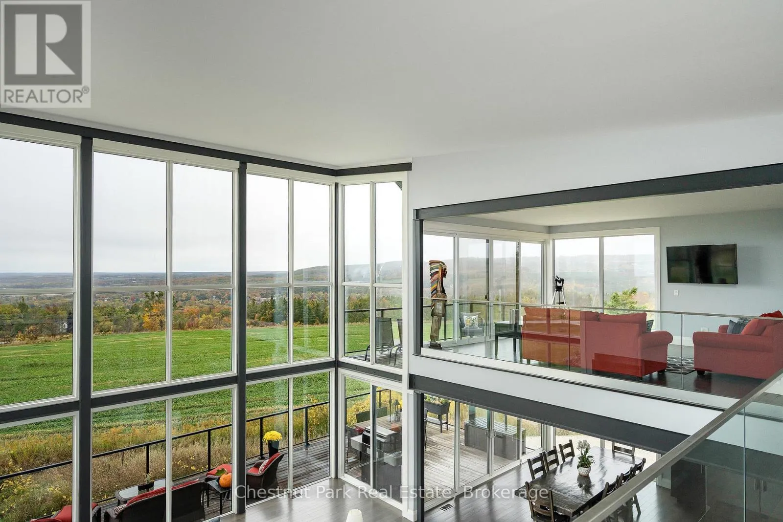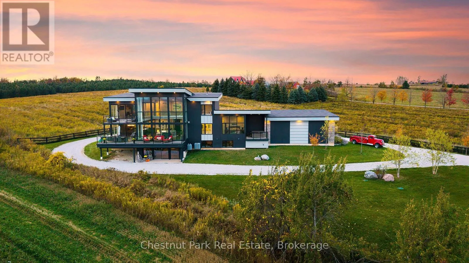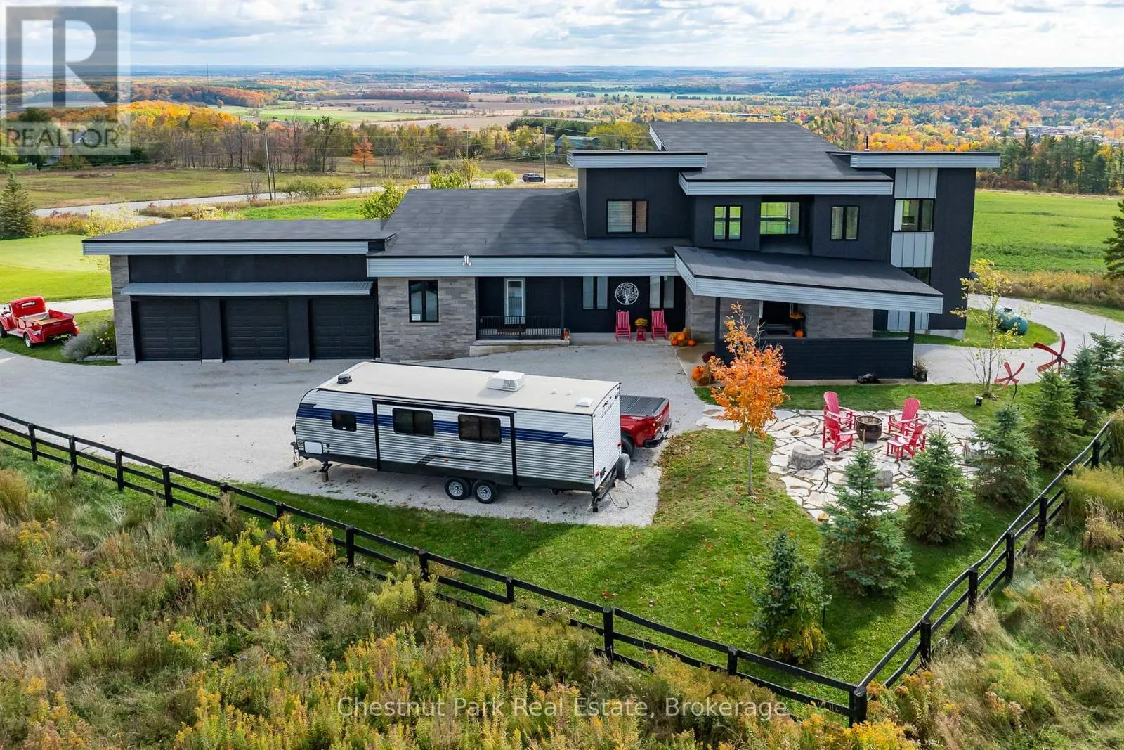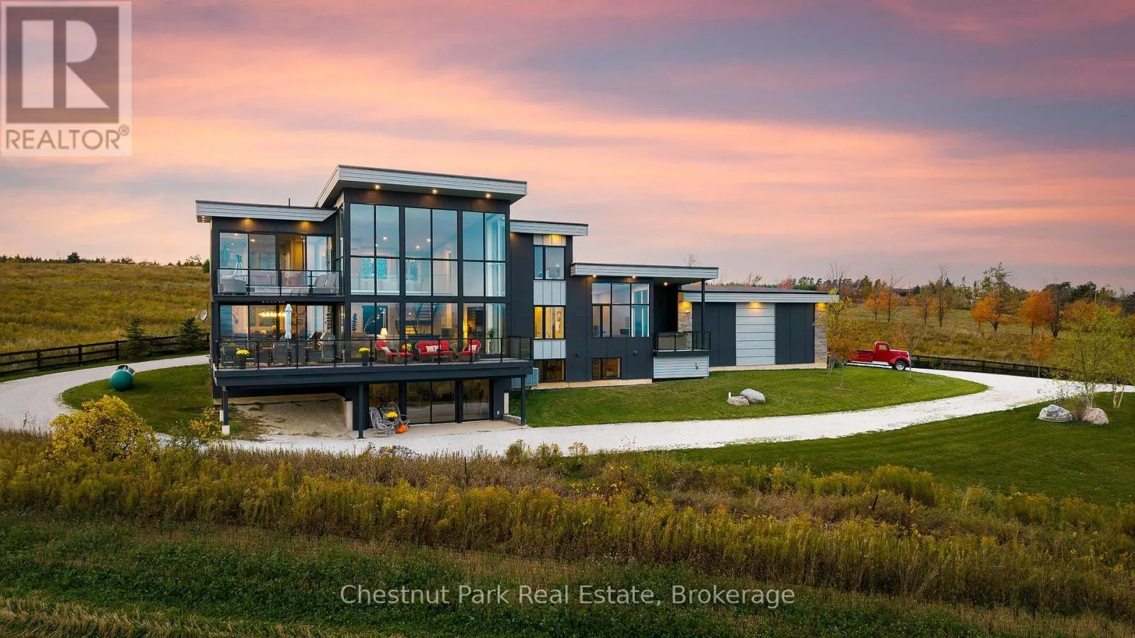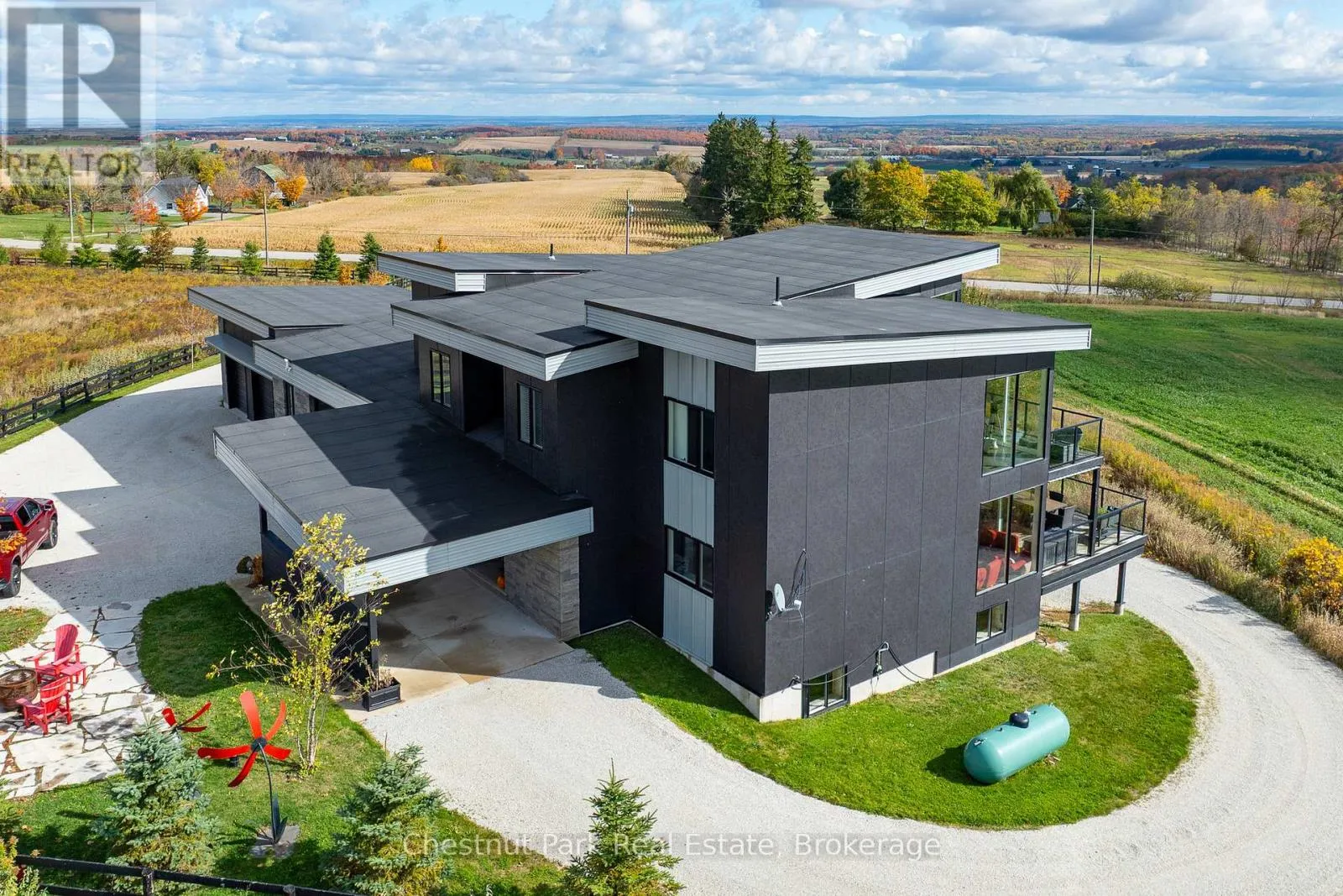 Cross Streets: Fairgrounds Road and SR 12/13. ** Directions: Fairgrounds Road north from Creemore to #2642. Architectural glass, steel, and panoramic views define this modern masterpiece overlooking the village of Creemore. Built in 2019 and set on 1.4 acres, this 4-bedroom, 3-bath home offers approximately 4,000 sq. ft. of finished living space with 180-degree vistas over the Creemore Hills, reaching to Alliston and Barrie. The striking design features steel beams, opposing rooflines, and floor-to-ceiling Dashwood windows that flood the interiors with light and frame the valley's ever-changing skies-from golden sunsets to the incredible canopy of stars above. Elevated above the village and free from city glow, this is a stargazer's dream home, where the night sky feels within reach through expansive glass walls. The chef's kitchen includes Cabneato custom cabinetry, quartz countertops, a 6'x10' wormy maple island, KitchenAid double ovens, 5-burner cooktop, and a 54" Frigidaire Professional fridge/freezer. A butler's pantry adds additional prep and storage space. Dark maple hardwood floors, designer lighting, and heated tile baths bring warmth to the modern aesthetic. The insulated, metal-lined four-car garage with gas heat, insulated doors, and hot/cold water is ideal for collectors. Durable Hardie board exterior and a solid drilled well ensure low-maintenance, worry-free living. Importantly, both this property and the adjacent 1.82-acre lot (available separately) are not subject to NEC or NVCA regulation, allowing for future additions like a pool, tennis court, or guest house with far fewer approvals required. Just minutes from Creemore's shops and restaurants, and 15 minutes to Collingwood, Devil's Glen, and Mad River Golf Club. A rare combination of architecture, freedom, and breathtaking views. (id:27476)