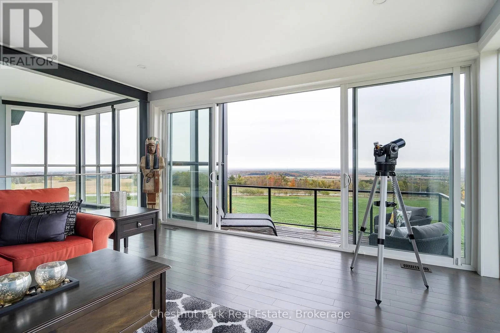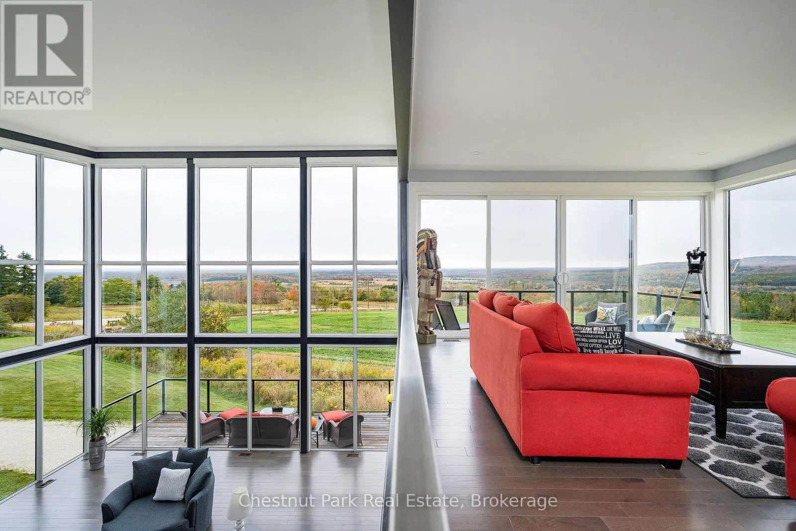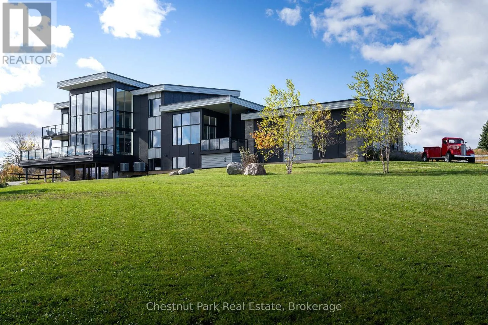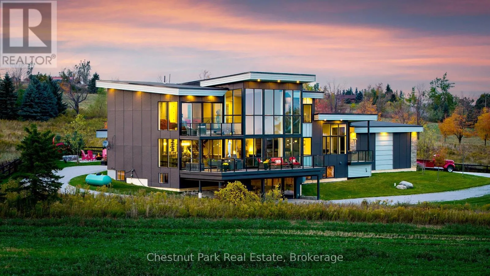 Cross Streets: Fairgrounds Road and SR 12/13. ** Directions: Fairgrounds Road north from Creemore to #2642. Architectural glass, steel, and panoramic views define this modern masterpiece overlooking the village of Creemore. Built in 2019 and set on 1.4 acres, this 4-bedroom, 3-bath home offers approximately 4,000 sq. ft. of finished living space with 180-degree vistas over the Creemore Hills, reaching to Alliston and Barrie. The striking design features steel beams, opposing rooflines, and floor-to-ceiling Dashwood windows that flood the interiors with light and frame the valley's ever-changing skies-from golden sunsets to the incredible canopy of stars above. Elevated above the village and free from city glow, this is a stargazer's dream home, where the night sky feels within reach through expansive glass walls. The chef's kitchen includes Cabneato custom cabinetry, quartz countertops, a 6'x10' wormy maple island, KitchenAid double ovens, 5-burner cooktop, and a 54" Frigidaire Professional fridge/freezer. A butler's pantry adds additional prep and storage space. Dark maple hardwood floors, designer lighting, and heated tile baths bring warmth to the modern aesthetic. The insulated, metal-lined four-car garage with gas heat, insulated doors, and hot/cold water is ideal for collectors. Durable Hardie board exterior and a solid drilled well ensure low-maintenance, worry-free living. Importantly, both this property and the adjacent 1.82-acre lot (available separately) are not subject to NEC or NVCA regulation, allowing for future additions like a pool, tennis court, or guest house with far fewer approvals required. Just minutes from Creemore's shops and restaurants, and 15 minutes to Collingwood, Devil's Glen, and Mad River Golf Club. A rare combination of architecture, freedom, and breathtaking views. (id:27476)