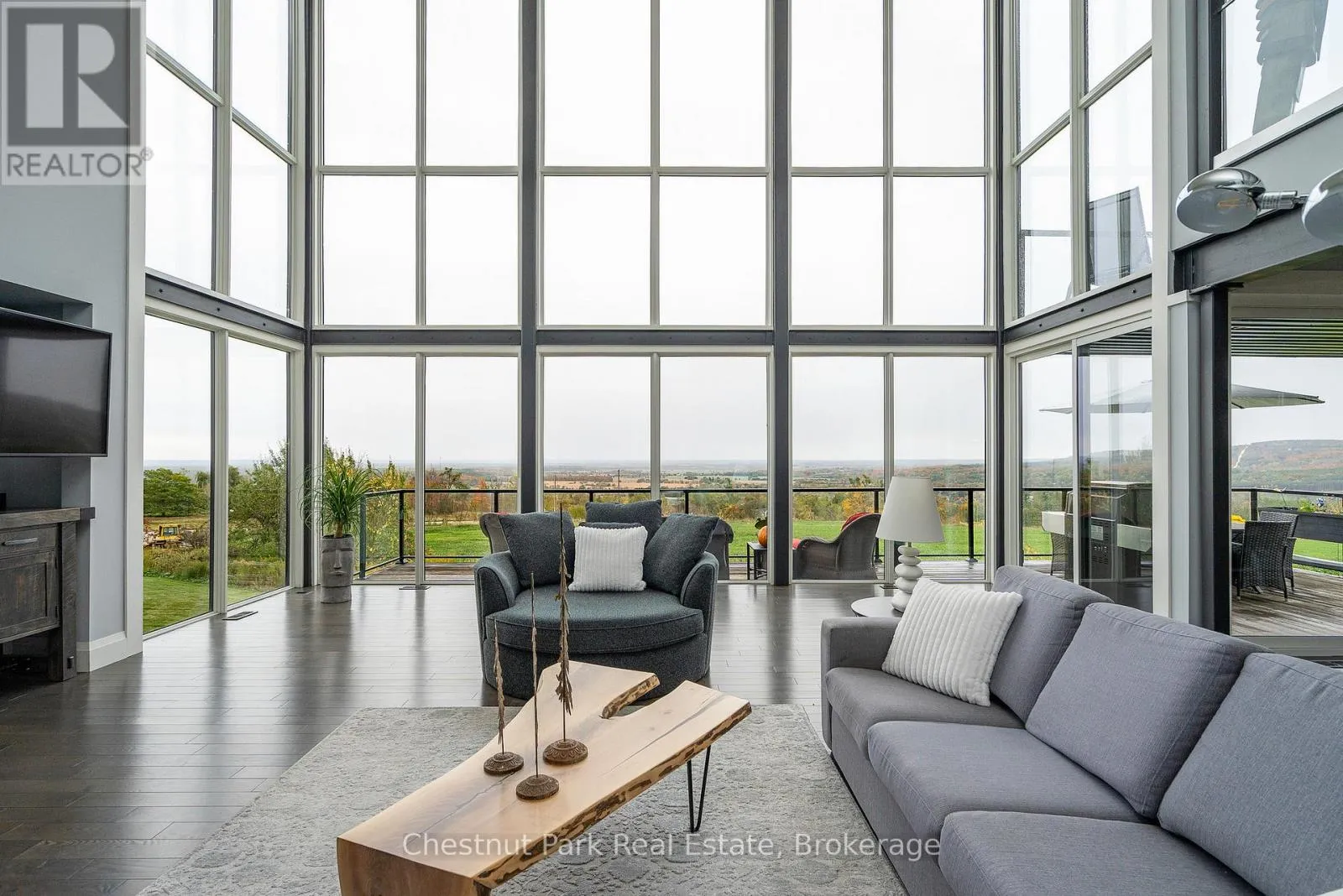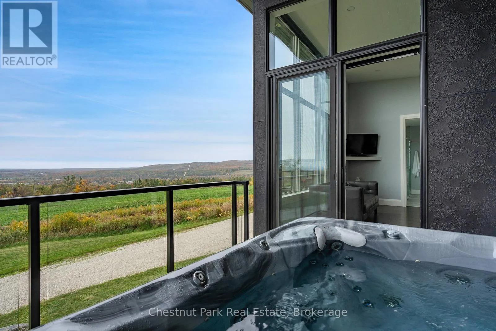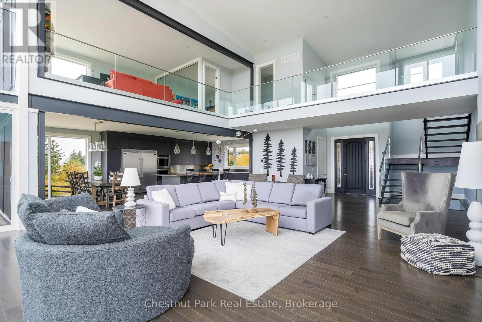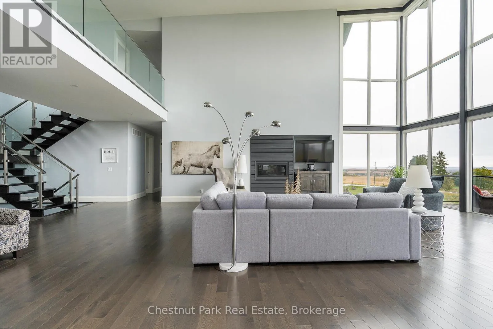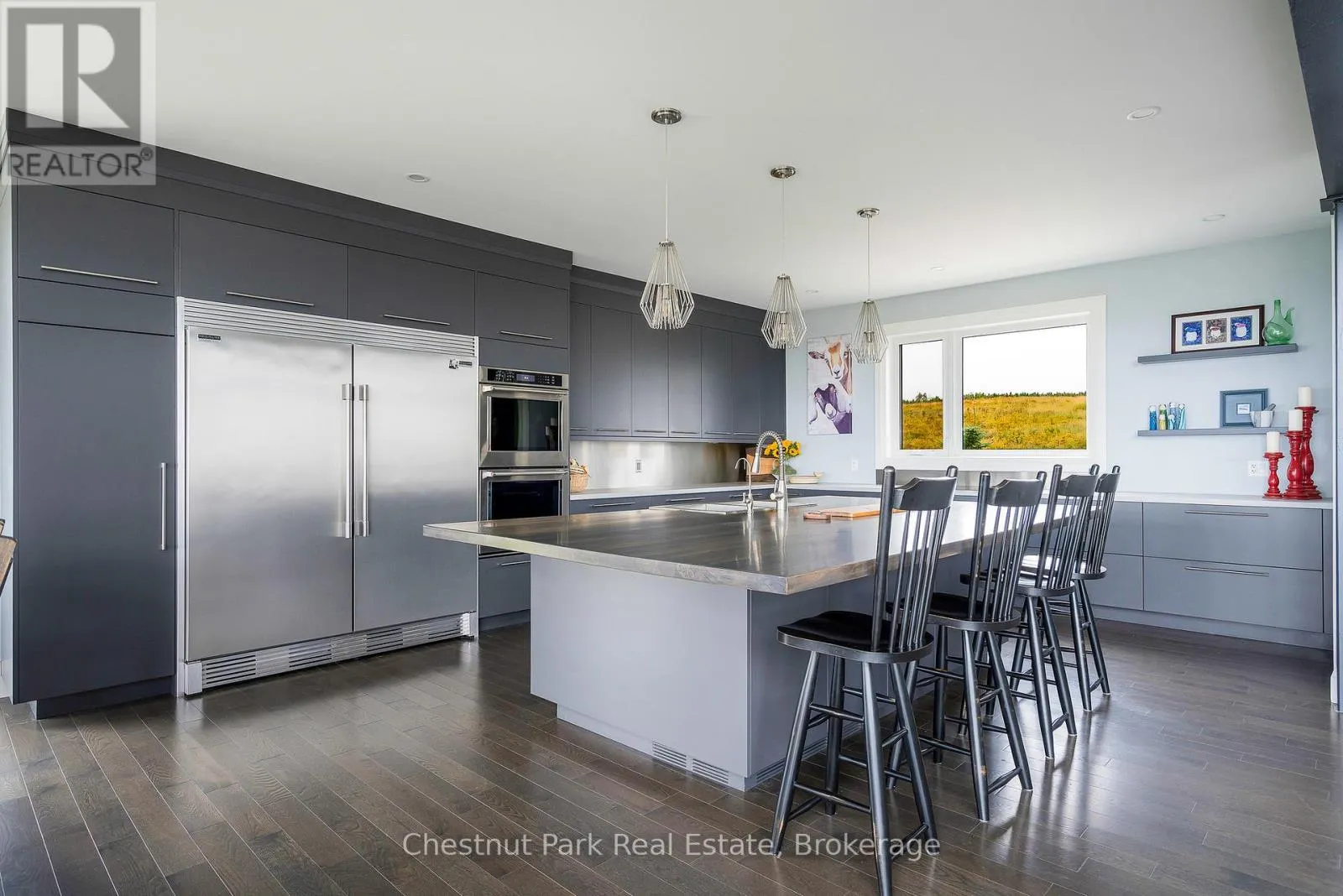 Cross Streets: Fairgrounds Road and SR 12/13. ** Directions: Fairgrounds Road north from Creemore to #2642. Architectural glass, steel, and panoramic views define this modern masterpiece overlooking the village of Creemore. Built in 2019 and set on 1.4 acres, this 4-bedroom, 3-bath home offers approximately 4,000 sq. ft. of finished living space with 180-degree vistas over the Creemore Hills, reaching to Alliston and Barrie. The striking design features steel beams, opposing rooflines, and floor-to-ceiling Dashwood windows that flood the interiors with light and frame the valley's ever-changing skies-from golden sunsets to the incredible canopy of stars above. Elevated above the village and free from city glow, this is a stargazer's dream home, where the night sky feels within reach through expansive glass walls. The chef's kitchen includes Cabneato custom cabinetry, quartz countertops, a 6'x10' wormy maple island, KitchenAid double ovens, 5-burner cooktop, and a 54" Frigidaire Professional fridge/freezer. A butler's pantry adds additional prep and storage space. Dark maple hardwood floors, designer lighting, and heated tile baths bring warmth to the modern aesthetic. The insulated, metal-lined four-car garage with gas heat, insulated doors, and hot/cold water is ideal for collectors. Durable Hardie board exterior and a solid drilled well ensure low-maintenance, worry-free living. Importantly, both this property and the adjacent 1.82-acre lot (available separately) are not subject to NEC or NVCA regulation, allowing for future additions like a pool, tennis court, or guest house with far fewer approvals required. Just minutes from Creemore's shops and restaurants, and 15 minutes to Collingwood, Devil's Glen, and Mad River Golf Club. A rare combination of architecture, freedom, and breathtaking views. (id:27476)