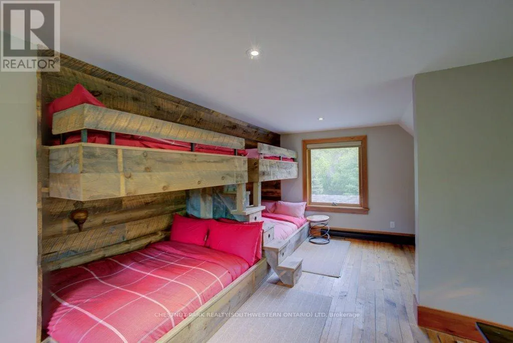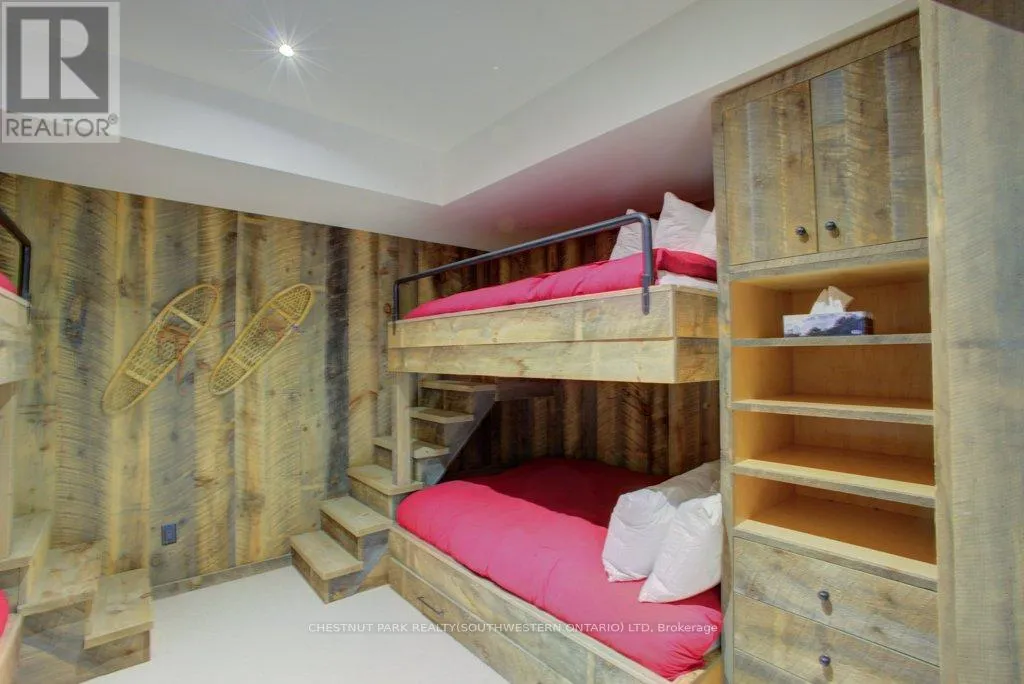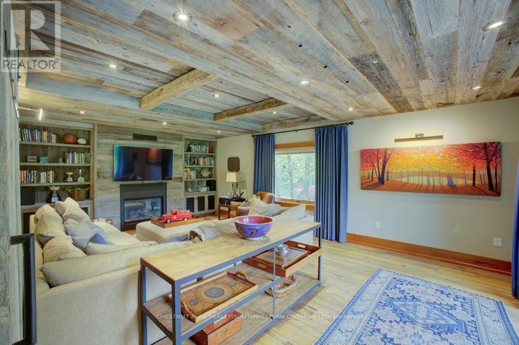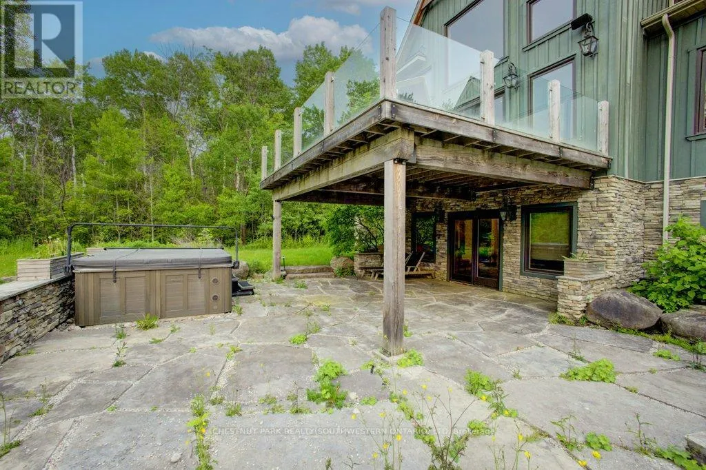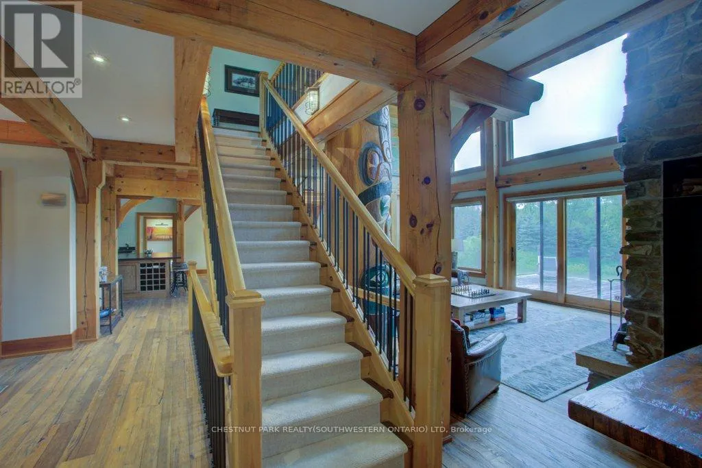 Cross Streets: Between Collingwood Clearview Townline and Concession 10 N Nottawasaga. ** Directions: Down the road from Osler Bluff Ski Club. Welcome to The Great Totem House, a stunning reclaimed timber frame chalet set on a private 1.3-acre forested lot, just minutes from Osler Bluff Ski Club, downtown Collingwood, golf, trails, and more. Step inside to discover over 5,000 sq. ft. of beautifully appointed living space. The Great Room features soaring ceilings, a floor-to-ceiling stone fireplace, and the captivating totem pole as its centerpiece. A chef's kitchen awaits, with rare stone countertops, professional-grade appliances, and seating for 16 in the elegant dining area-ideal for hosting après-ski dinners or summer gatherings. The home offers 6 spacious bedrooms and 5 luxurious bathrooms, including a main-floor primary suite with a spa-like ensuite, walk-in closet, and access to the expansive deck with oversized hot tub. The loft level includes an open lounge/TV space, home office, and three additional bedrooms, each with stunning treetop views. Entertain effortlessly on the flagstone patio, upper deck with fire table, or around the custom fire pit tucked into the landscaped gardens. Stone stairways, Douglas Fir pergolas, and multiple seating areas make this property as inviting outside as it is inside. The lower walkout level offers a spacious recreation room with wet bar, a media room, and ample space for a games area or home theatre. Two additional bedrooms complete the lower level, offering generous accommodations for family and guests. Modern comforts include geothermal heating & cooling, radiant in-floor heating, and a mudroom with five custom locker-style cubbies-ideal for active families and winter gear. Professionally designed award-winning landscaping completes this rare offering. Whether you're enjoying ski season, exploring hiking and biking trails, or relaxing with a coffee on the covered peace, privacy, and prestige. (id:27476)