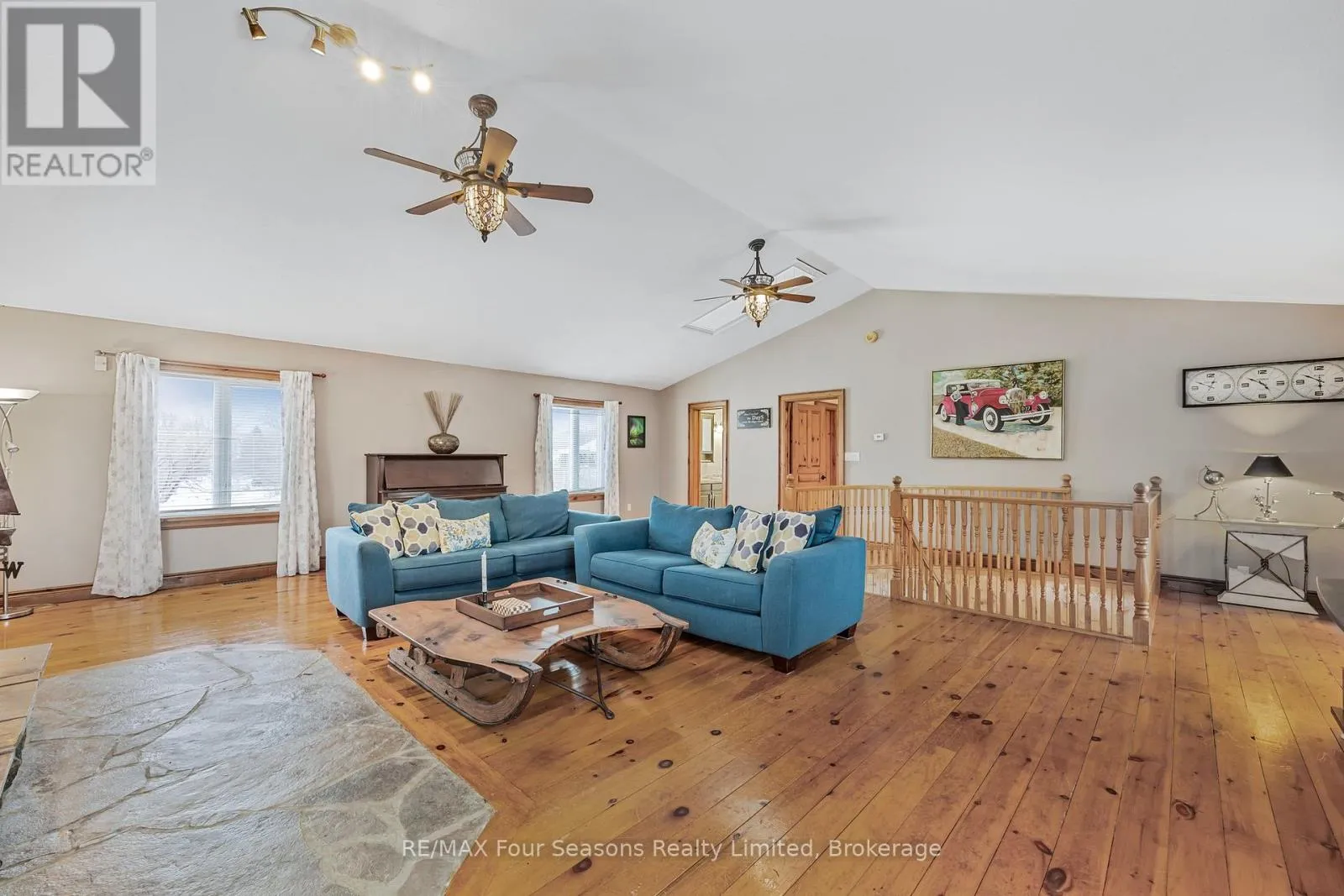 Cross Streets: County Road 124. ** Directions: County Road 124 south to Duntroon, East on Sydenham Trail. AFFORDABLE meets charming and spacious in Clearview! In the serene hamlet of Duntroon, this beautifully maintained two-storey home exudes warmth, and character. From the moment you step into the spacious main foyer, you're greeted by a dramatic sweeping staircase that leads to an impressive great room ~featuring soaring cathedral ceilings, gleaming pine floors, a cozy propane fireplace, and expansive windows that flood the space with natural light and frame breathtaking countryside views. On clear days, you can see all the way to the Bay from the walkout balcony. Upstairs, the private primary suite offers a peaceful retreat with a semi-ensuite bath and refined finishes. The main floor showcases an open-concept kitchen and dining area, seamlessly connecting to a self-contained suite ~ ideal for guests or in-law accommodation. This suite includes a bedroom, a versatile den or office (easily converted into a second bedroom), a full 4-piece bathroom, its own kitchen, and a welcoming family room with a propane fireplace and dual private entrances. The finished lower level expands your living space with a flexible recreation area that combines bedroom and office zones, a 3-piece bathroom, and a bonus room perfect for a den, studio, or home office. You'll also find a well-equipped laundry/utility room, a cold room, and convenient under-stair storage. This home offers generous space and versatility for a growing family or multi-generational living. Upgrades include an interlocking steel roof, newer windows, central air conditioning. An attached garage doubles as a workshop. All this, just minutes from Devils Glen, private ski clubs, golf courses, scenic trails, and cross-country skiing. Whether you're seeking tranquility or adventure, this property delivers the lifestyle you deserve. (id:27476)