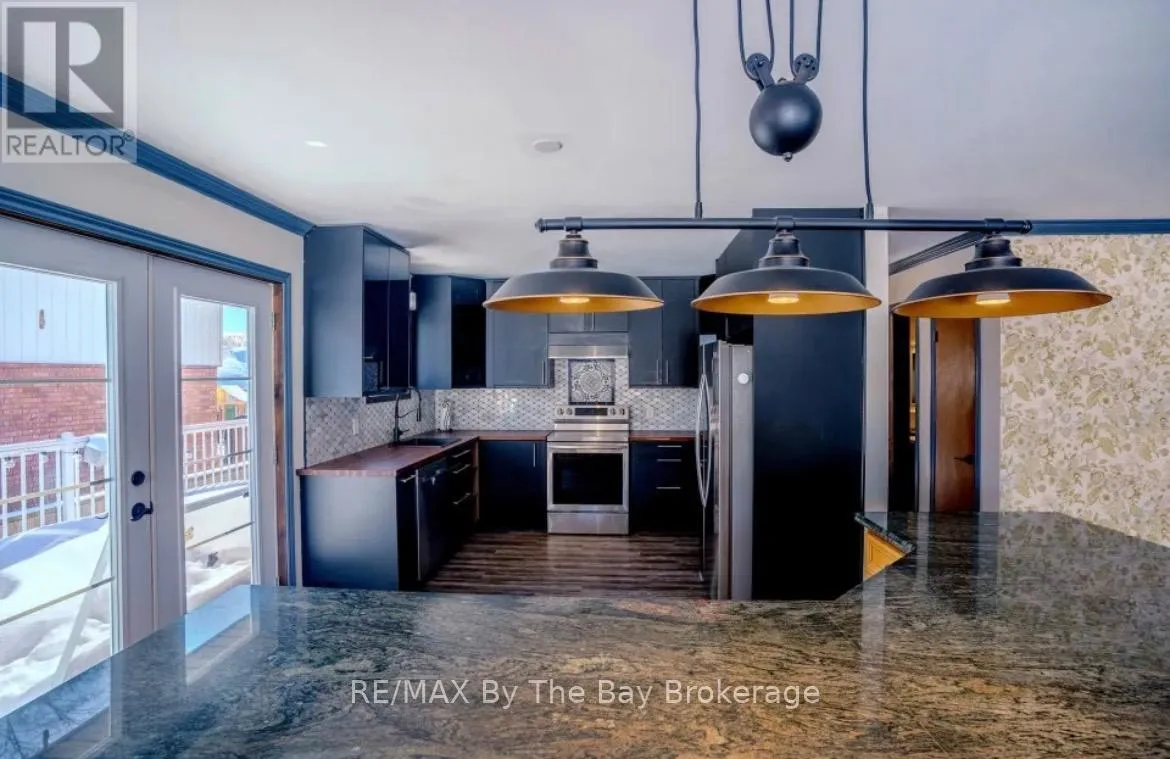 Cross Streets: Highway 26 and Dominion Drive. ** Directions: Turn off Highway 26 north onto Dominion drive.Continue to the stop sign at the end of the street and turn left on Simcoe. second driveway on the left. Welcome to 247 Simcoe Street - a beautiful raised bungalow located in a quiet, safe, and well-established neighbourhood just off the main road for easy access. Close to schools and local amenities, this home offers both convenience and community charm. With an updated kitchen, Heated floors in select areas of the home and a gorgeous interior brick accent wall. Thoughtfully maintained with key updates including asphalt shingles (2016), soffits, fascia and eavestroughs (2022), and in 2025 a new water softener system, upgraded 400-amp panel, and hot water tank (rental).The impressive 25' x 30' stamped concrete pad provides excellent outdoor space, complemented by a unique saloon-style entertainment shed. A chicken coop is also included for those interested. A fantastic opportunity in a quiet, sought-after area! (id:27476)