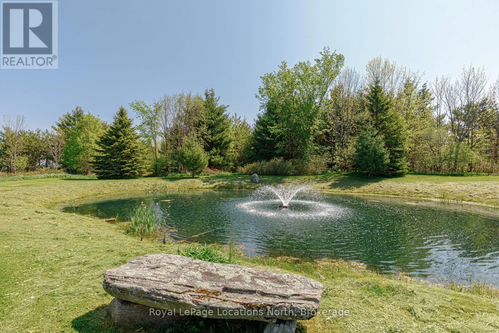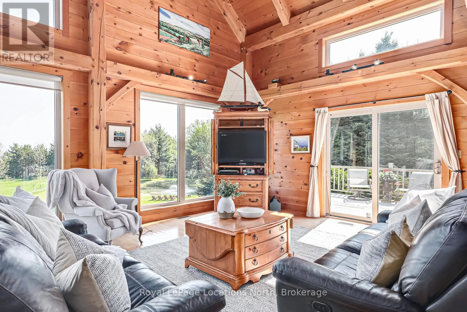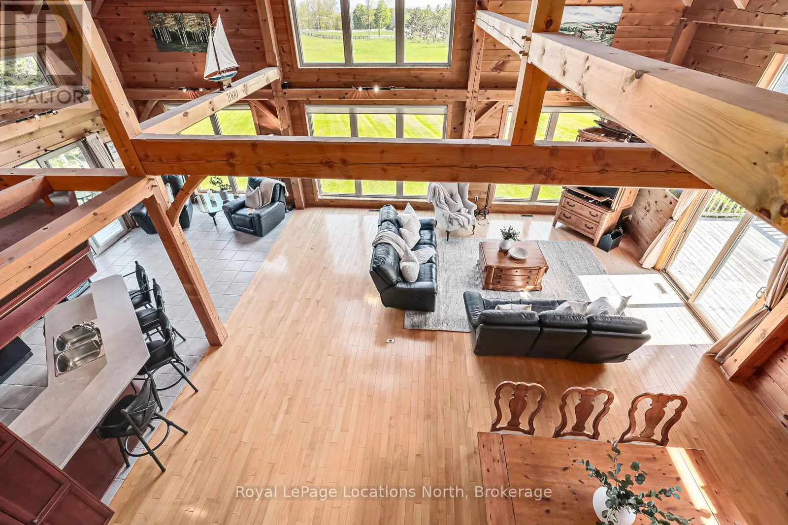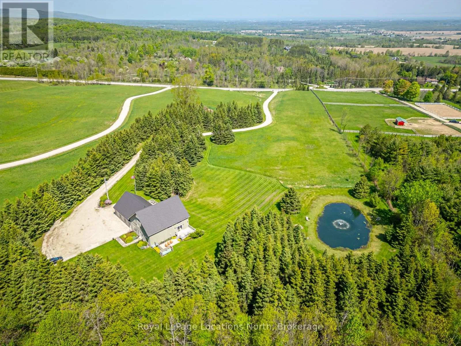 Cross Streets: County Rd 91 & Hurontario St. ** Directions: Highway 124 to Duntroon, turn west on County Rd 91 to sign. Welcome to your private country estate, set on 9.02 acres of breathtaking natural landscape with panoramic views stretching across Georgian Bay and the surrounding countryside.This exceptional timber frame residence, finished in classic board and batten, offers over 3,600 square feet of thoughtfully designed living space, surrounded by mature trees, a tranquil pond with fountain, and sweeping vistas that capture the essence of South Georgian Bay living.At the heart of the home, the dramatic Great Room showcases soaring vaulted ceilings, exposed timber beams, and expansive windows that frame the spectacular views beyond. The open-concept design seamlessly connects the kitchen, dining, and living spaces-creating an inviting environment ideal for both refined entertaining and relaxed everyday living.A spacious main-floor bedroom provides flexibility as a guest suite, home office, or private retreat.Upstairs, the loft-style primary suite offers a true sense of escape, complete with a luxurious 5-piece ensuite and walk-in closet-your own private sanctuary overlooking the surrounding landscape.The fully finished lower level is designed for both comfort and recreation, featuring three additional bedrooms, a 4-piece bath, and a generous rec/games room with walk-out access-effortlessly extending your living space into the outdoors.Step outside to the expansive deck and immerse yourself in the natural beauty that surrounds you-perfect for morning coffee, evening sunsets, or hosting family and friends.A triple car garage provides ample space for vehicles, recreational equipment, and storage, complementing the property's active four-season lifestyle.Ideally located just minutes from Duntroon Highlands Golf Club, Highlands Nordic, Devils Glen Ski Club, scenic hiking trails, private ski clubs, Blue Mountain Village, downtown Collingwood, and the shores of Georgian Bay.An extraordinary offering that blends refined country living with privacy, space, and year-round recreation. (id:27476)