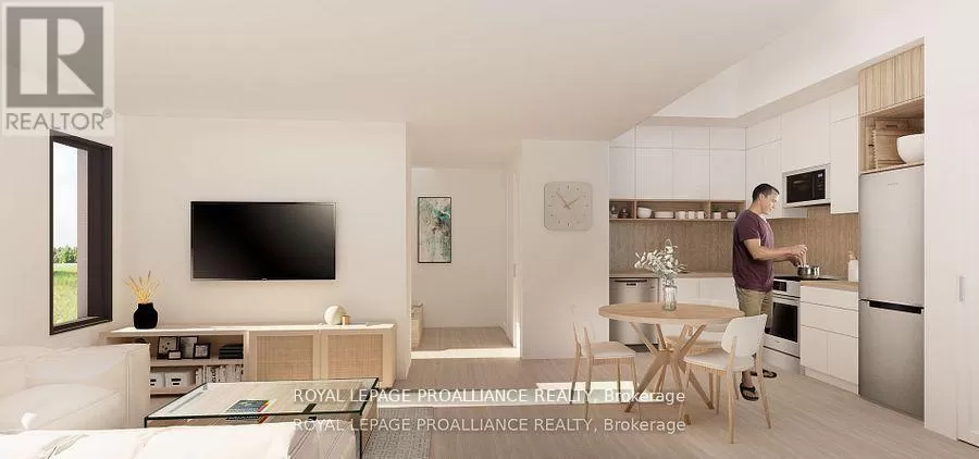 Cross Streets: King St/Brook/Rollings/Bennett. ** Directions: King St / Brook/ Rollings / Bennett. Introducing STUDIO 24 in Cobourg's sought after EAST VILLAGE, located a walk or bike ride distance to Lake Ontario's vibrant waterfront, beaches, downtown, shopping, parks and restaurants! Construction by Stalwood Homes, these affordable studios are perfect for the first time home buyer, professional or down-sizer. Beautiful modern finishes enhanced with 9 ft ceilings. Open concept living room and stylish kitchen with Stainless Steel appliances. Convenient in suite laundry with a stackable Washer & Dryer. Luxury Vinyl Plank throughout with tiled washroom. Purchaser customizes colours and finishes and also enjoys a $5000 upgrade allowance! Fibre Internet available, HRV for healthy living, heat pump provides primary heating/cooling, owned hot water tank. Lawn Care And Snow Removal included in condo fees, along with one designated parking space and visitor parking is on-site. Easy access to the 401 corridor, convenient Cobourg VIA stop, and just a 45-minute drive to the Oshawa GO. **EXTRAS** Photos are virtual renditions of the build (id:27476)