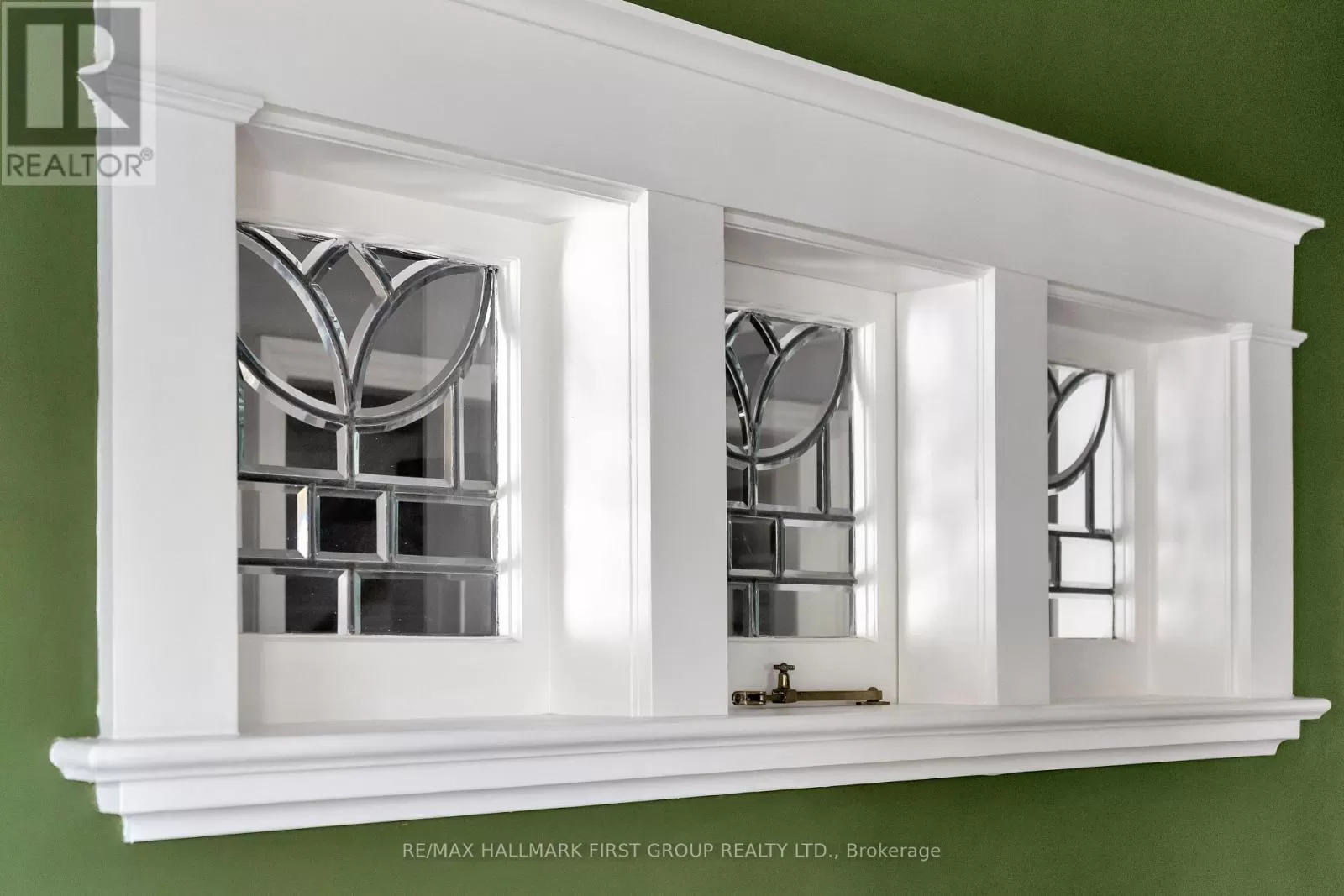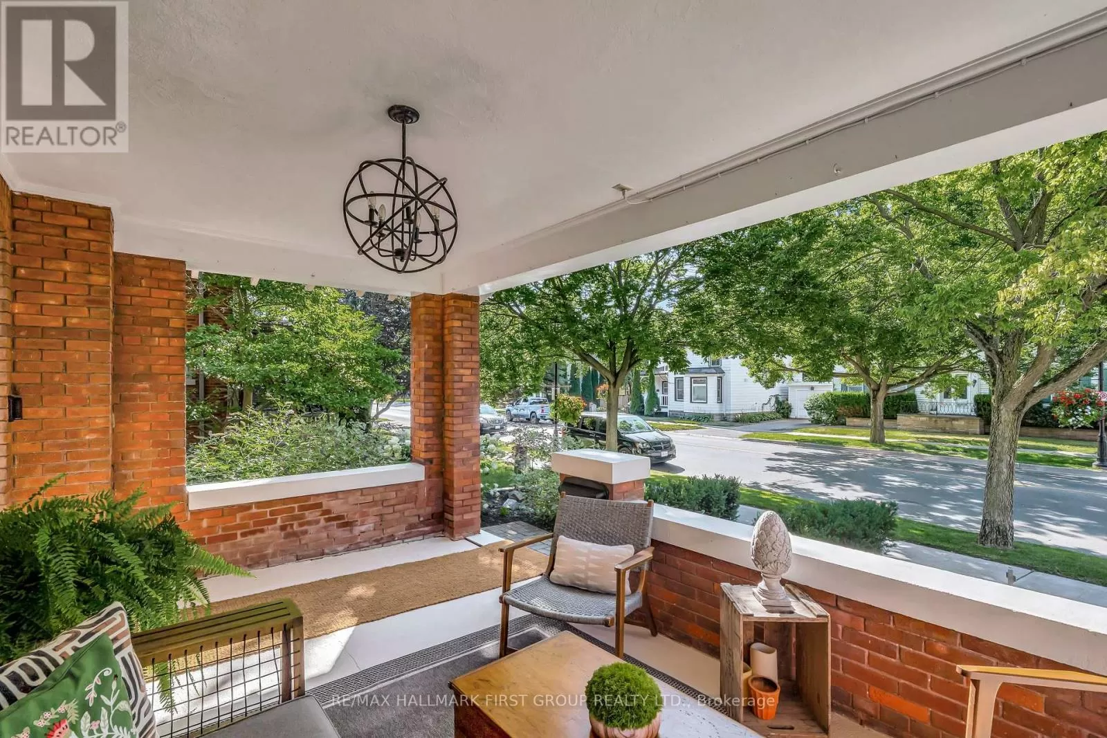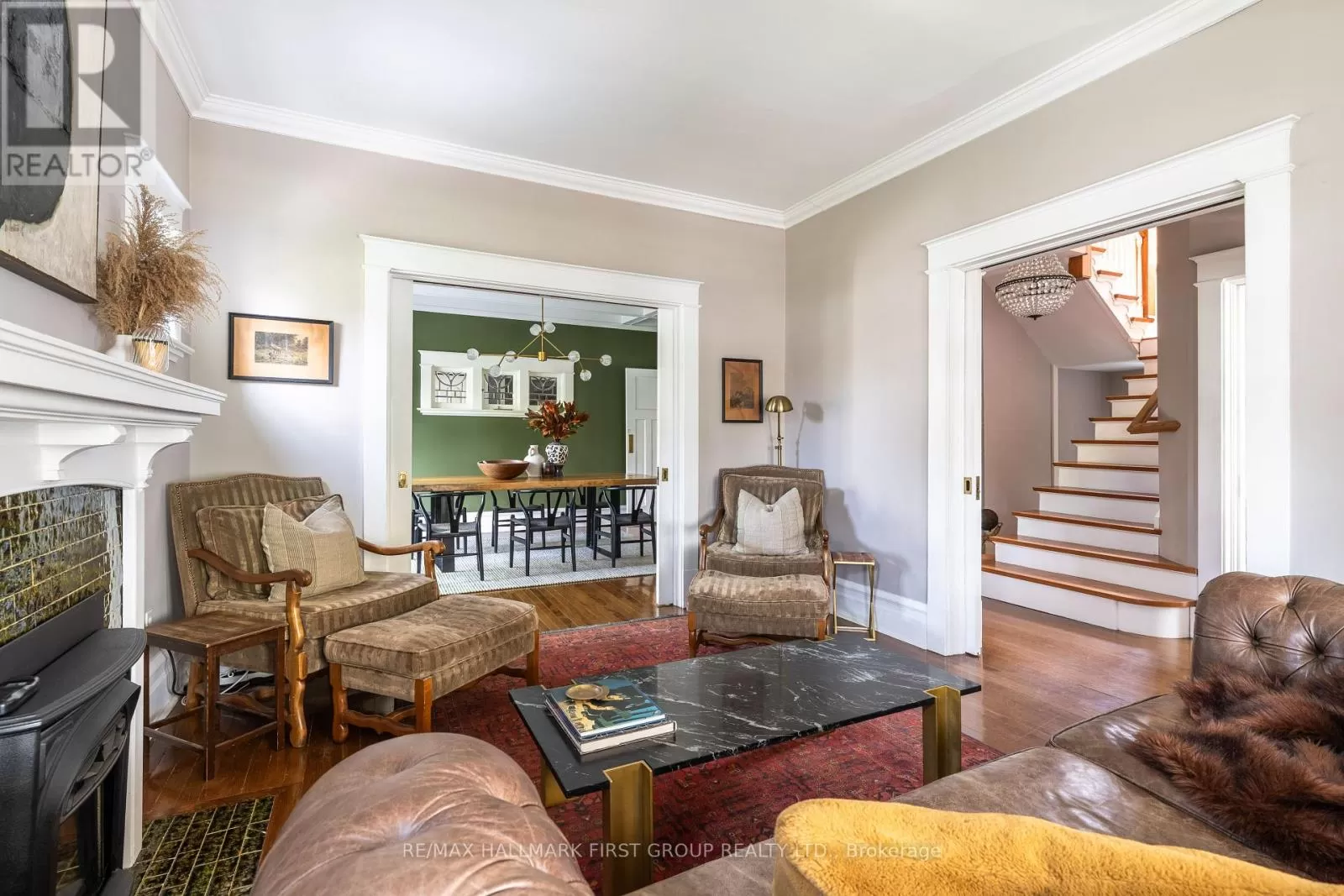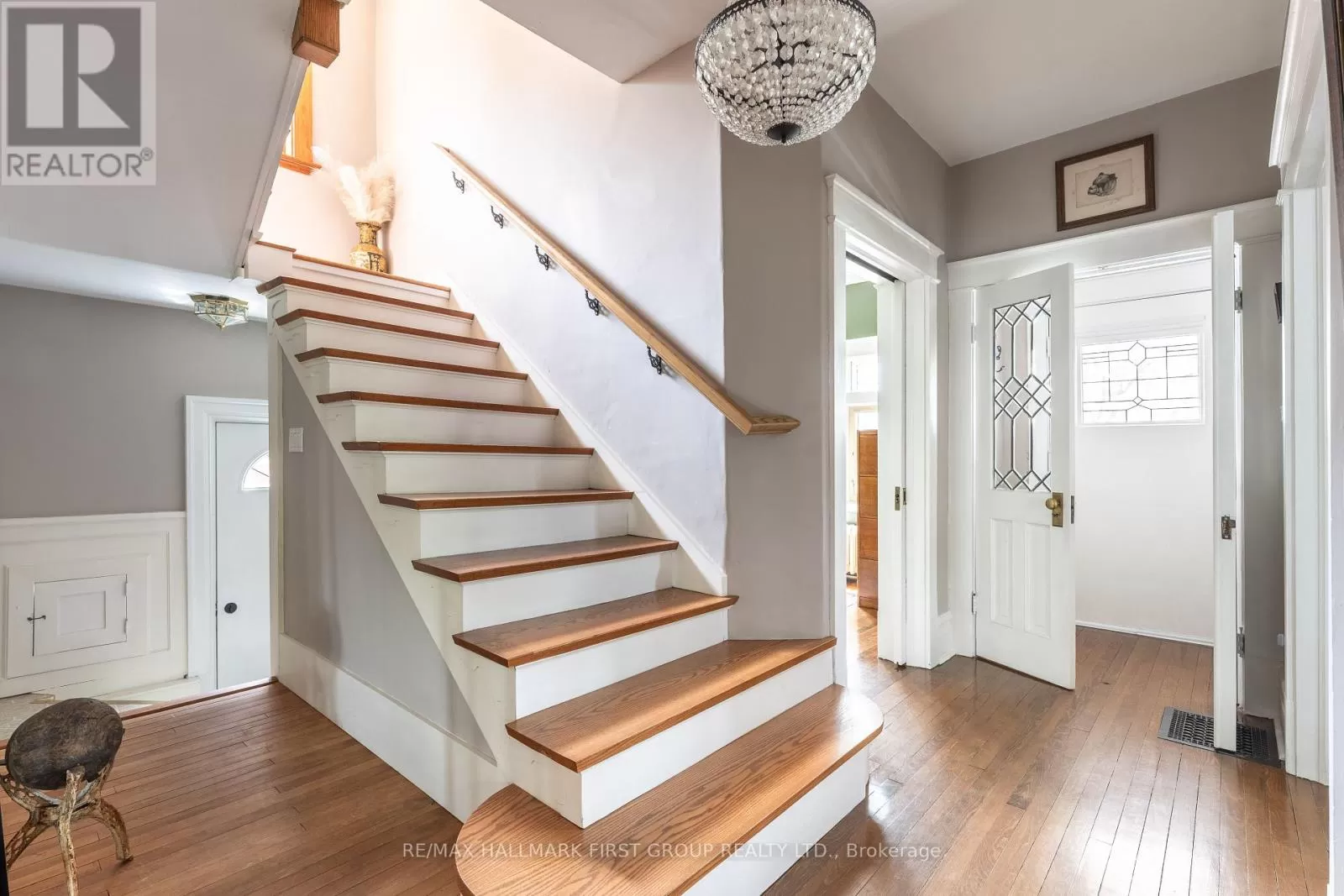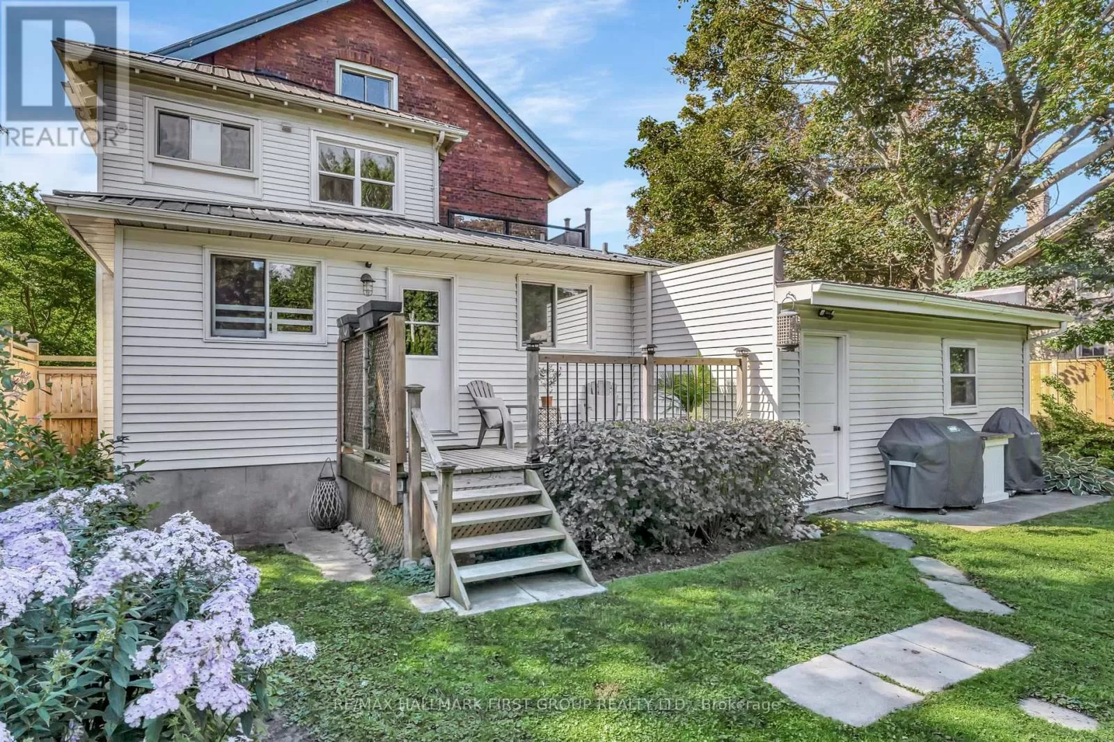 Ball Street & King Street West Magazine worthy-- Impeccably maintained from inside out, with modern updates, this 2.5 storey stunner is located on Cobourg's downtown strip. Known as a 'JEX', this home marries character, charm and historic appeal just steps to the Lake Ontario & the West Beach! Period details in impeccable condition are showcased throughout; stained glass windows, crown moulding, hardwood flooring, baseboard & trim! The absolute best front porch leads to the main floor which features an office/den overlooking King St., a formal living & dining room combination w/ bay windows, fireplace, warm earth tones to ground this space plus wood built in's, a pass through from the dining area to the brand new kitchen which offers soaring ceilings, built-in wall oven, quartz countertops & backsplash & functional prep space. Two guest bedrooms, a gorgeous 4pc. bathroom, access to the mature and private backyard as well as the single car garage complete this level. The 2nd floor, previously used as an in-law suite offers space to re-create the kitchen in the current gym, a 3pc. bath, access to the upper level deck overlooking the yard, a designated laundry room, 3rd bedroom and a large family room w/ hardwood flooring & bright windows. The primary suite spans the entire 3rd floor offering a modern yet sophisticated aesthetic w/ round window detail & a 4pc. ensuite with a clawfoot tub. The expansive back deck overlooks lush gardens and court yard like design. Enjoy a night on your porch, your pergola covered patio or entertaining inside with style. In the heart of it all, the curb appeal, the condition and the location are well worth the move to downtown! (id:27476)