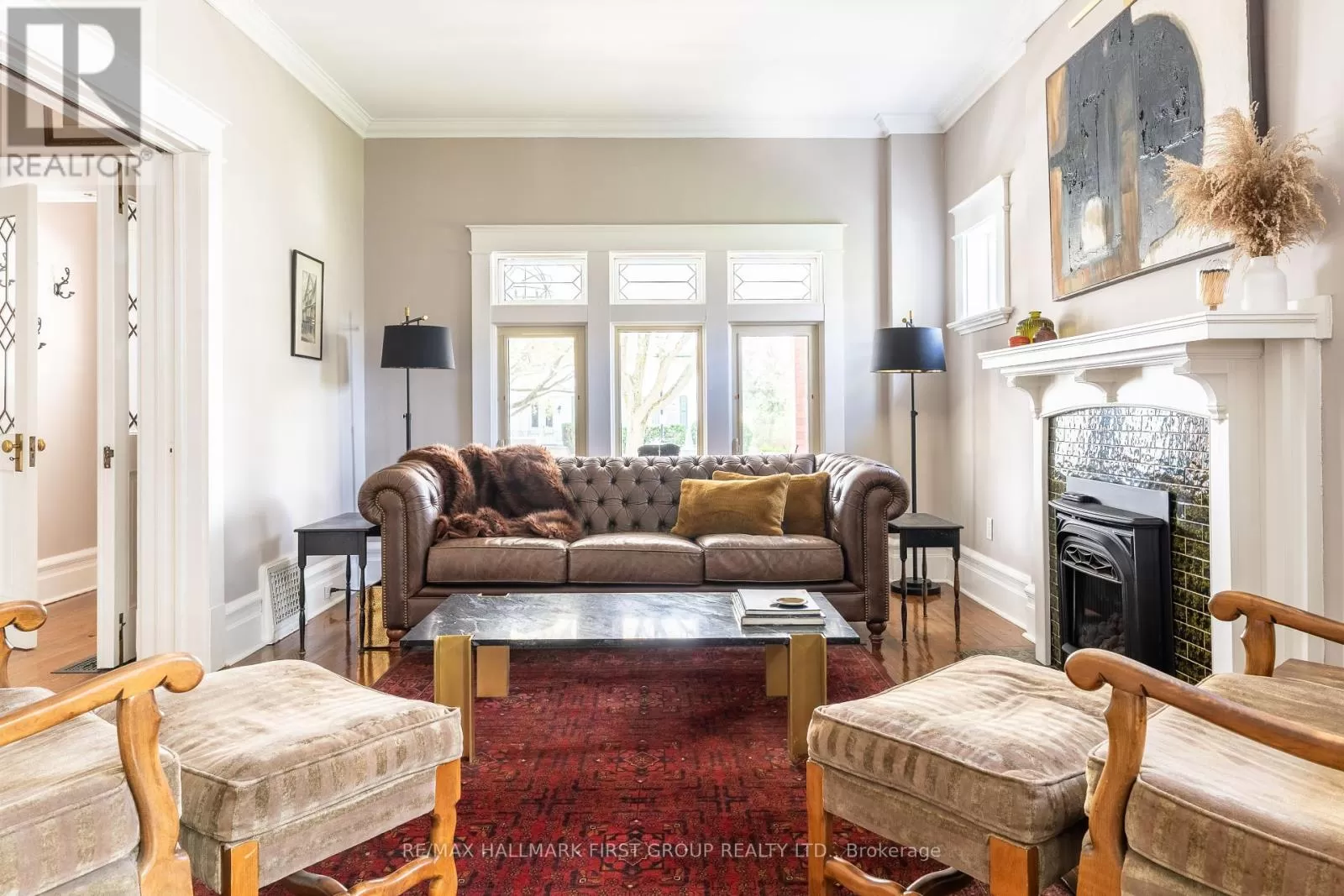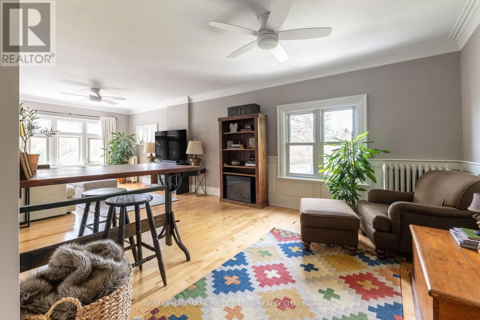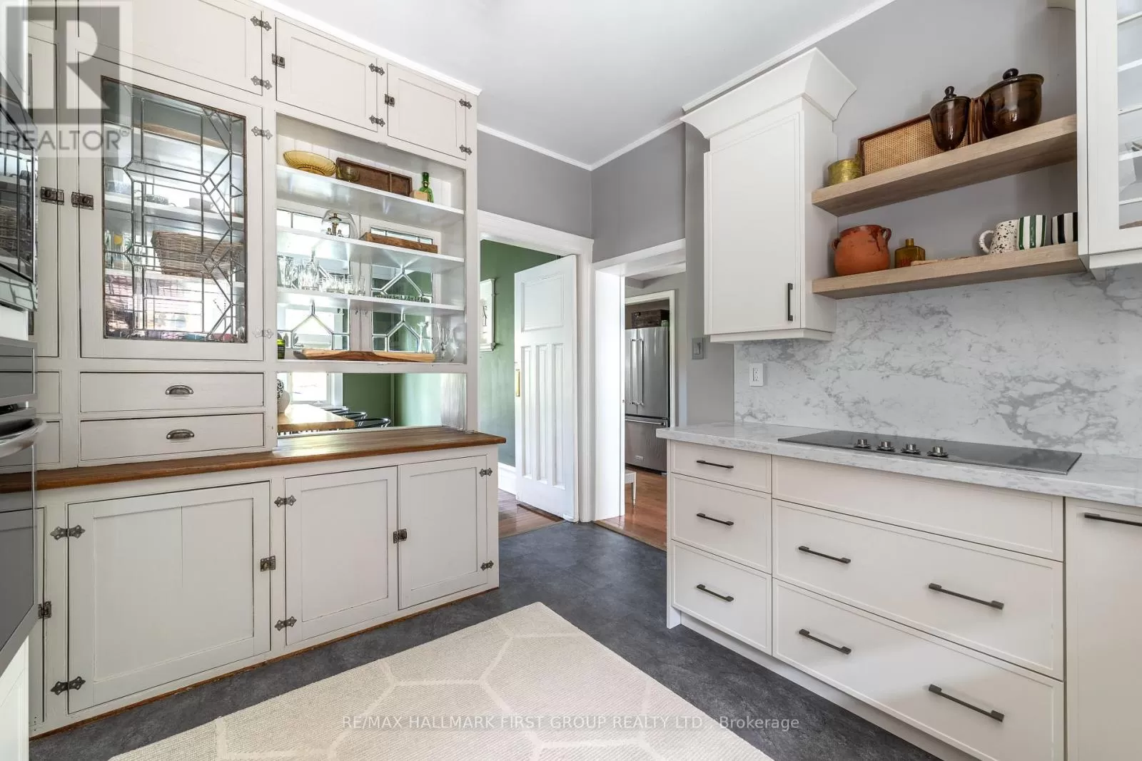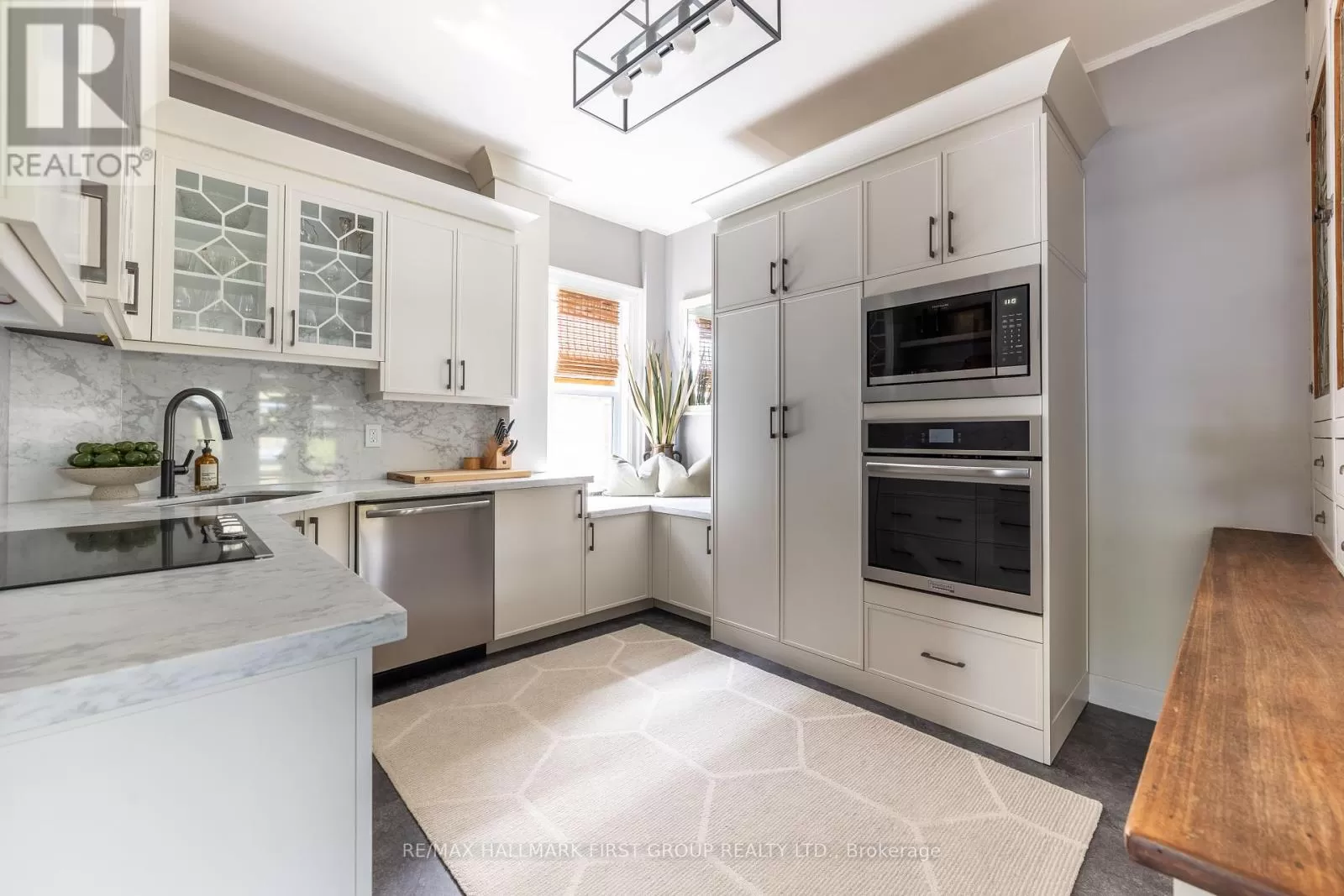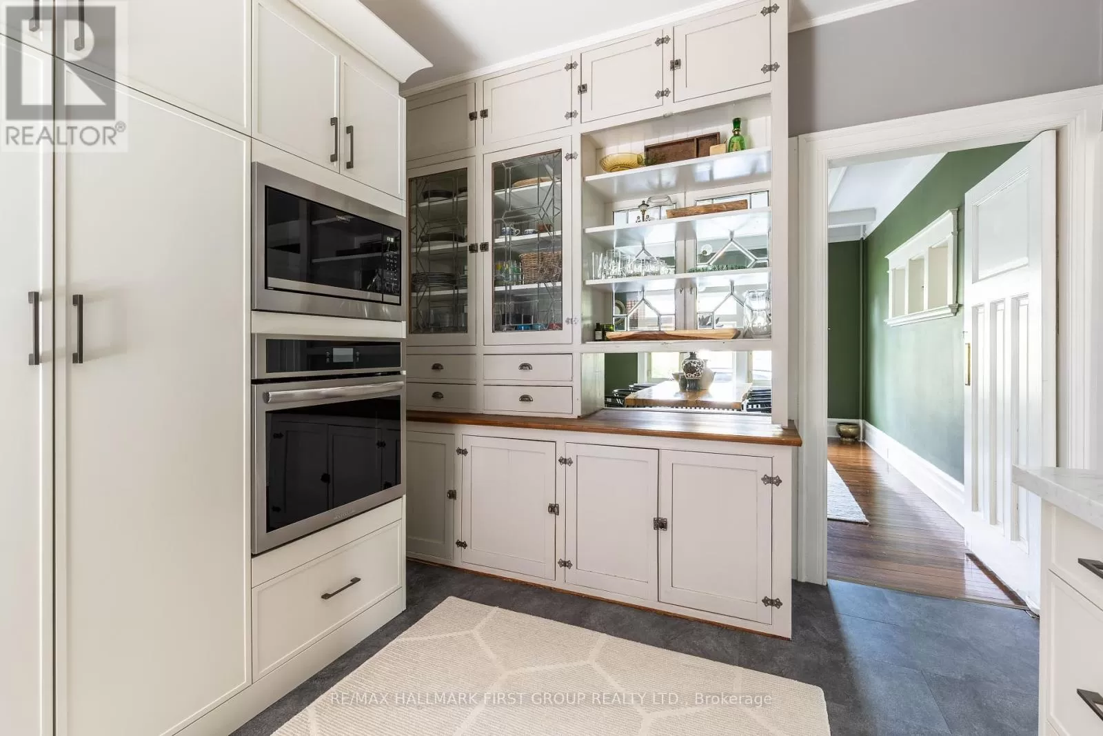 Ball Street & King Street West Magazine worthy-- Impeccably maintained from inside out, with modern updates, this 2.5 storey stunner is located on Cobourg's downtown strip. Known as a 'JEX', this home marries character, charm and historic appeal just steps to the Lake Ontario & the West Beach! Period details in impeccable condition are showcased throughout; stained glass windows, crown moulding, hardwood flooring, baseboard & trim! The absolute best front porch leads to the main floor which features an office/den overlooking King St., a formal living & dining room combination w/ bay windows, fireplace, warm earth tones to ground this space plus wood built in's, a pass through from the dining area to the brand new kitchen which offers soaring ceilings, built-in wall oven, quartz countertops & backsplash & functional prep space. Two guest bedrooms, a gorgeous 4pc. bathroom, access to the mature and private backyard as well as the single car garage complete this level. The 2nd floor, previously used as an in-law suite offers space to re-create the kitchen in the current gym, a 3pc. bath, access to the upper level deck overlooking the yard, a designated laundry room, 3rd bedroom and a large family room w/ hardwood flooring & bright windows. The primary suite spans the entire 3rd floor offering a modern yet sophisticated aesthetic w/ round window detail & a 4pc. ensuite with a clawfoot tub. The expansive back deck overlooks lush gardens and court yard like design. Enjoy a night on your porch, your pergola covered patio or entertaining inside with style. In the heart of it all, the curb appeal, the condition and the location are well worth the move to downtown! (id:27476)