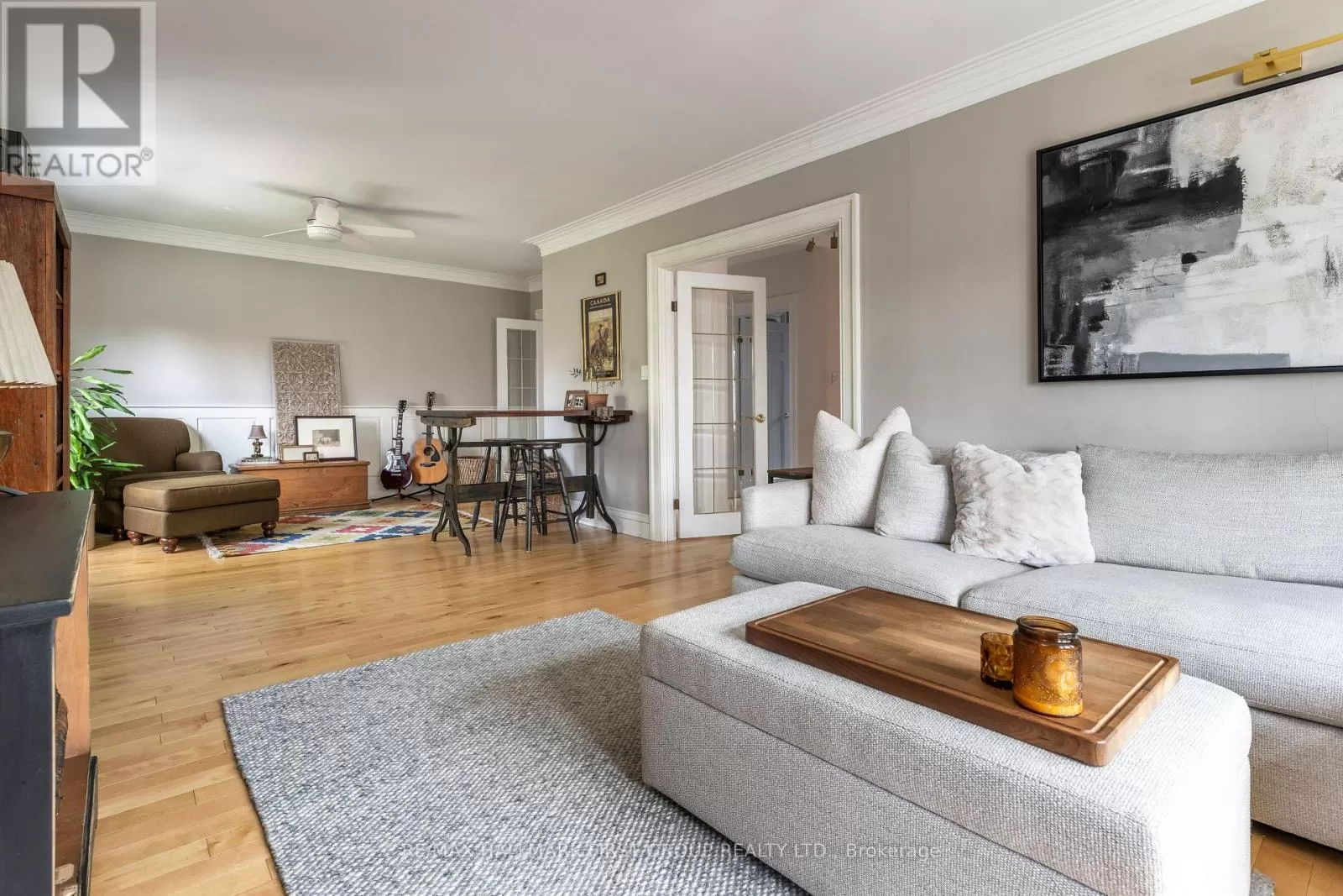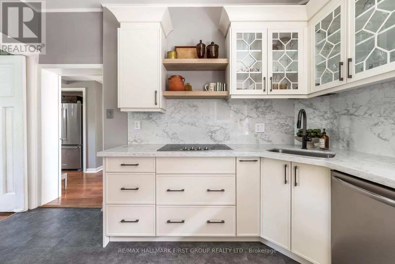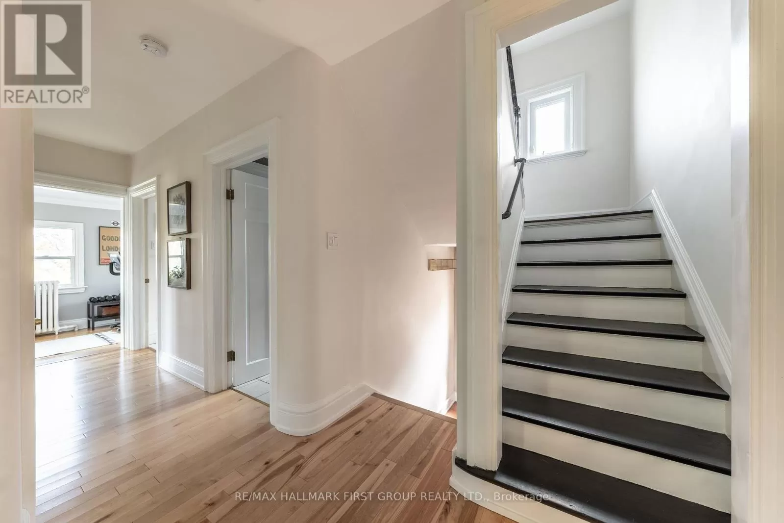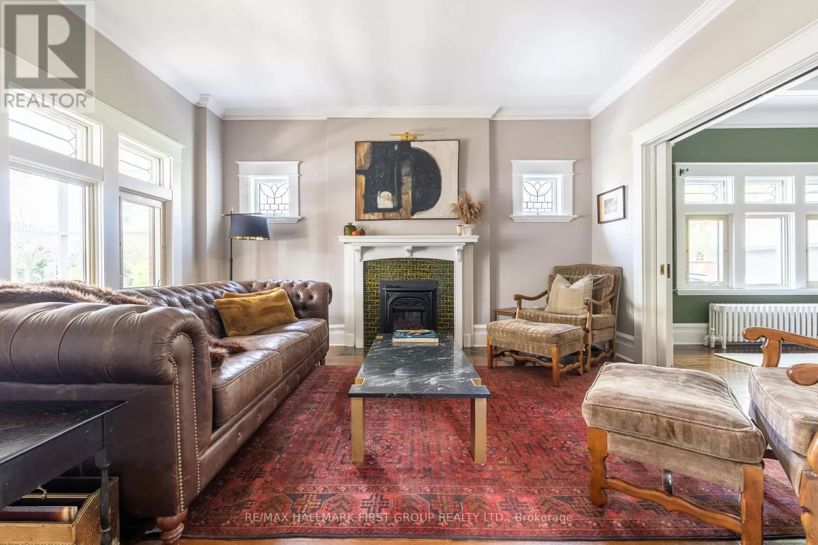 Ball Street & King Street West Magazine worthy-- Impeccably maintained from inside out, with modern updates, this 2.5 storey stunner is located on Cobourg's downtown strip. Known as a 'JEX', this home marries character, charm and historic appeal just steps to the Lake Ontario & the West Beach! Period details in impeccable condition are showcased throughout; stained glass windows, crown moulding, hardwood flooring, baseboard & trim! The absolute best front porch leads to the main floor which features an office/den overlooking King St., a formal living & dining room combination w/ bay windows, fireplace, warm earth tones to ground this space plus wood built in's, a pass through from the dining area to the brand new kitchen which offers soaring ceilings, built-in wall oven, quartz countertops & backsplash & functional prep space. Two guest bedrooms, a gorgeous 4pc. bathroom, access to the mature and private backyard as well as the single car garage complete this level. The 2nd floor, previously used as an in-law suite offers space to re-create the kitchen in the current gym, a 3pc. bath, access to the upper level deck overlooking the yard, a designated laundry room, 3rd bedroom and a large family room w/ hardwood flooring & bright windows. The primary suite spans the entire 3rd floor offering a modern yet sophisticated aesthetic w/ round window detail & a 4pc. ensuite with a clawfoot tub. The expansive back deck overlooks lush gardens and court yard like design. Enjoy a night on your porch, your pergola covered patio or entertaining inside with style. In the heart of it all, the curb appeal, the condition and the location are well worth the move to downtown! (id:27476)