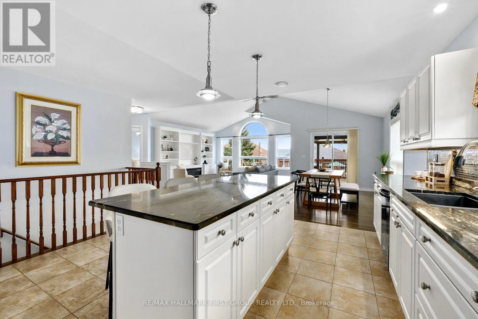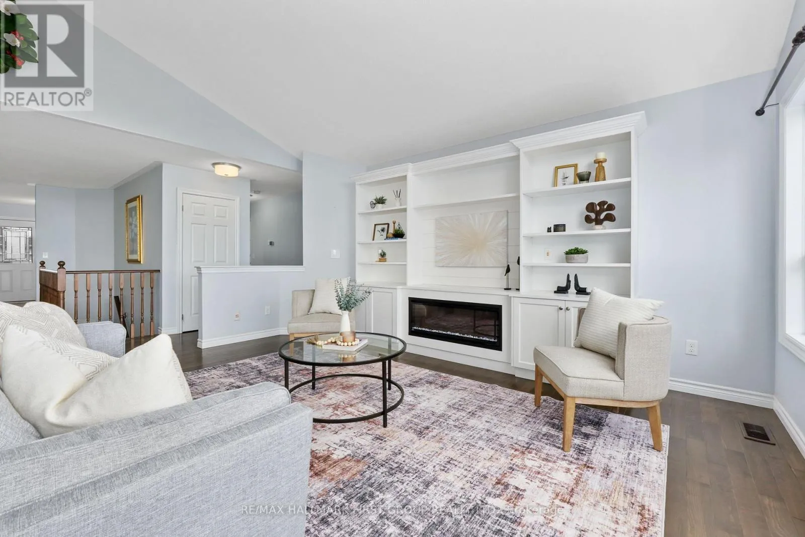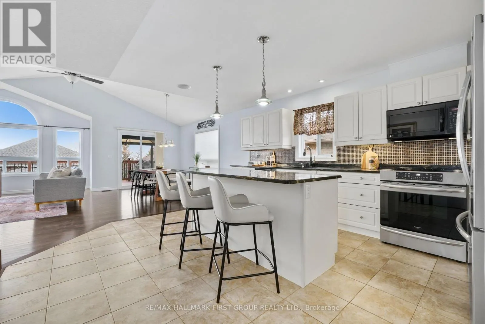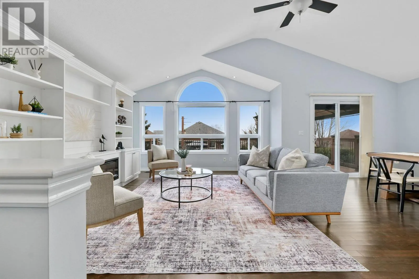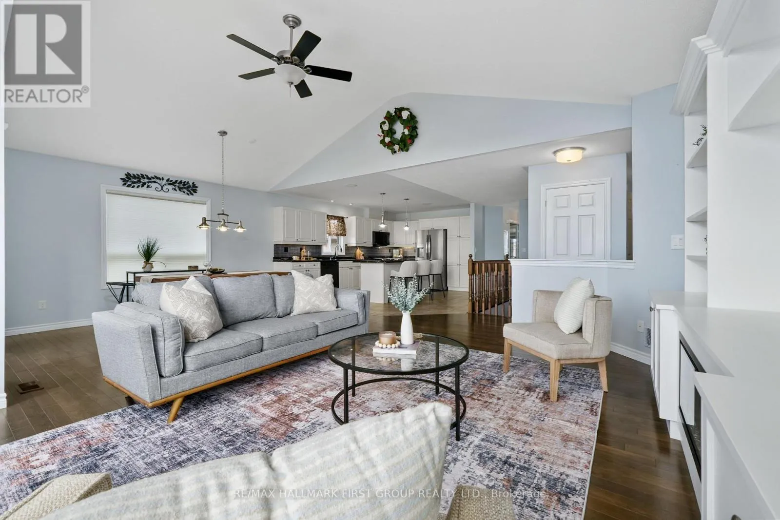 Cross Streets: Ashland Dr & Parkview Hills Dr. ** Directions: Exit 401 South onto Division St, Left onto Densmore Rd, Right onto Parkview Hills Dr, Left onto Ashland Dr. Located in the sought-after Parkview Hills community in Cobourg, just steps to St. Mary's Catholic Secondary School and nearby amenities, this family-friendly bungalow offers convenient main-level living with the added benefit of a fully finished lower level. A spacious covered front porch leads into a welcoming foyer with ample storage for the whole family. At the front of the home, an office with glass French doors is filled with natural light, perfect for working from home. The open-concept principal living space is highlighted by a cathedral ceiling with a bright, airy feel. The living room features a wall of windows, built-in shelving, and an electric fireplace, seamlessly connecting to the dining area with modern lighting and a walkout to the back deck, ideal for extending your living space and entertaining. The kitchen is both stylish and functional, offering sleek countertops, a double undermount sink, tile backsplash, stainless steel appliances, and a large island with pendant lighting. Ample cabinetry and prep space make it perfect for everyday living. The main floor primary suite features a large window, walk-in closet, and a private ensuite with a glass shower enclosure and separate tub. Completing the level is a second bedroom, bathroom, and convenient main floor laundry. The finished lower level provides a spacious rec room with a gas fireplace, two additional well-appointed bedrooms, and a full bathroom, perfect for guests or growing families. Outside, enjoy a generous deck, mature gardens, green space, and the added benefit of solar panels on the roof. Ideally located close to amenities with easy access to Highway 401, this home offers comfort, space, and convenience in a desirable neighbourhood. (id:27476)
