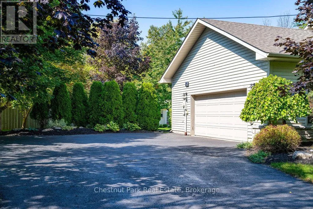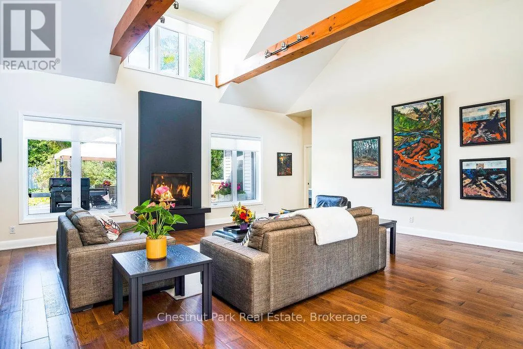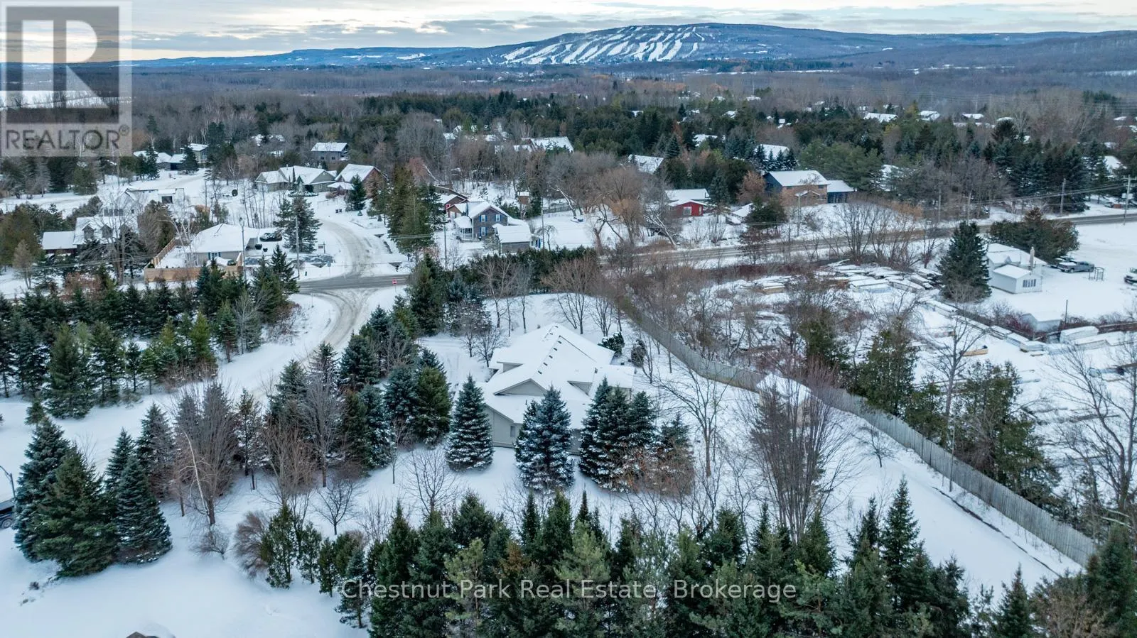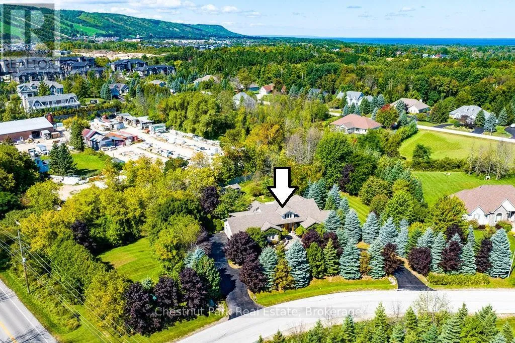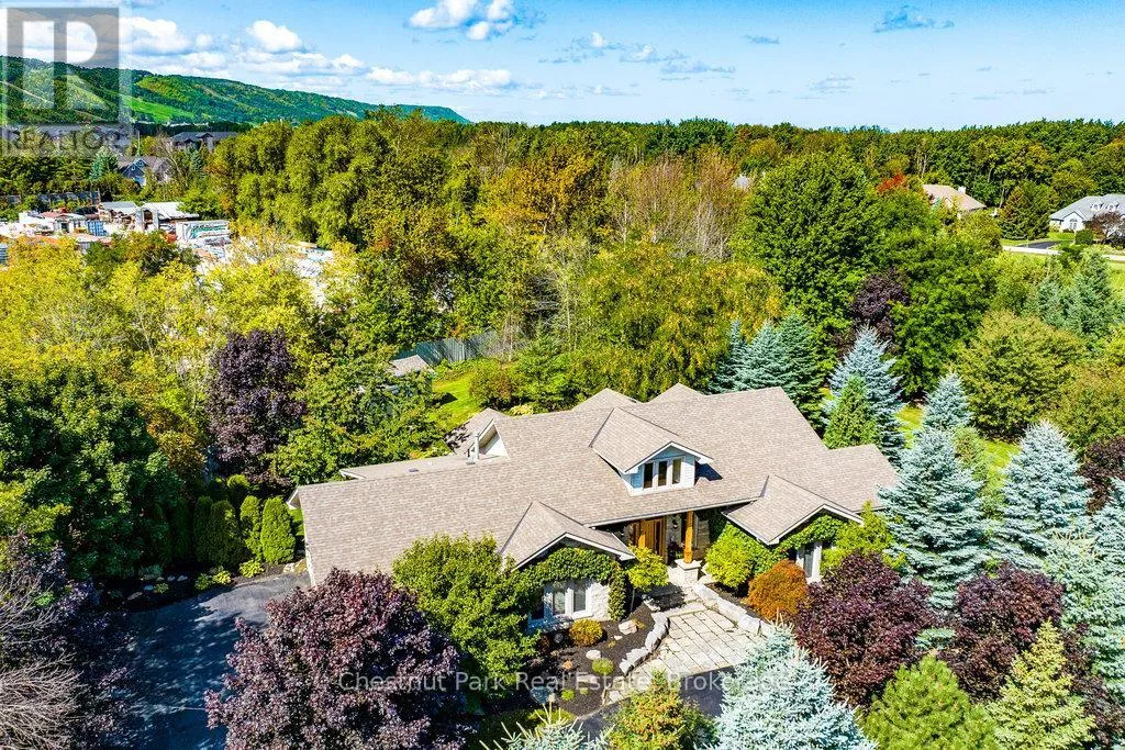Cross Streets: Grey Rd 19 (Mountain Rd) and Evergreen Rd. ** Directions: Mountain Rd (Grey Rd 19) from Collingwood to Evergreen Road, turn right to sign and first driveway on the left (Evergreen Estates). Imagine living just two minutes from Blue Mountain's ski hills, golf courses, shops, restaurants, and everything Collingwood has to offer. Hop on your bike and in 15 minutes you're riding the Pretty River Valley--one of the region's most scenic road cycling routes. Set on a private 1-acre lot in a park-like setting, this executive ranch-style bungalow with 2 car garage offers easy access to the area's best walking and biking trails, making it an ideal base for four-season living. Beautifully landscaped and surrounded by mature trees and perennial gardens, this home offers 2,532 square feet of finished living space, including 4 bedrooms (one currently used as a study), 3 full baths, and a cozy media room. Radiant in-floor heating and a split ductless system ensure year-round comfort. In the great room, a soaring 17.5 vaulted ceiling and wood beams create a sense of warmth and grandeur, anchored by a modern fireplace that draws you in. The open-concept layout blends the great room, gourmet kitchen and dining area, making it perfect for entertaining. Step outside to an oversized back deck with hot tub and covered gazebo--an ideal setting for relaxing or gathering with family and friends. A charming studio at the rear of the property offers a creative hideaway, whether for kids, artists, or as a private retreat. With space to add a pool or dedicated play area, this home offers endless opportunities for outdoor living. Don't miss your chance to own a slice of Collingwood's lifestyle--where comfort, recreation, and nature meet. (id:27476)
