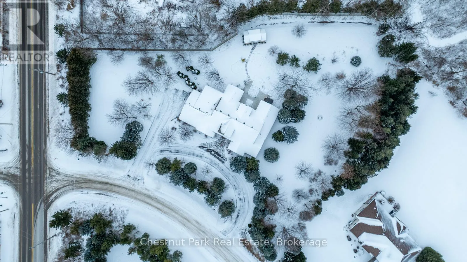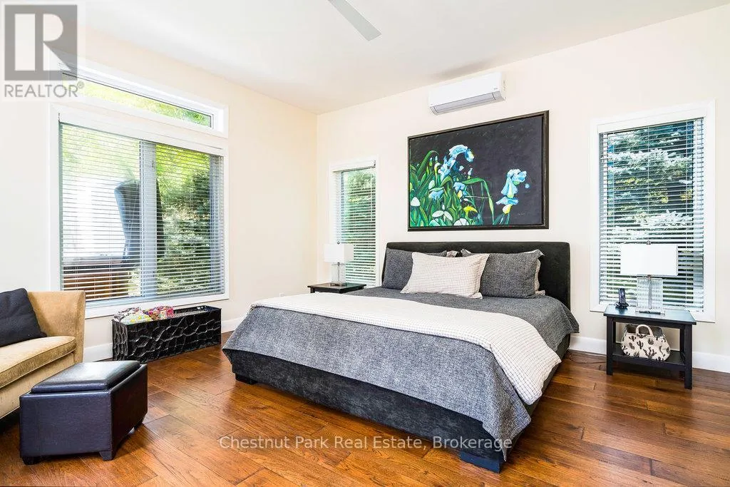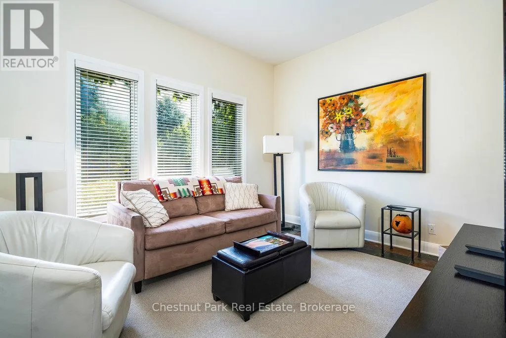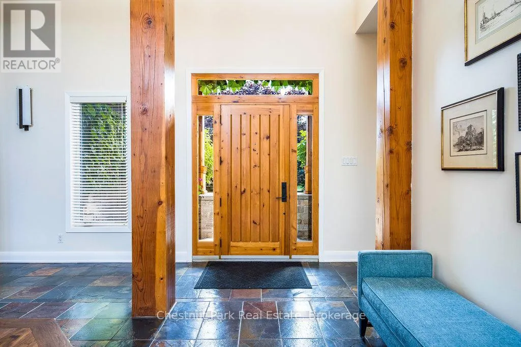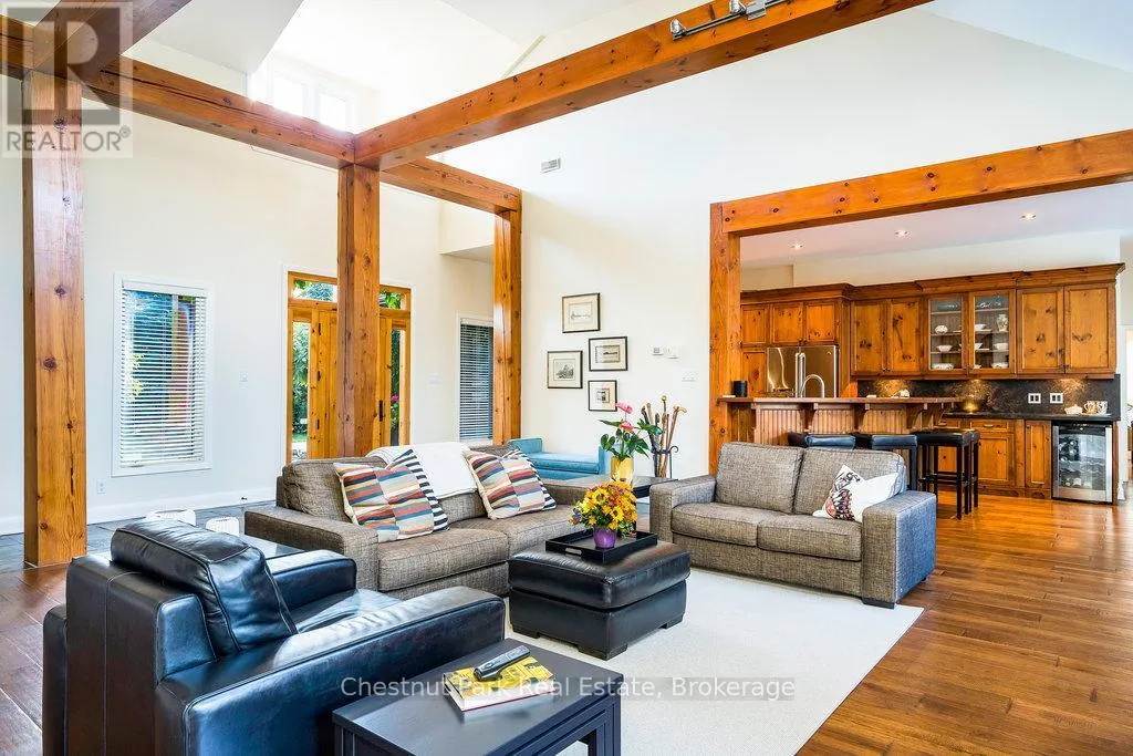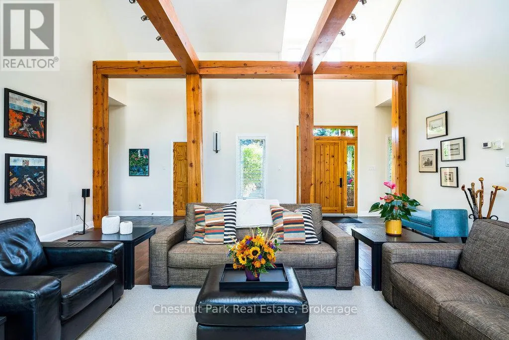 Cross Streets: Grey Rd 19 (Mountain Rd) and Evergreen Rd. ** Directions: Mountain Rd (Grey Rd 19) from Collingwood to Evergreen Road, turn right to sign and first driveway on the left (Evergreen Estates). Imagine living just two minutes from Blue Mountain's ski hills, golf courses, shops, restaurants, and everything Collingwood has to offer. Hop on your bike and in 15 minutes you're riding the Pretty River Valley--one of the region's most scenic road cycling routes. Set on a private 1-acre lot in a park-like setting, this executive ranch-style bungalow with 2 car garage offers easy access to the area's best walking and biking trails, making it an ideal base for four-season living. Beautifully landscaped and surrounded by mature trees and perennial gardens, this home offers 2,532 square feet of finished living space, including 4 bedrooms (one currently used as a study), 3 full baths, and a cozy media room. Radiant in-floor heating and a split ductless system ensure year-round comfort. In the great room, a soaring 17.5 vaulted ceiling and wood beams create a sense of warmth and grandeur, anchored by a modern fireplace that draws you in. The open-concept layout blends the great room, gourmet kitchen and dining area, making it perfect for entertaining. Step outside to an oversized back deck with hot tub and covered gazebo--an ideal setting for relaxing or gathering with family and friends. A charming studio at the rear of the property offers a creative hideaway, whether for kids, artists, or as a private retreat. With space to add a pool or dedicated play area, this home offers endless opportunities for outdoor living. Don't miss your chance to own a slice of Collingwood's lifestyle--where comfort, recreation, and nature meet. (id:27476)