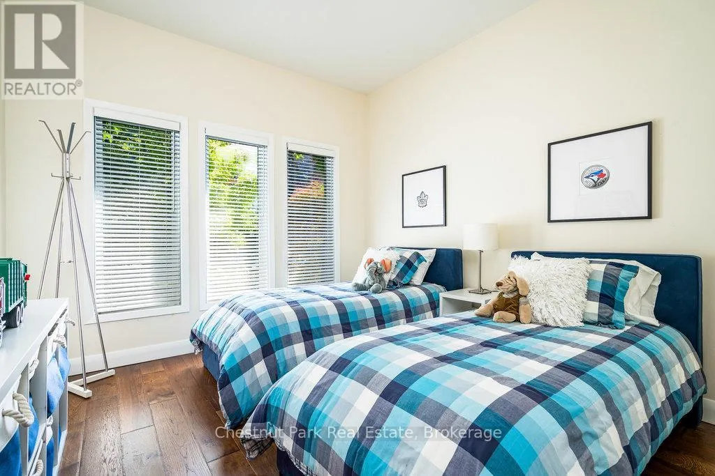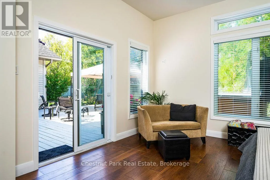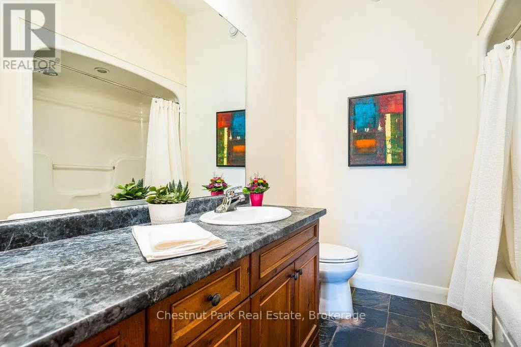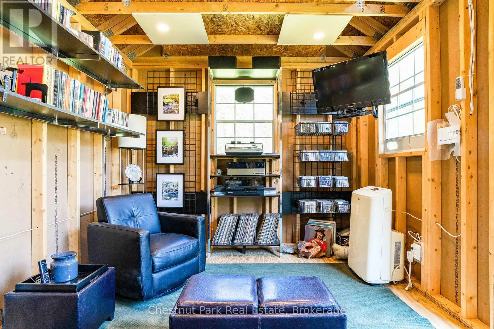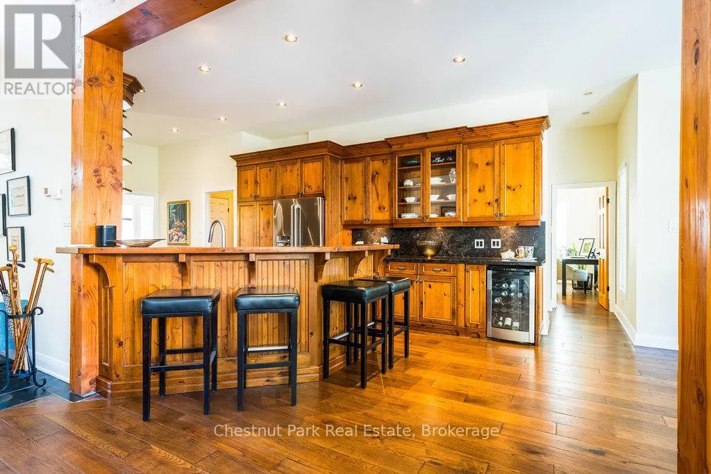 Cross Streets: Grey Rd 19 (Mountain Rd) and Evergreen Rd. ** Directions: Mountain Rd (Grey Rd 19) from Collingwood to Evergreen Road, turn right to sign and first driveway on the left (Evergreen Estates). Imagine living just two minutes from Blue Mountain's ski hills, golf courses, shops, restaurants, and everything Collingwood has to offer. Hop on your bike and in 15 minutes you're riding the Pretty River Valley--one of the region's most scenic road cycling routes. Set on a private 1-acre lot in a park-like setting, this executive ranch-style bungalow with 2 car garage offers easy access to the area's best walking and biking trails, making it an ideal base for four-season living. Beautifully landscaped and surrounded by mature trees and perennial gardens, this home offers 2,532 square feet of finished living space, including 4 bedrooms (one currently used as a study), 3 full baths, and a cozy media room. Radiant in-floor heating and a split ductless system ensure year-round comfort. In the great room, a soaring 17.5 vaulted ceiling and wood beams create a sense of warmth and grandeur, anchored by a modern fireplace that draws you in. The open-concept layout blends the great room, gourmet kitchen and dining area, making it perfect for entertaining. Step outside to an oversized back deck with hot tub and covered gazebo--an ideal setting for relaxing or gathering with family and friends. A charming studio at the rear of the property offers a creative hideaway, whether for kids, artists, or as a private retreat. With space to add a pool or dedicated play area, this home offers endless opportunities for outdoor living. Don't miss your chance to own a slice of Collingwood's lifestyle--where comfort, recreation, and nature meet. (id:27476)