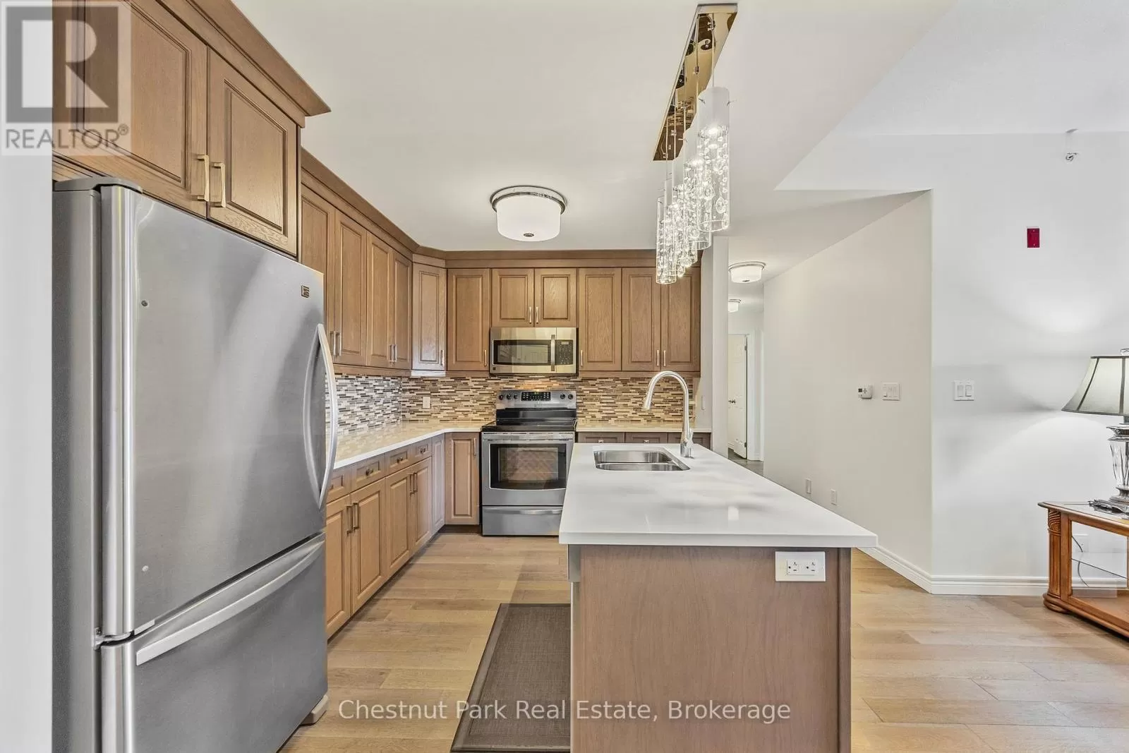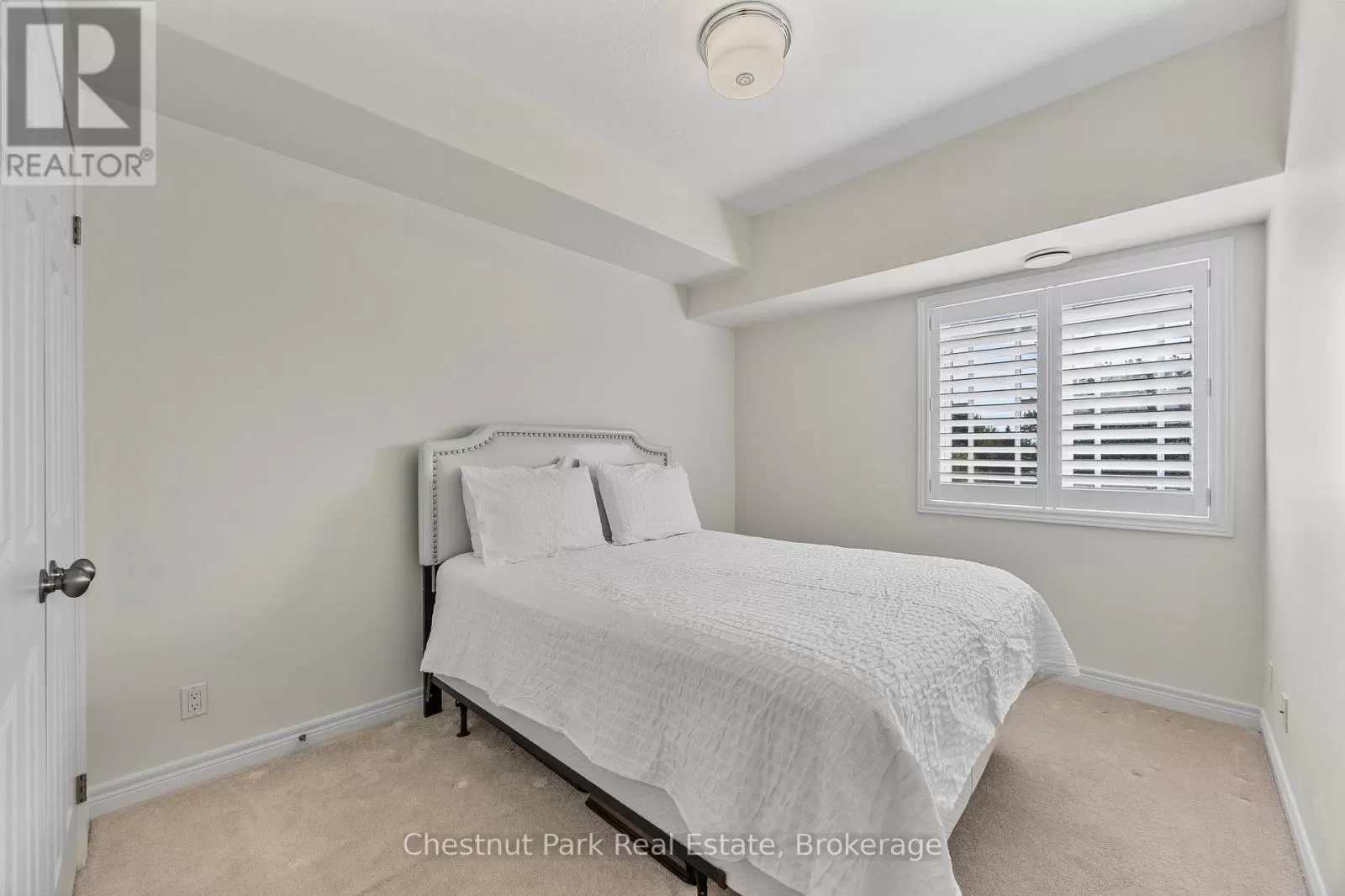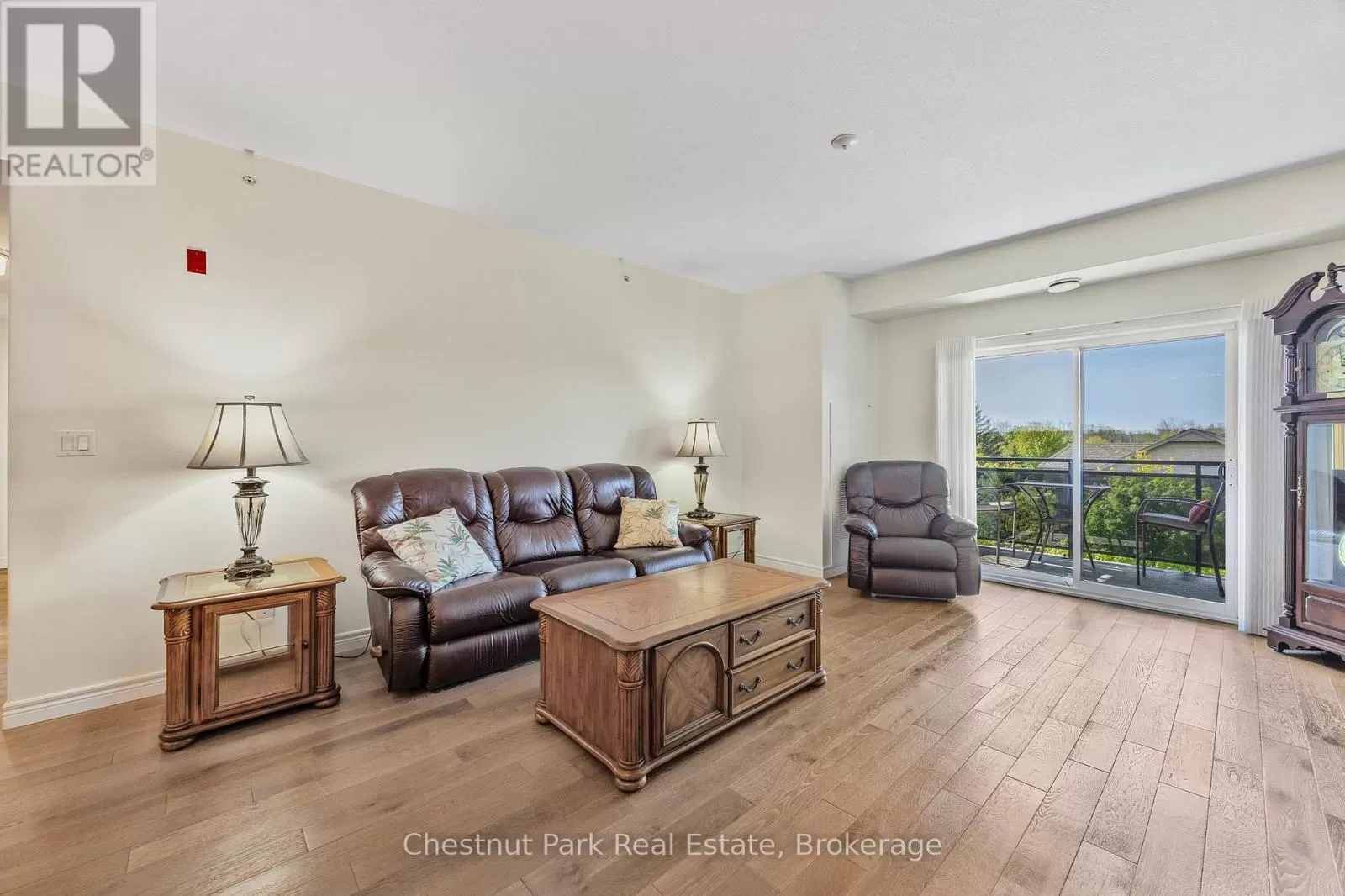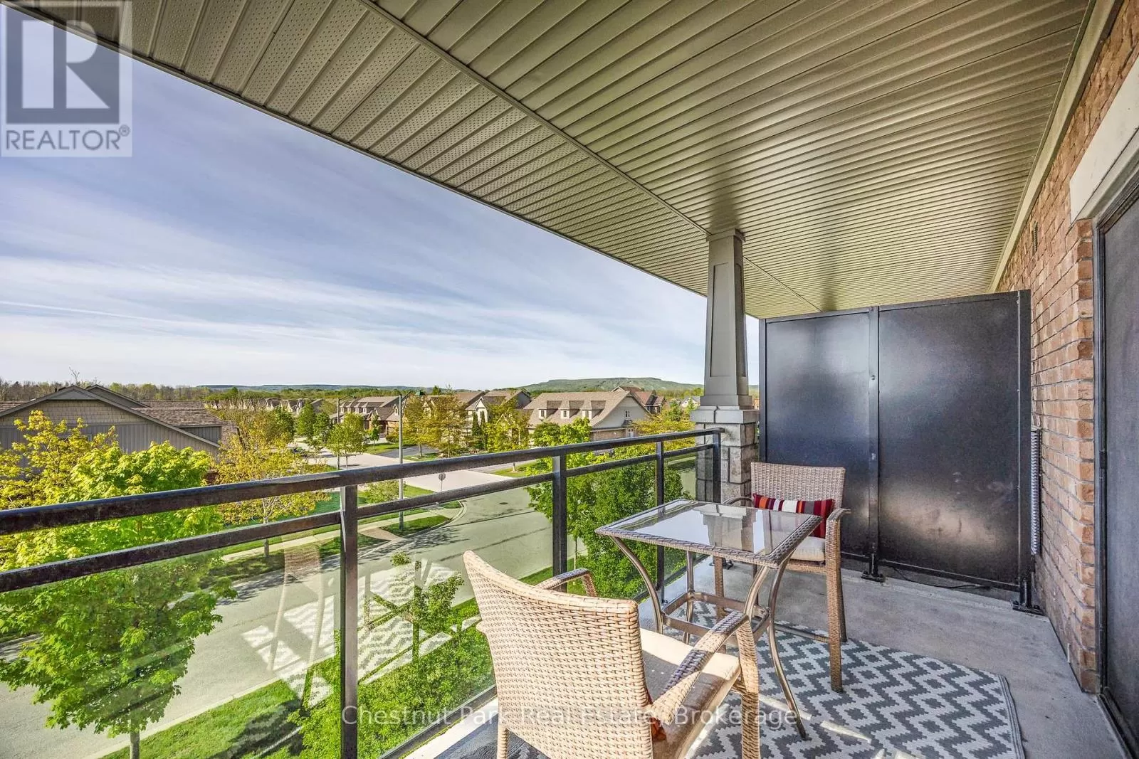 Cross Streets: High and Sixth Streets. ** Directions: South on High St to 1 Chamberlain Cres, turn right into car park - no sign on property. Welcome to Dwell at Creekside, an exclusive offering from award-winning Devonleigh Homes, where luxury meets lifestyle in the heart of Ontario's four-season playground. Perfectly positioned between the majestic Blue Mountains, the sparkling shores of Georgian Bay, and the charming, historic town of Collingwood, this rarely available 3-bedroom, 2-bathroom top-floor condo offers the best of nature, featuring a South facing private terrace with gorgeous views to the escarpment and Osler Bluff. Spanning over 1,200 SF, this exceptional residence features a bright and airy open-concept kitchen, dining, and living space, perfect for entertaining or quiet evenings at home. Step out onto your private 94 sq.ft. terrace and enjoy serene views across a tranquil pond-your own peaceful retreat. Built with over $50,000 in builder upgrades, including: California shutters throughout, Quartz countertops in kitchen and both bathroom, Extended kitchen cabinetry to the ceiling, Designer-upgraded washrooms and premium flooring, Dedicated laundry room with convenient stackable washer & dryer. Additional features include: Designated outdoor parking + guest parking, Assigned lower-level locker and extra bicycle storage, Optional second parking space available for $50/month via property management, and Residents lounge with kitchenette for gatherings and meetings. Whether you're seeking a year-round residence, a weekend getaway, or a sophisticated investment, this rare third-floor, 3-bedroom condo offers comfort, style, and a coveted location. Don't miss your chance to own a piece of Dwell at Creekside-where refined living meets the natural beauty of Southern Georgian Bay. (id:27476)