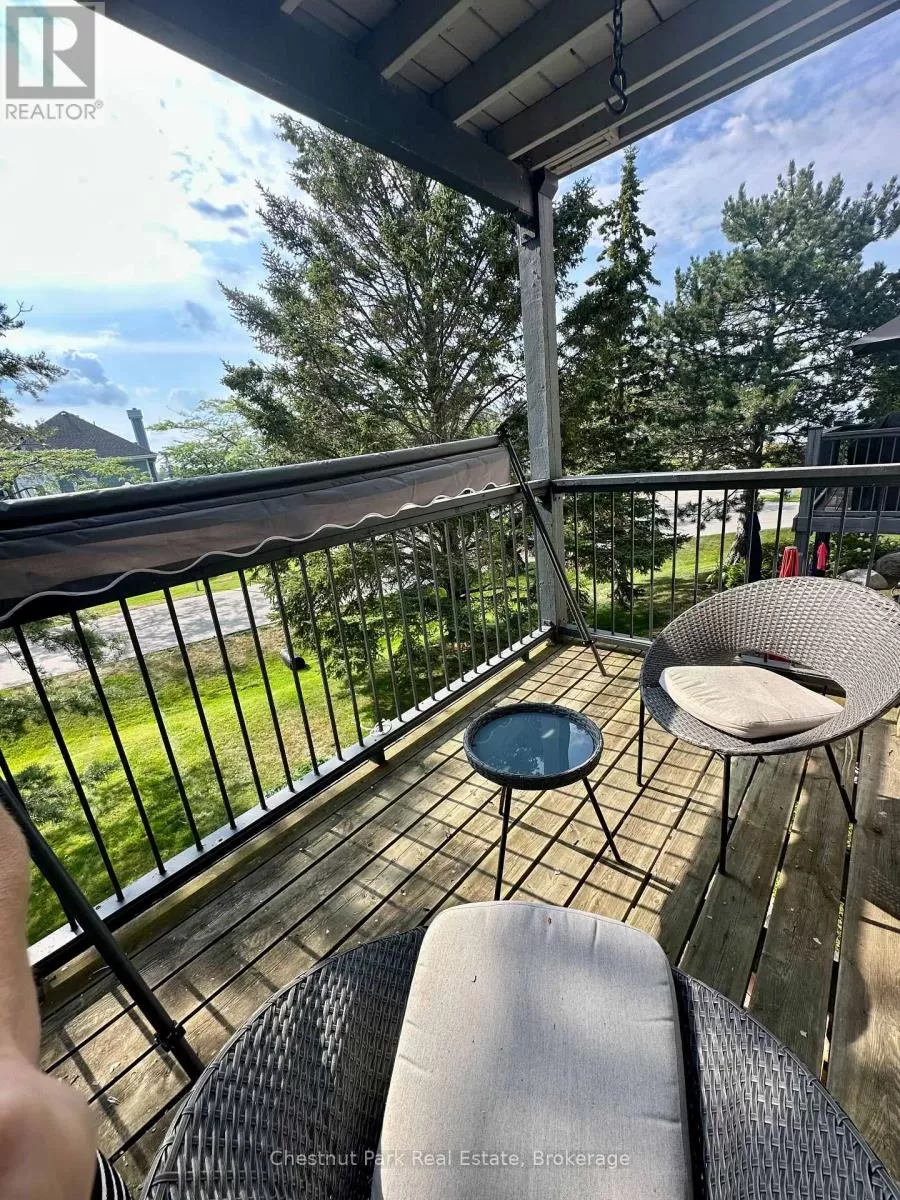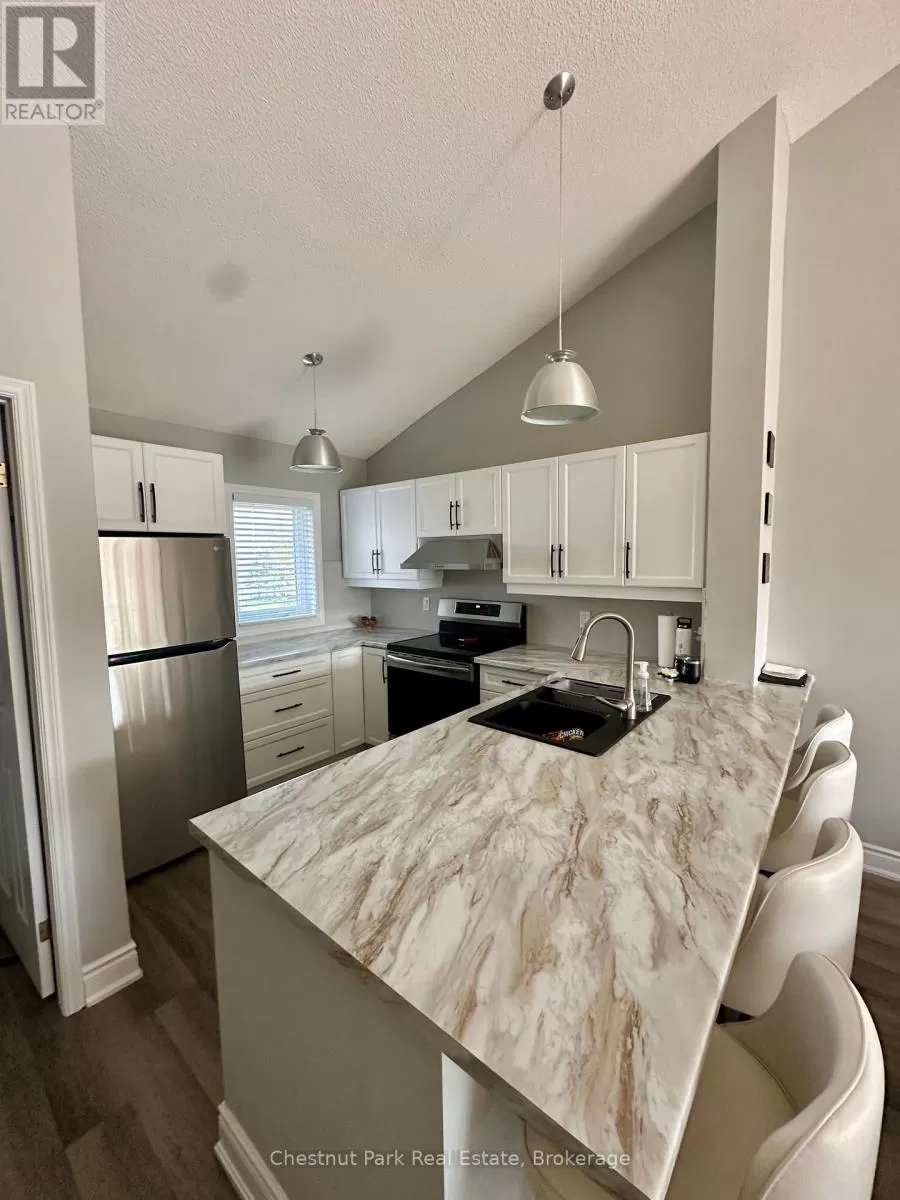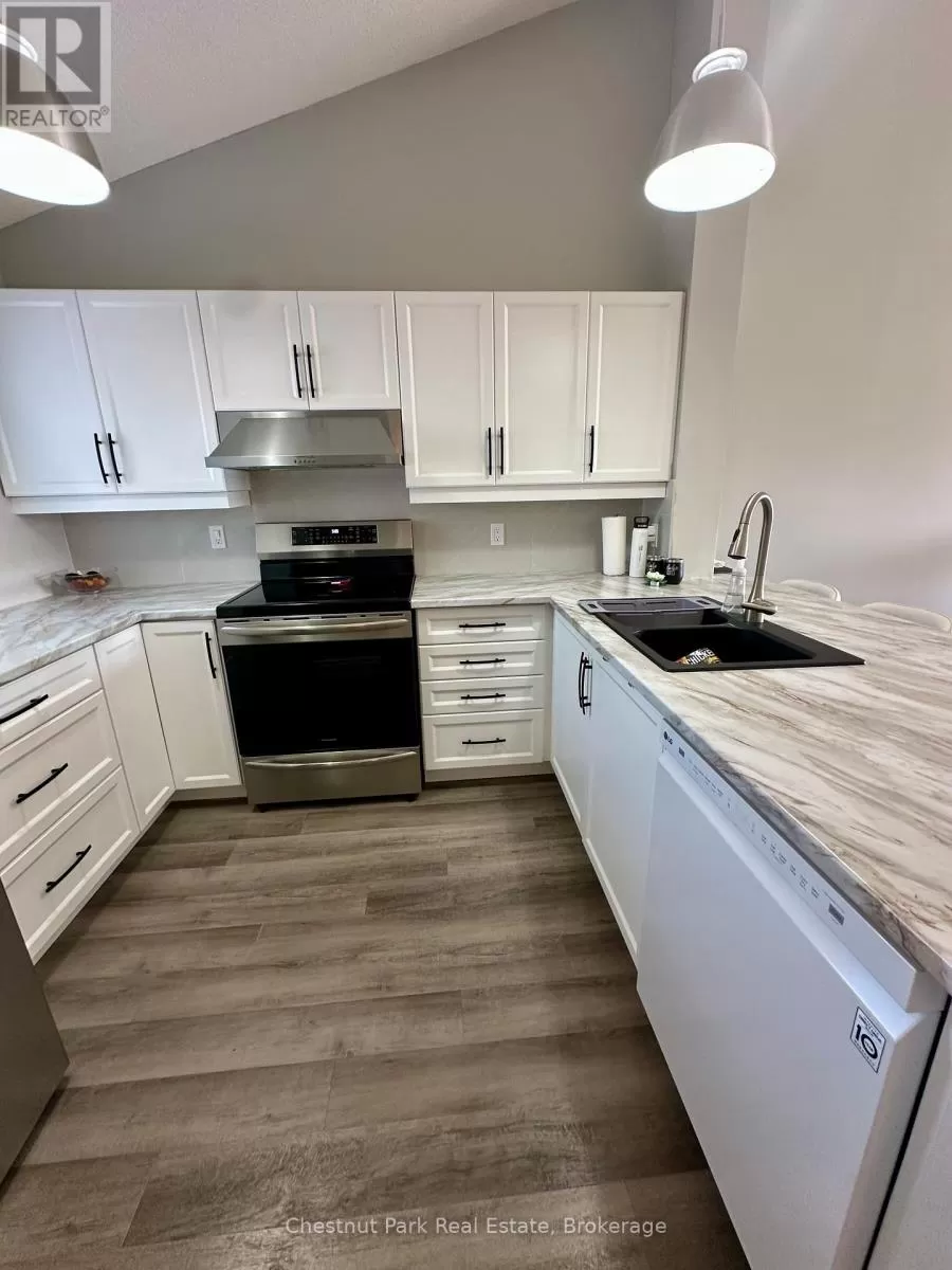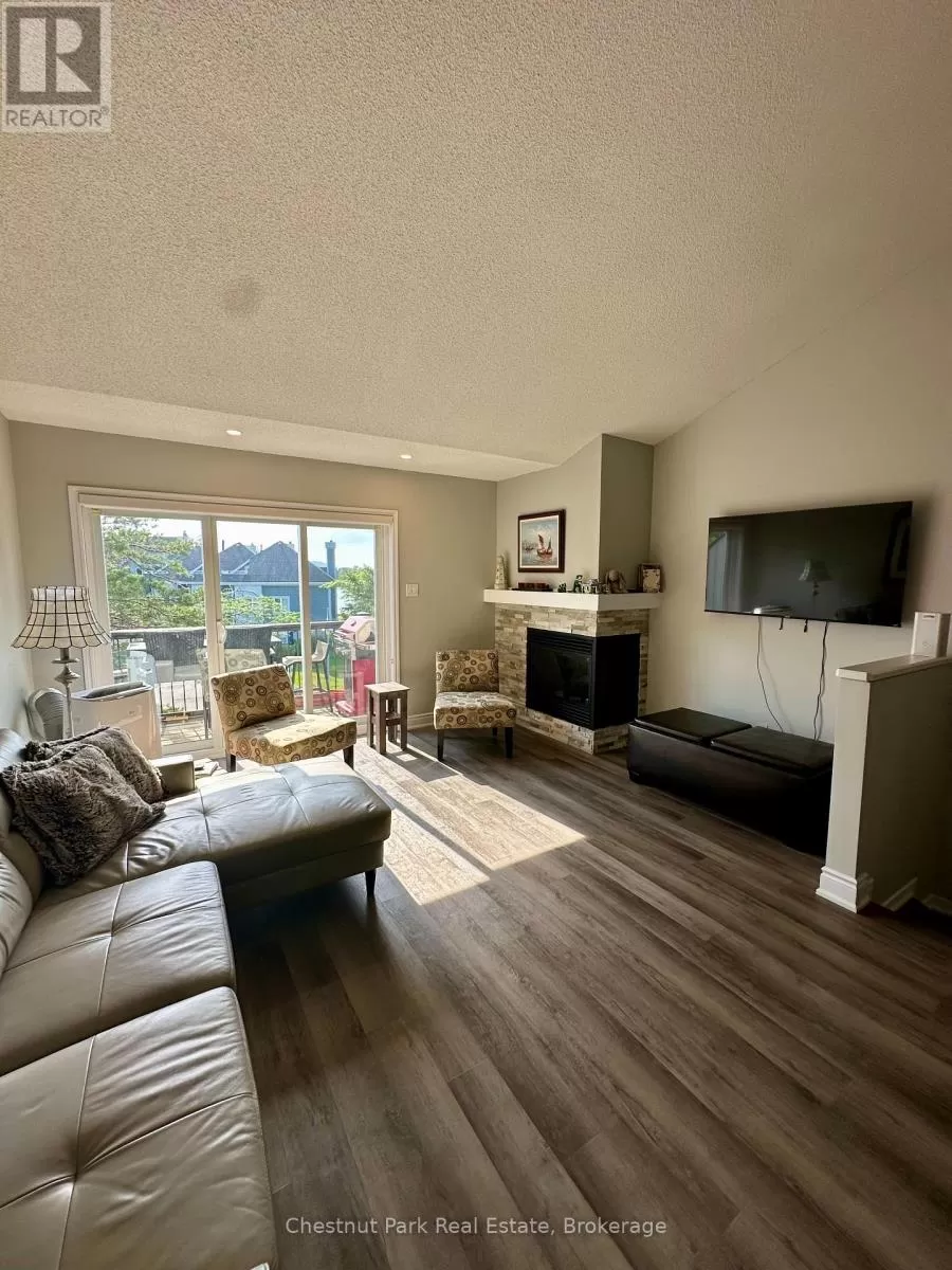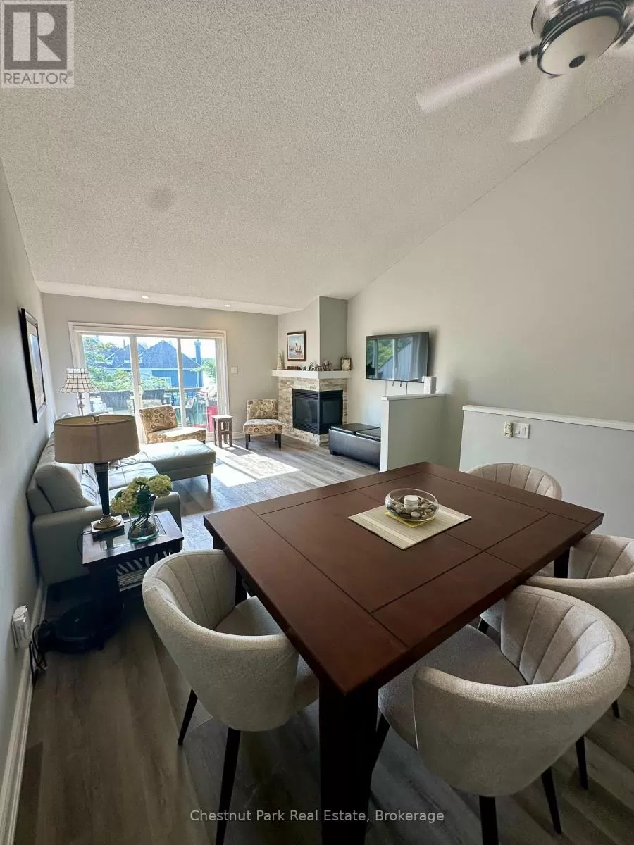 Highway 26 to Lighthouse Point Available for the ski season mid December to mid April, this two-bedroom, two-bathroom condo features a reverse floor plan. The entry is located on the second level, where you will find the bedrooms, a bathroom, and a laundry area. The upper level boasts an open-concept living, dining, and kitchen space with cathedral ceilings, creating an airy atmosphere. Additional amenities include a gas fireplace, a storage/pantry area adjacent to the kitchen, and a two-piece bathroom. The condo has been tastefully remodeled and offers a view of Georgian Bay. Please note that all utilities are additional to the rental rate, and references are required. There is no landline, and pets and smoking are not permitted. (id:27476)