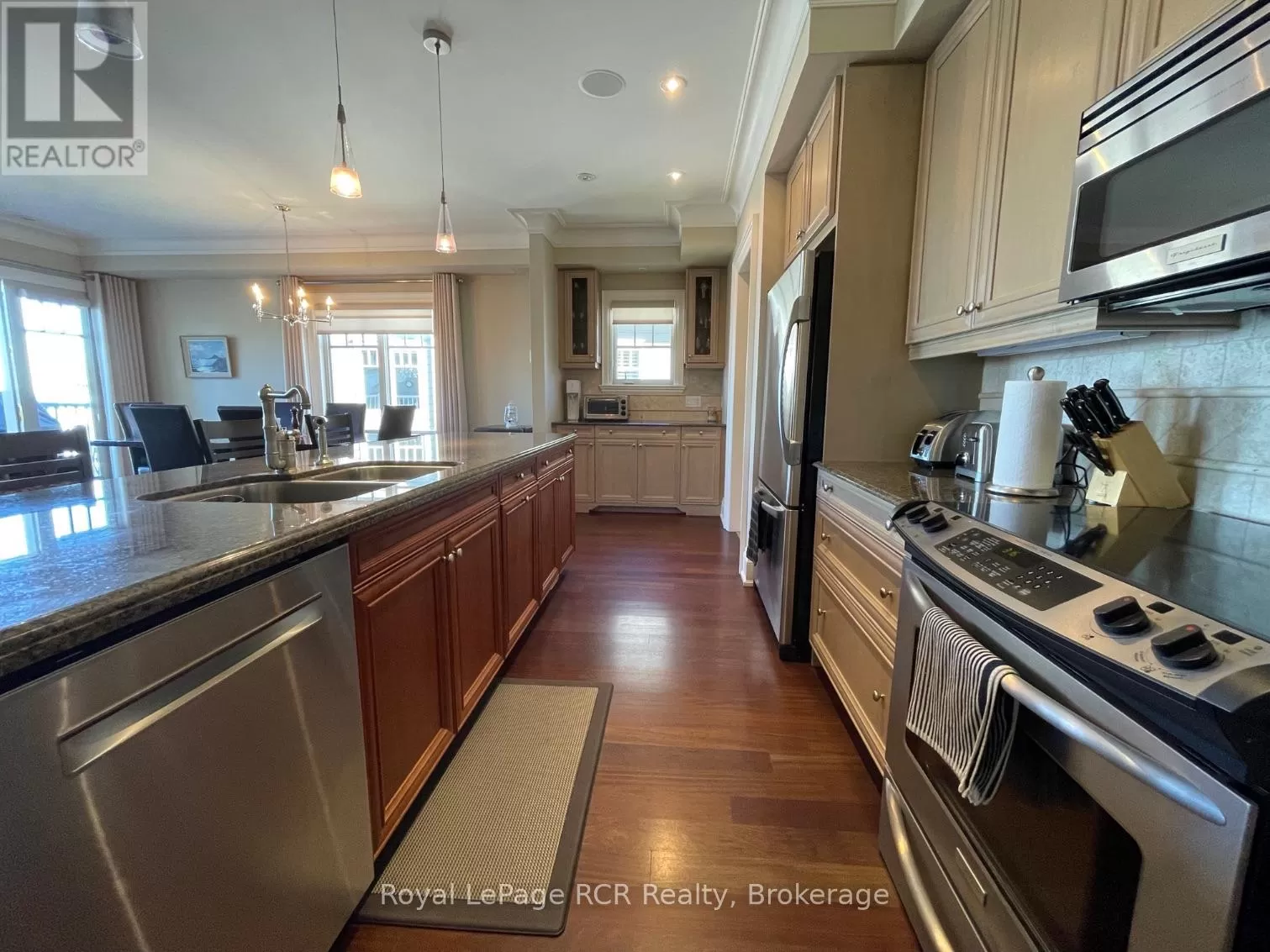 Cross Streets: 26 Hwy/Trott Blvd. ** Directions: 26 Hwy to Trott Blvd, Left into Admiral's gate community, 40 Trott Blvd. SKI SEASON WINTER LEASE! This stunning 3-bedroom, 3.5 bathroom property comes with spectacular GEORGIAN BAY VIEWS! This property is available Oct 1st to May 31st and is located in the prestigious Admiral's Gate. List price is the monthly rate for a 4-month ski season term. Enjoy water views and beautiful sunrises from the open living space, large balcony, upper primary bedroom and covered terrace. Spacious kitchen with oversized kitchen island, dining area and living room with gas fire. Walk out to the deck with a gas BBQ. Features hardwood and limestone floors, granite counters, high-end appliances and a bar fridge. Includes main floor primary bedroom with an ensuite, upstairs second primary suite with a covered terrace overlooking the water, ensuite bath with a soaker tub/shower. The 3rd bedroom has a balcony and an ensuite. There is a workspace/desk for those who need to get some work done. Loads of closet space too! This unit comes with a separate single garage, a reserved outdoor parking space and visitor parking. Enjoy walking trails on Georgian Bay. Close to Blue Mountain, downtown Collingwood, golf, hiking and walking trails and all area amenities. No pets or smoking. Application, references and utility/cleaning/damage deposit required. Don't miss out on this great rental opportunity! (id:27476)