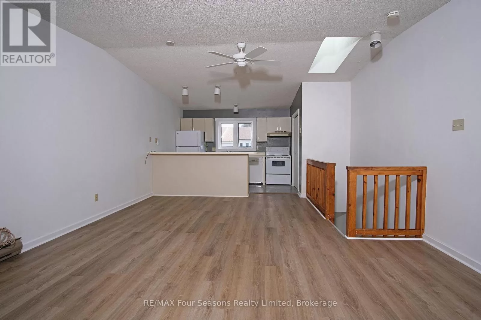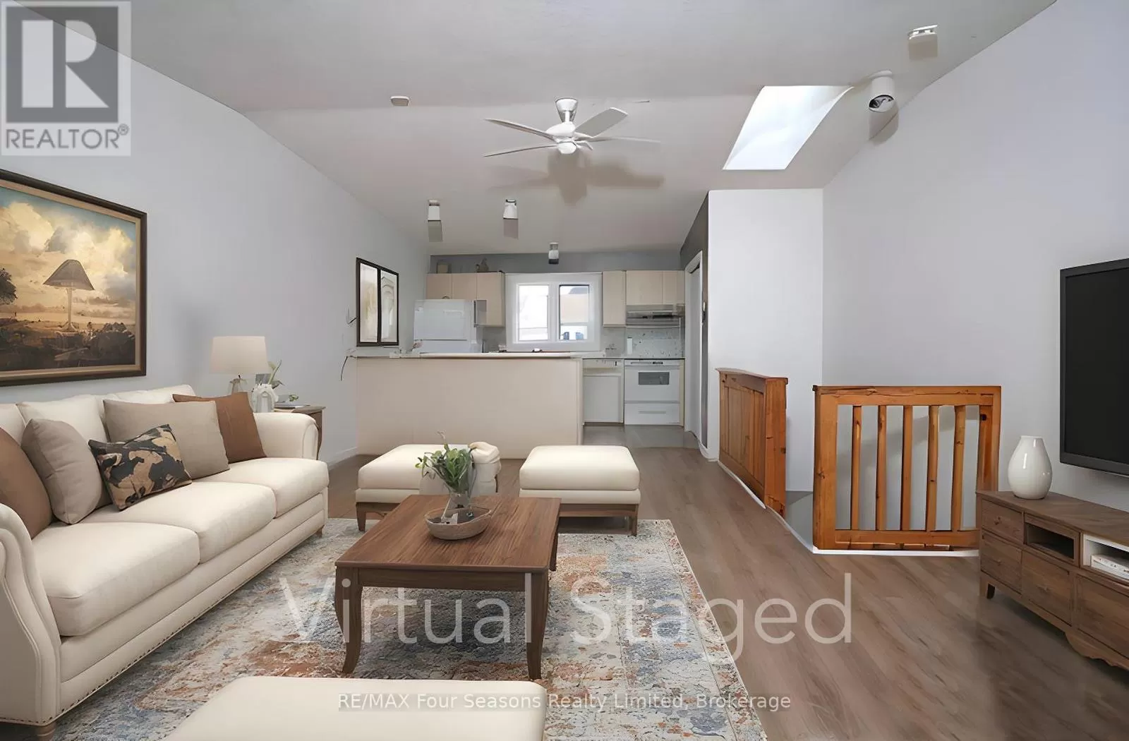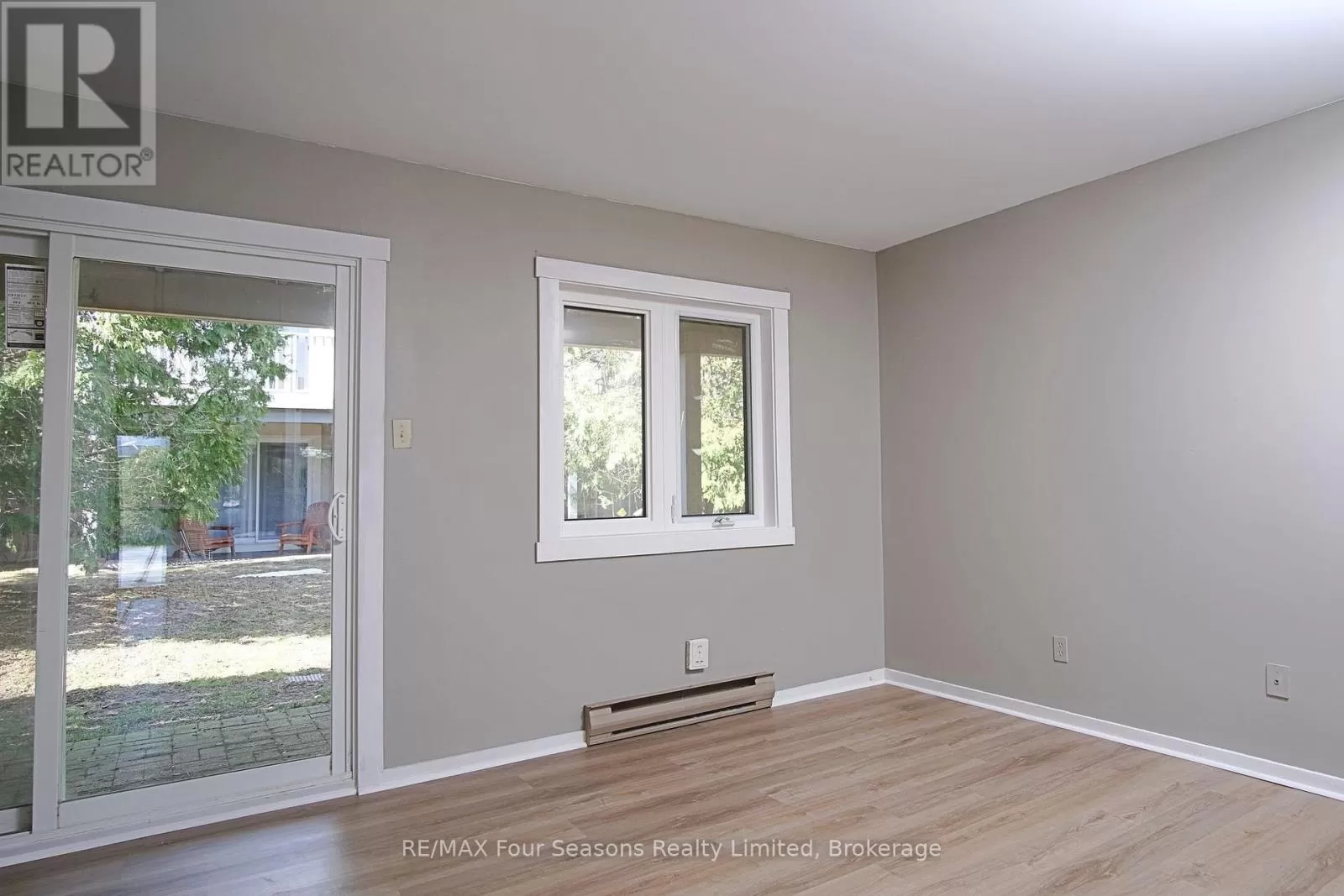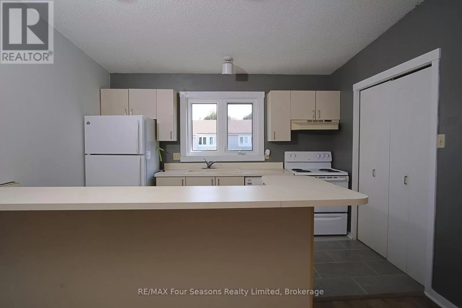 Cross Streets: Harbour St W/Dawson Drive. ** Directions: Hwy 26 to Harbour St W to Dawson Drive. Welcome to this bright and inviting 2-bedroom, 2-bathroom townhouse, designed with a unique reverse floor plan. The upper level is the heart of the home, where vaulted ceilings create an airy feel over the open kitchen, dining, and living areas. A cozy wood-burning fireplace sets the scene for relaxed evenings, while a patio door leads to a private balcony perfect for morning coffee or unwinding outdoors. At the entry level, you'll find two comfortable bedrooms, including a spacious primary suite with its own en-suite bath and direct access to a private patio. Recent updates such as new flooring and fresh paint provide a clean canvas for you to add your personal style. Practical touches include in-suite laundry hookups and an assigned parking space just steps from your door. With its thoughtful layout and welcoming atmosphere, this townhouse offers a wonderful opportunity to enjoy comfortable, low-maintenance living. Don't miss your chance to make this charming townhome your own! (id:27476)