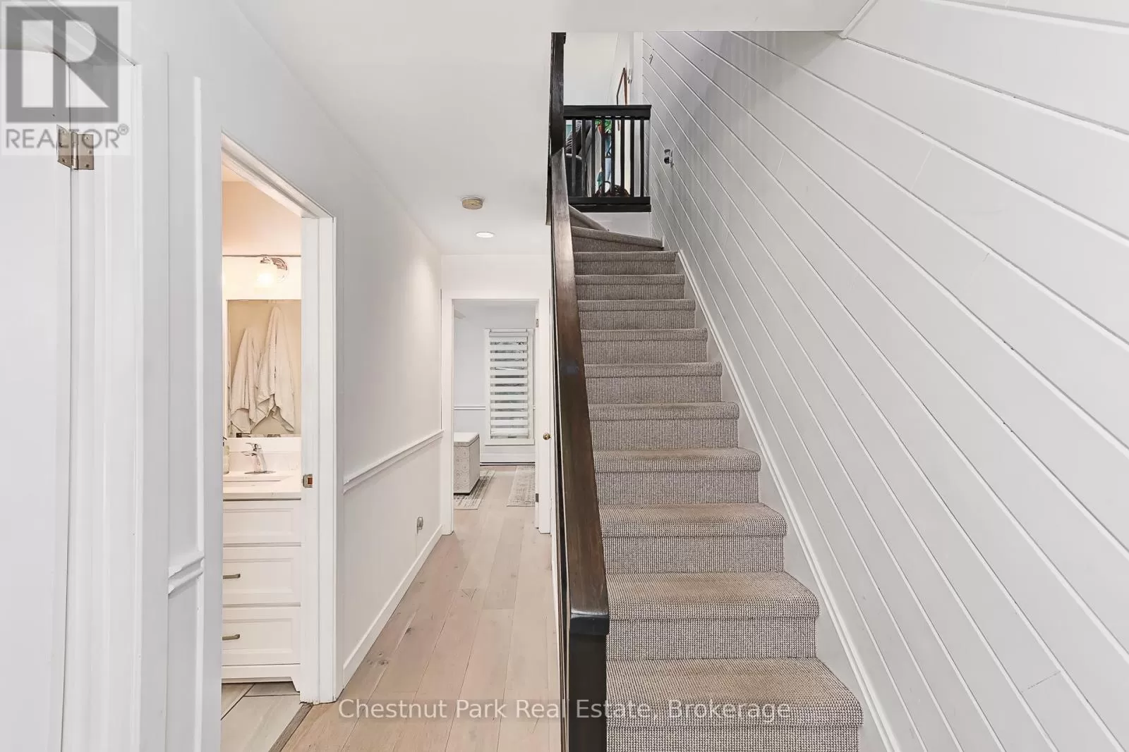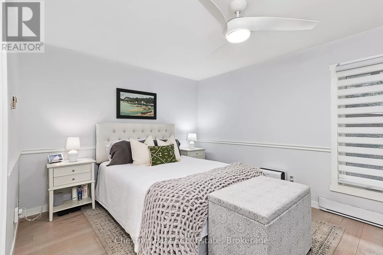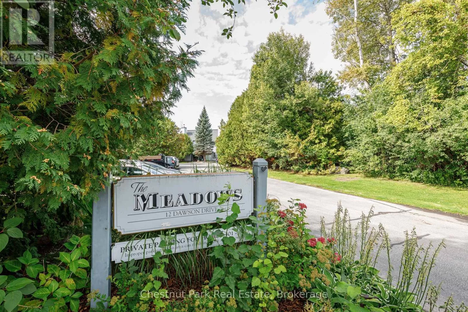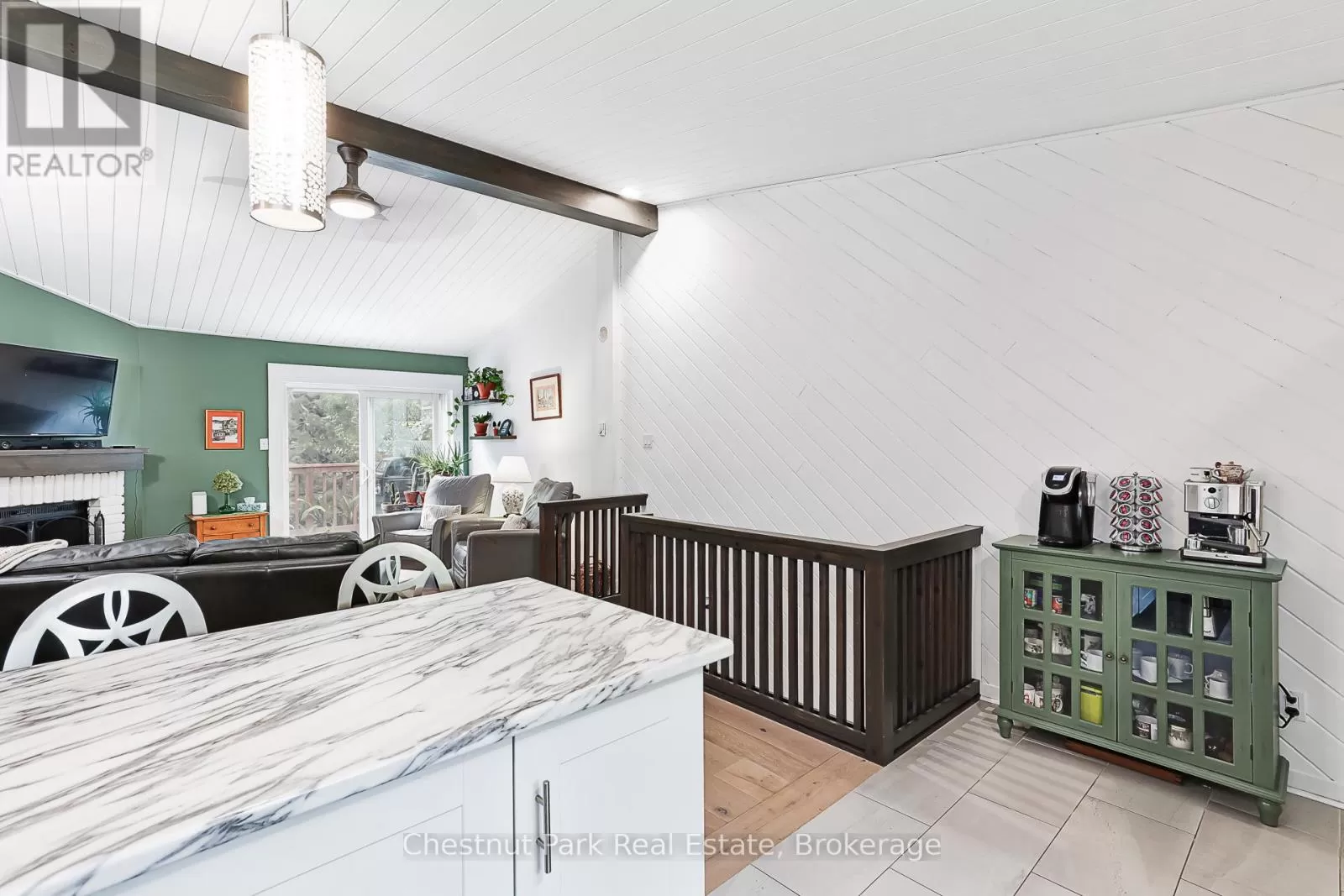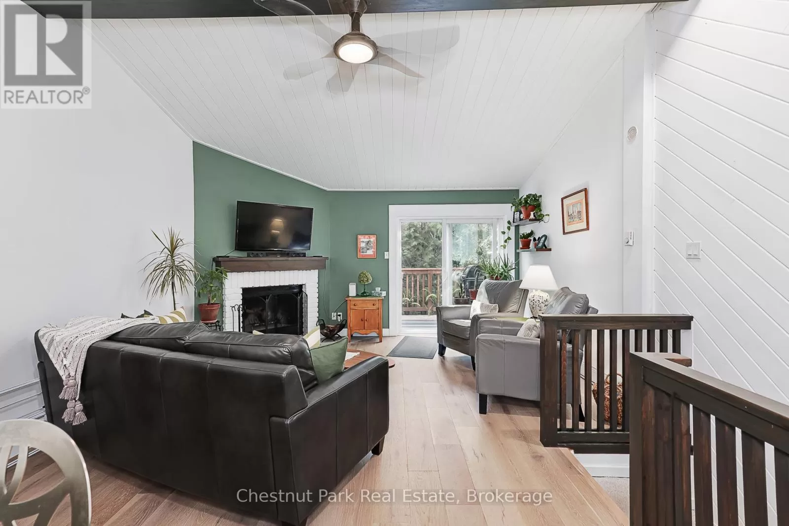 Cross Streets: Hwy 26. ** Directions: Hwy 26 W to Harbour or Keith to Dawson (Meadows). This beautifully updated two-bedroom, two-bathroom condominium is ideally located just a short drive from local beaches, exceptional hiking trails, Blue Mountain, and downtown Collingwood. Thoughtfully designed with a reverse floorplan, the unit features a spacious primary bedroom complete with a four-piece ensuite bathroom. An additional bedroom and bathroom are conveniently situated on the main level. The upper floor showcases a bright, open-concept kitchen, living, and dining area, highlighted by cathedral ceilings, a cozy wood-burning fireplace, and access to a large private deck. This unit has been completely updated from top to bottom, boasting engineered hardwood flooring throughout, as well as modernized bathrooms and a kitchen with ample cupboard space. A must-see to truly appreciate! ALSO LISTED FOR ANNUAL LEASE MLS S12394926 (id:27476)