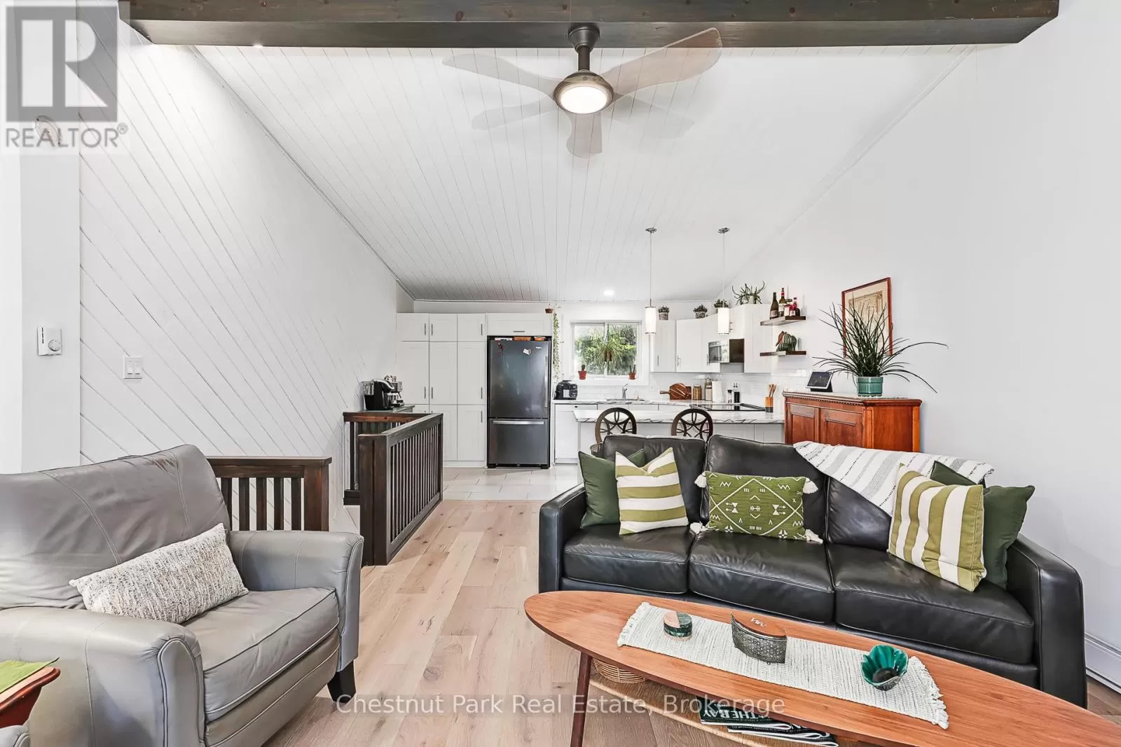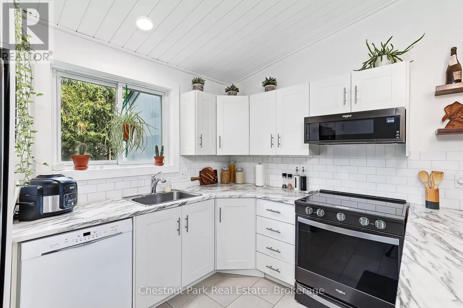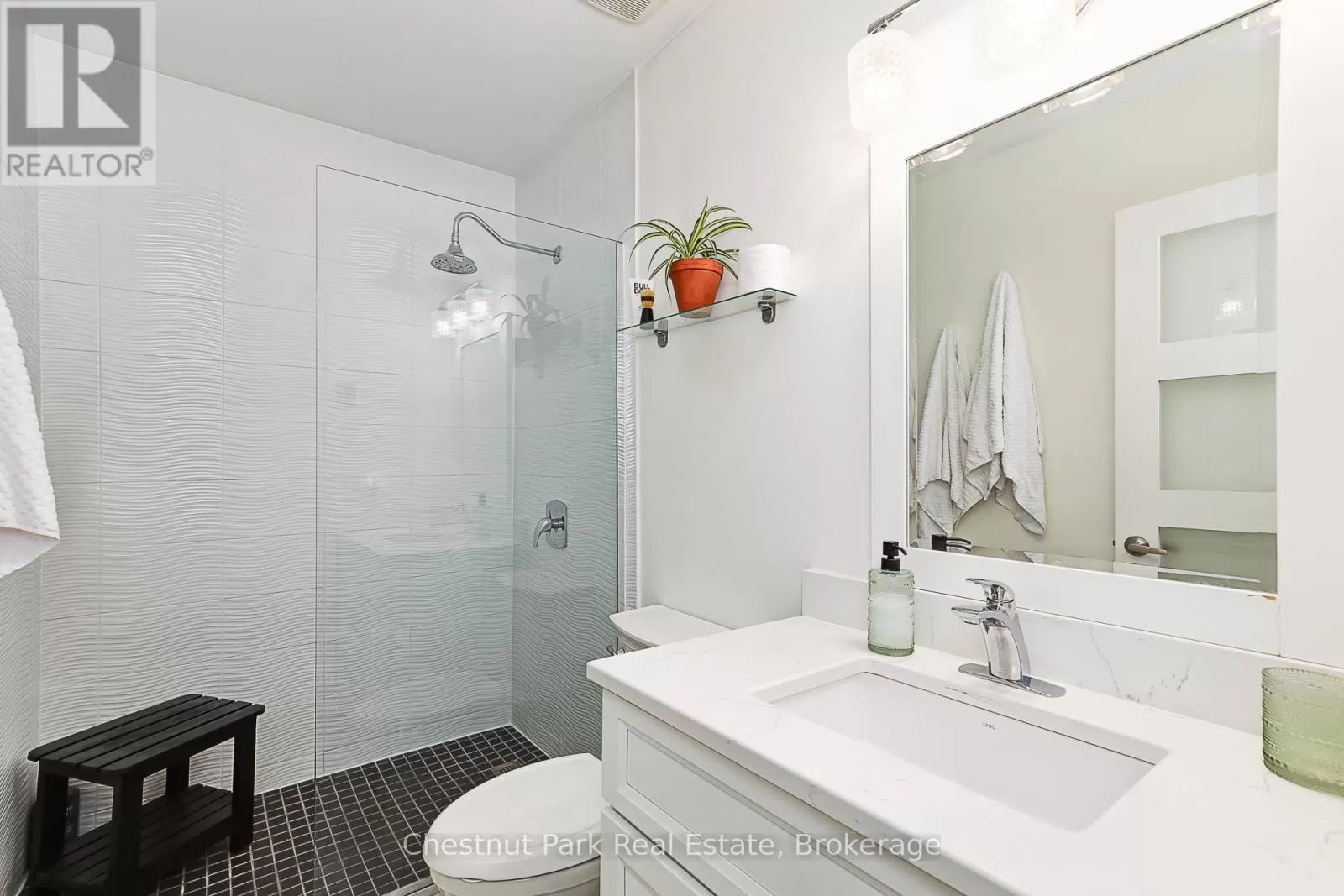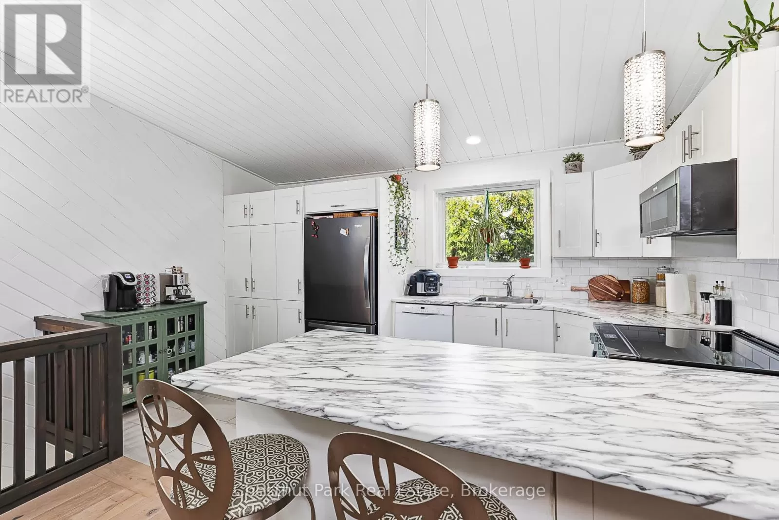 Cross Streets: Hwy 26. ** Directions: Hwy 26 W to Harbour or Keith to Dawson (Meadows). This beautifully updated two-bedroom, two-bathroom condominium is ideally located just a short drive from local beaches, exceptional hiking trails, Blue Mountain, and downtown Collingwood. Thoughtfully designed with a reverse floorplan, the unit features a spacious primary bedroom complete with a four-piece ensuite bathroom. An additional bedroom and bathroom are conveniently situated on the main level. The upper floor showcases a bright, open-concept kitchen, living, and dining area, highlighted by cathedral ceilings, a cozy wood-burning fireplace, and access to a large private deck. This unit has been completely updated from top to bottom, boasting engineered hardwood flooring throughout, as well as modernized bathrooms and a kitchen with ample cupboard space. A must-see to truly appreciate! ALSO LISTED FOR ANNUAL LEASE MLS S12394926 (id:27476)