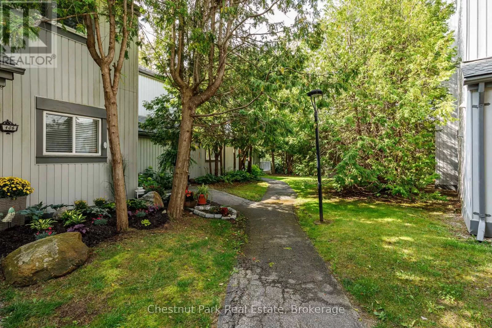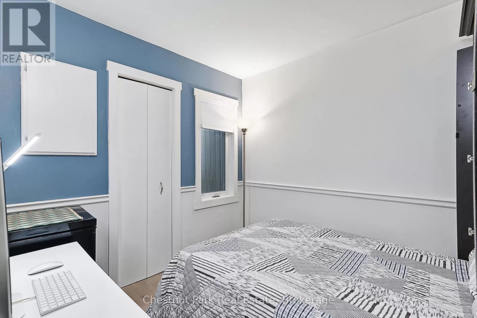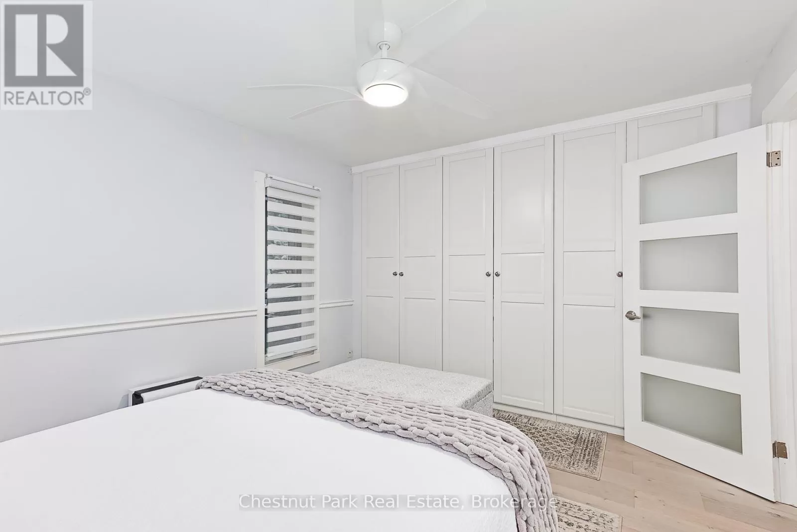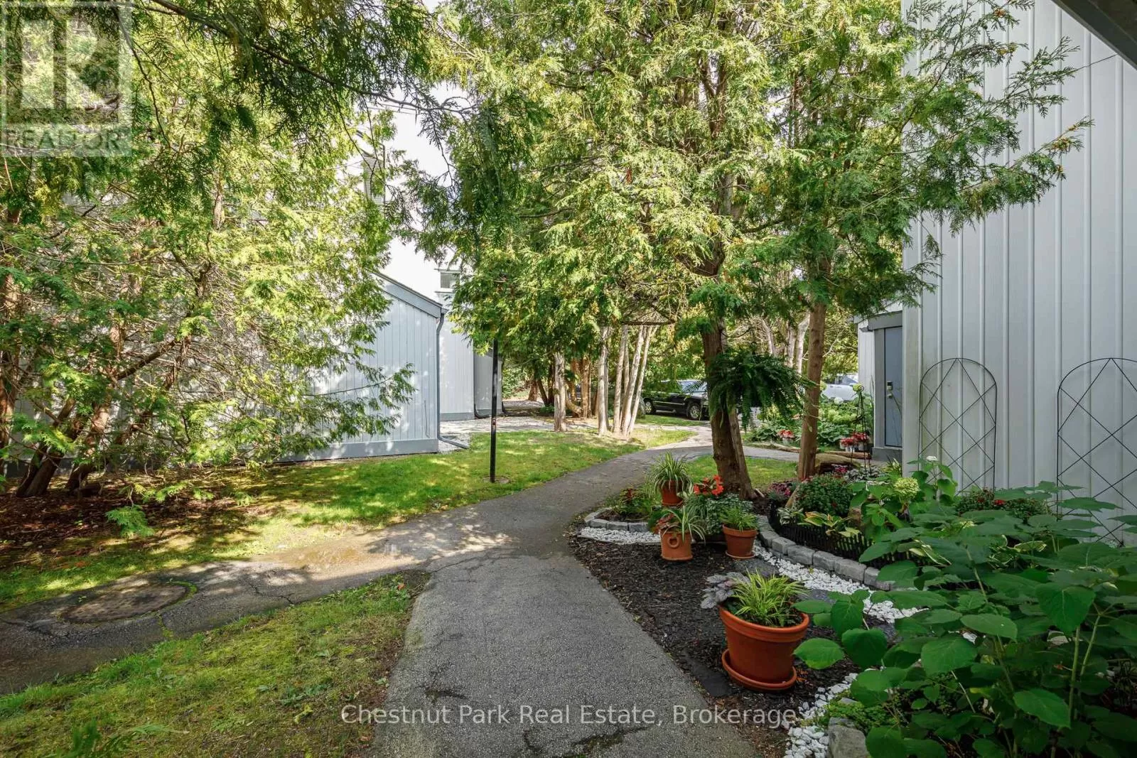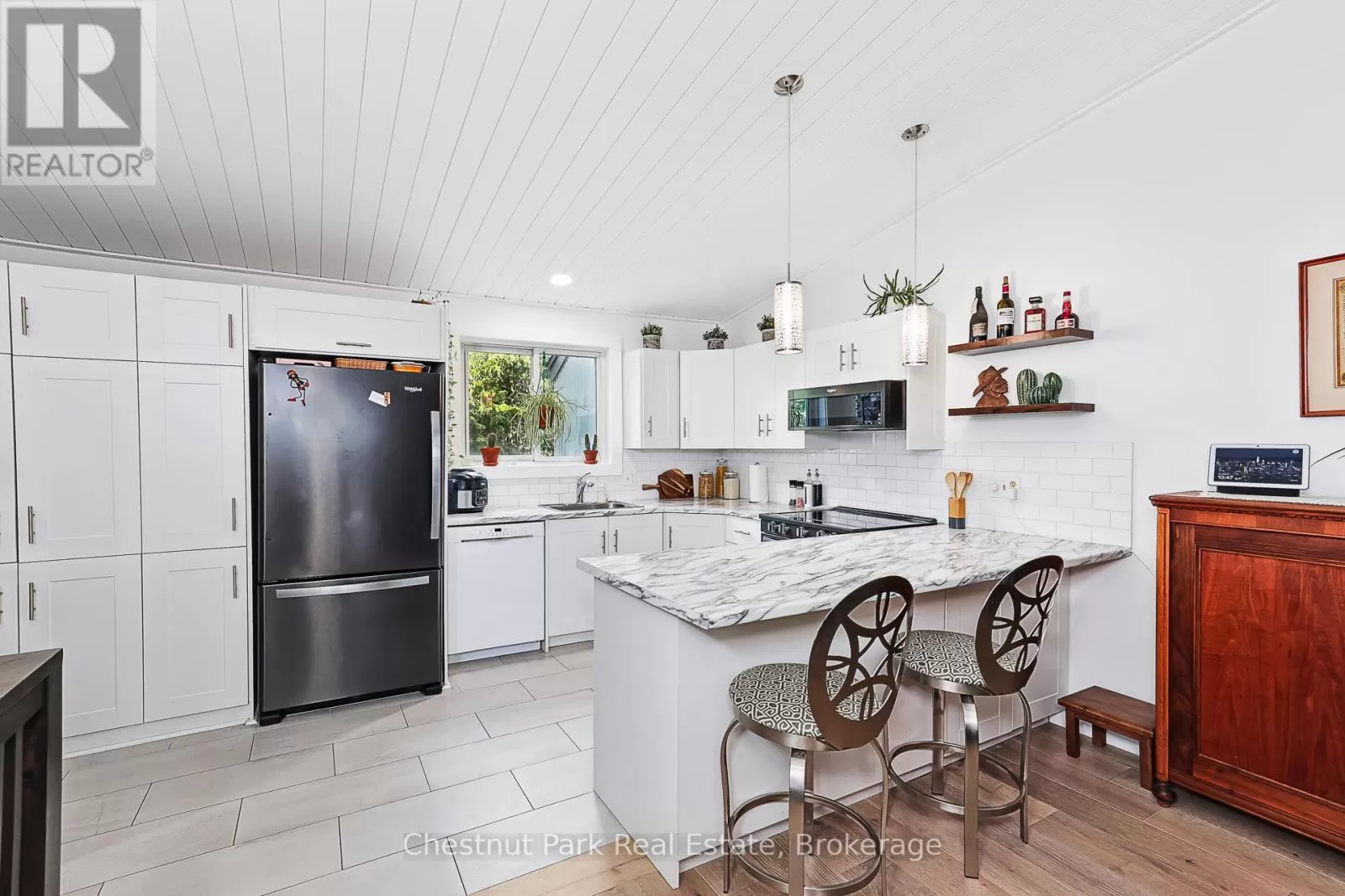 Cross Streets: Hwy 26. ** Directions: Hwy 26 W to Harbour or Keith to Dawson (Meadows). This beautifully updated two-bedroom, two-bathroom condominium is ideally located just a short drive from local beaches, exceptional hiking trails, Blue Mountain, and downtown Collingwood. Thoughtfully designed with a reverse floorplan, the unit features a spacious primary bedroom complete with a four-piece ensuite bathroom. An additional bedroom and bathroom are conveniently situated on the main level. The upper floor showcases a bright, open-concept kitchen, living, and dining area, highlighted by cathedral ceilings, a cozy wood-burning fireplace, and access to a large private deck. This unit has been completely updated from top to bottom, boasting engineered hardwood flooring throughout, as well as modernized bathrooms and a kitchen with ample cupboard space. A must-see to truly appreciate! ALSO LISTED FOR ANNUAL LEASE MLS S12394926 (id:27476)