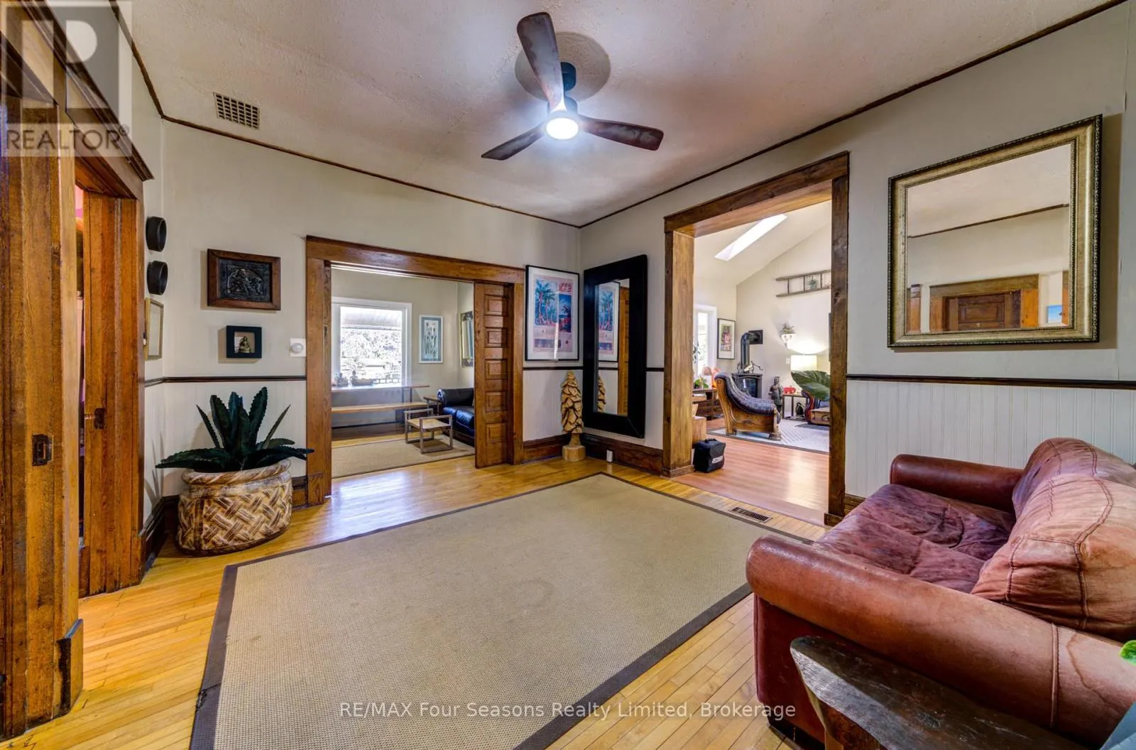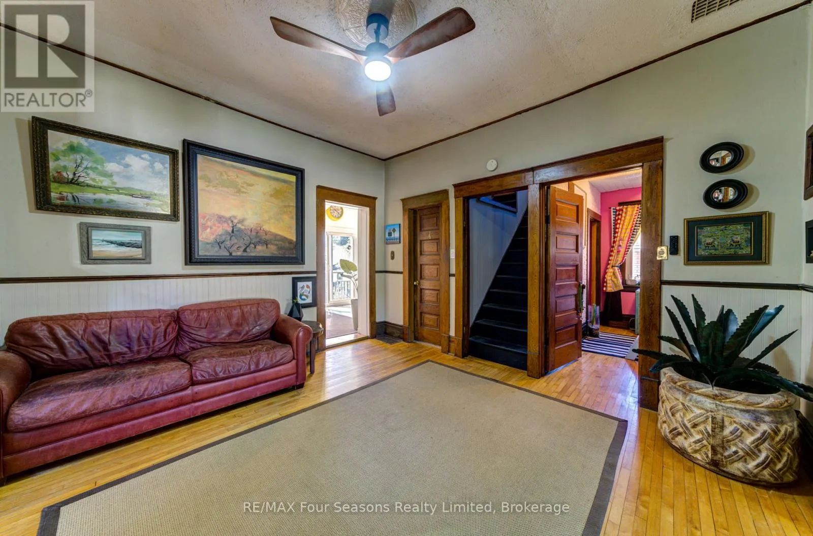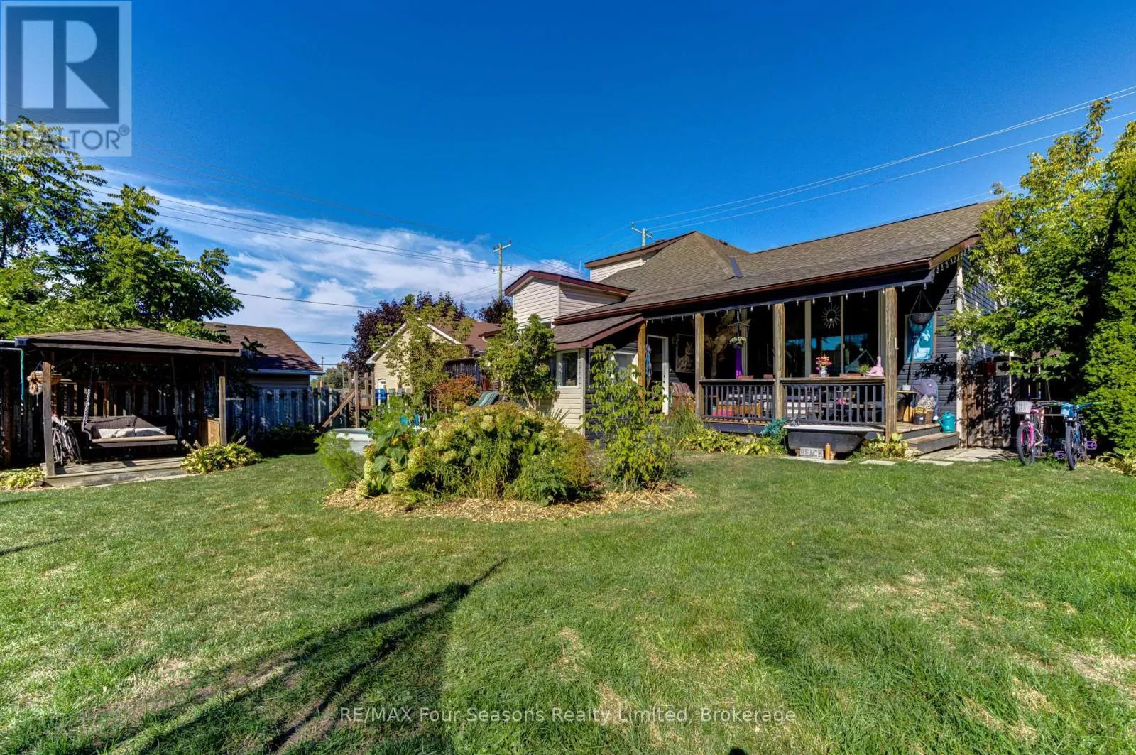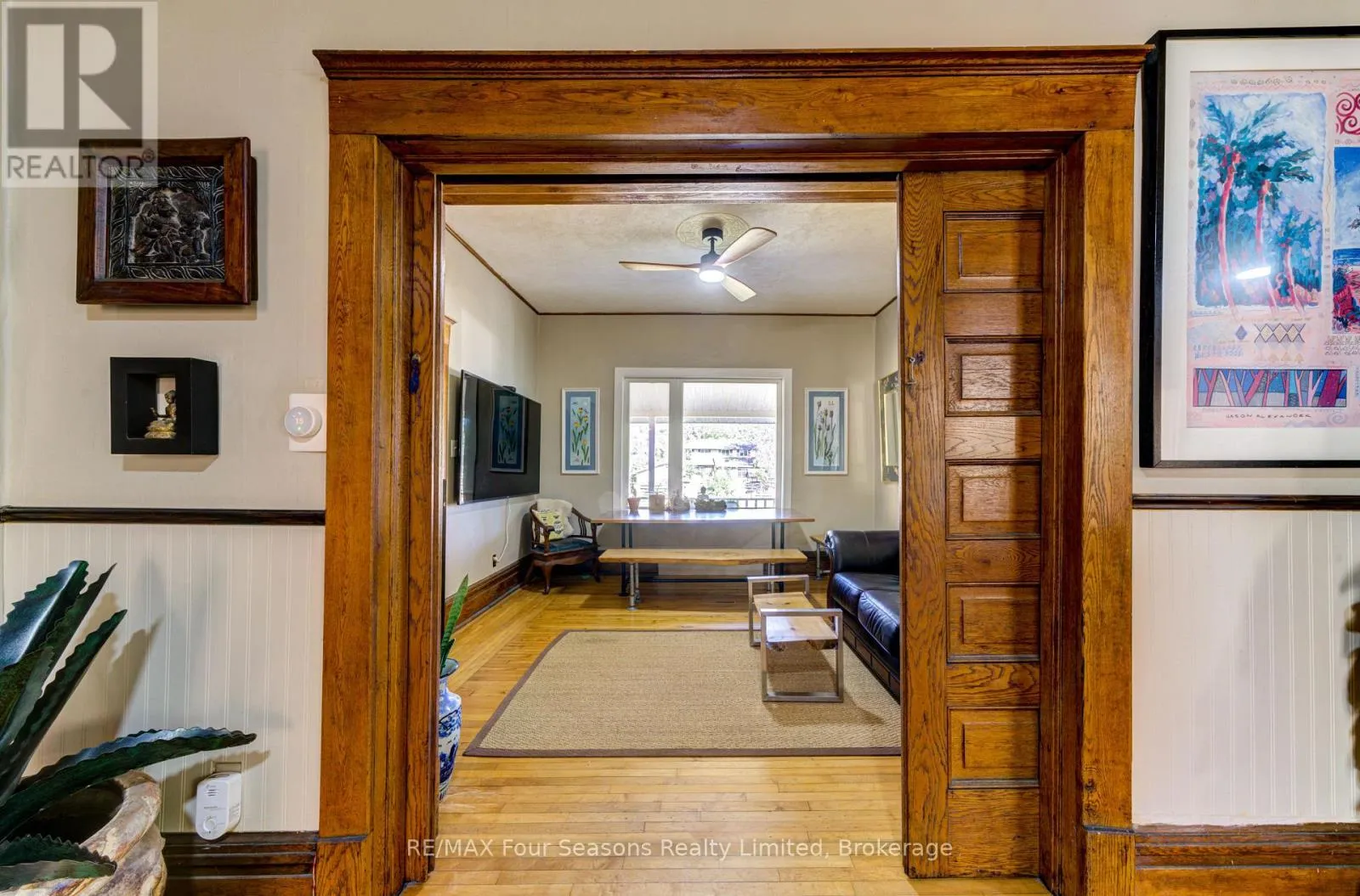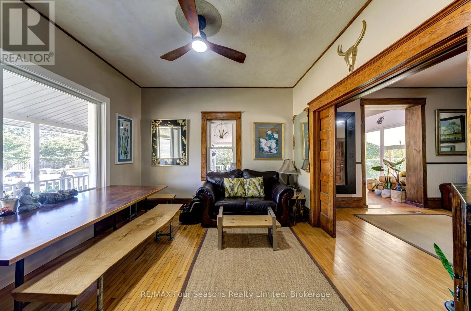 Cross Streets: Hurontario and Campbell. ** Directions: Hurontario to Campbell. Fantastic location only a 10 minute walk to downtown and 5 minute walk to your choice of 2 elementary schools and two high schools. Lovely well maintained century home has features of the time. High ceilings, pocket doors, hardwood flooring and beautiful trim. This 4 bedroom home offers a great opportunity for the first time buyer. A large covered deck on the front leads to the main entry door opening into a huge bright family room with cathedral ceilings and gas fireplace. Large living room with pocket doors leads off to the primary bedroom, den, kitchen and further bedroom. Two further bedrooms upstairs. A fully fenced backyard with gazebo, covered porch and sunroom make this a great backyard entertainment area. Many upgrades include windows, sliding door, furnace replaced in 2021, tankless hot water heater, upgraded electrical panel, dishwasher and double sinks, new roof in 2019. Paved three car driveway. (id:27476)