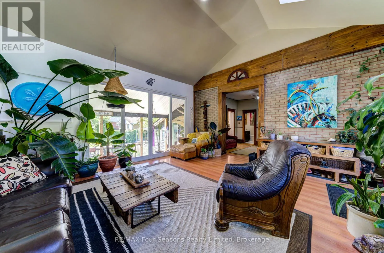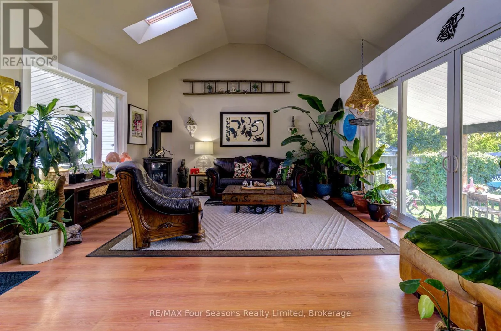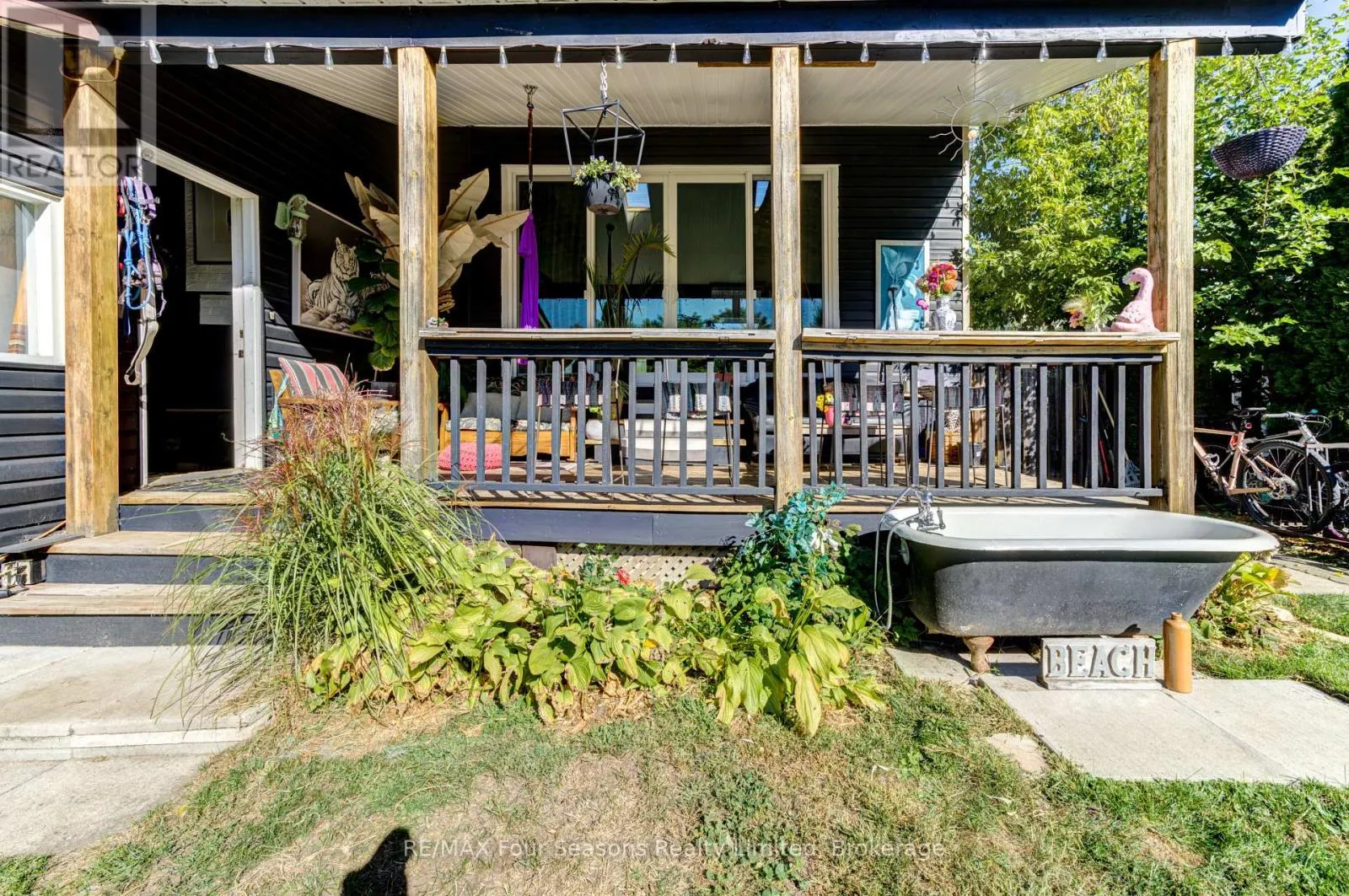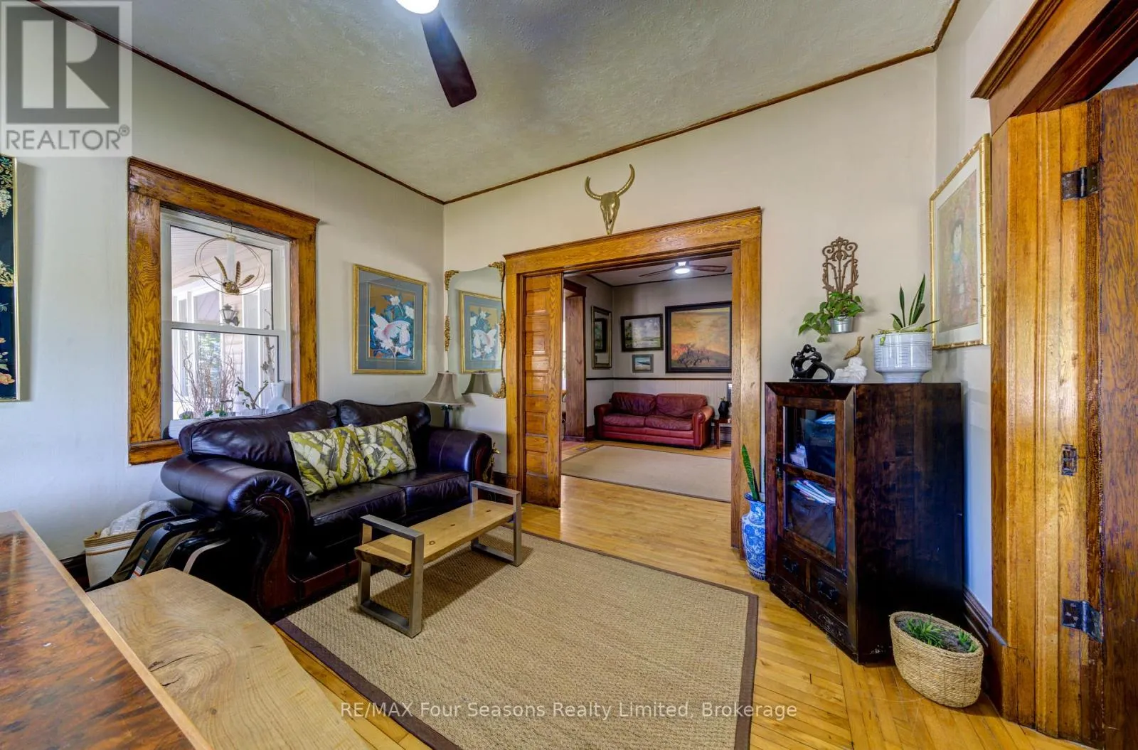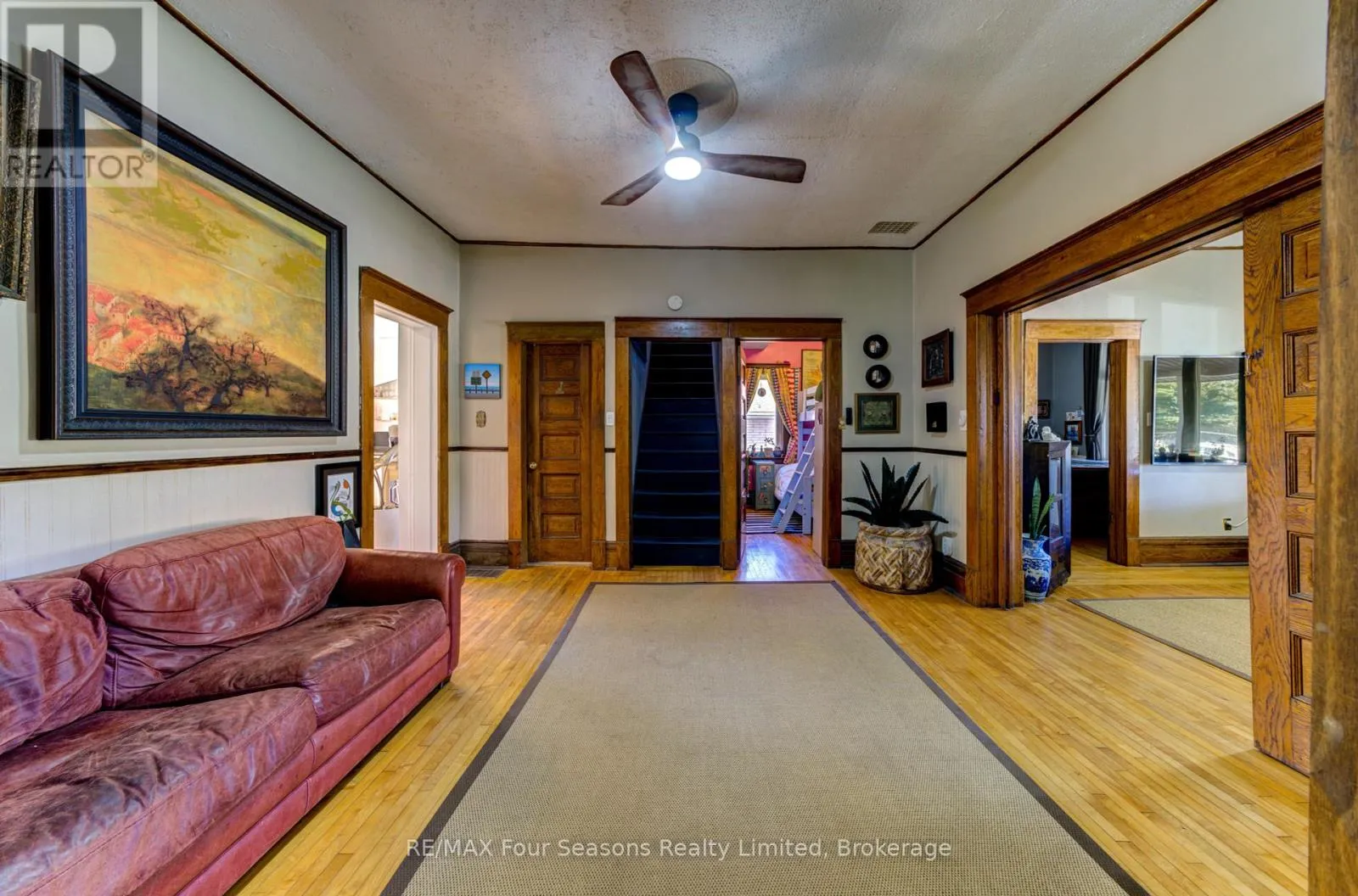 Cross Streets: Hurontario and Campbell. ** Directions: Hurontario to Campbell. Fantastic location only a 10 minute walk to downtown and 5 minute walk to your choice of 2 elementary schools and two high schools. Lovely well maintained century home has features of the time. High ceilings, pocket doors, hardwood flooring and beautiful trim. This 4 bedroom home offers a great opportunity for the first time buyer. A large covered deck on the front leads to the main entry door opening into a huge bright family room with cathedral ceilings and gas fireplace. Large living room with pocket doors leads off to the primary bedroom, den, kitchen and further bedroom. Two further bedrooms upstairs. A fully fenced backyard with gazebo, covered porch and sunroom make this a great backyard entertainment area. Many upgrades include windows, sliding door, furnace replaced in 2021, tankless hot water heater, upgraded electrical panel, dishwasher and double sinks, new roof in 2019. Paved three car driveway. (id:27476)
