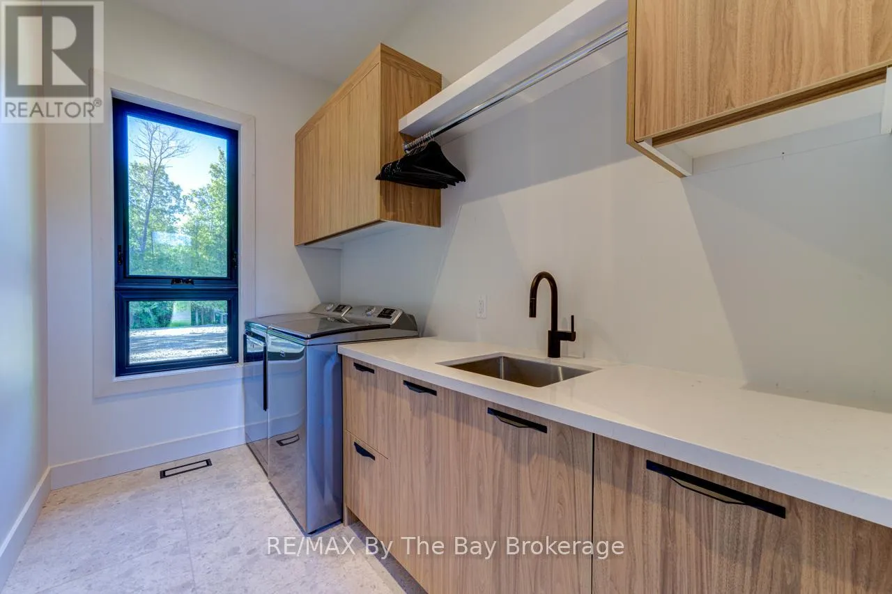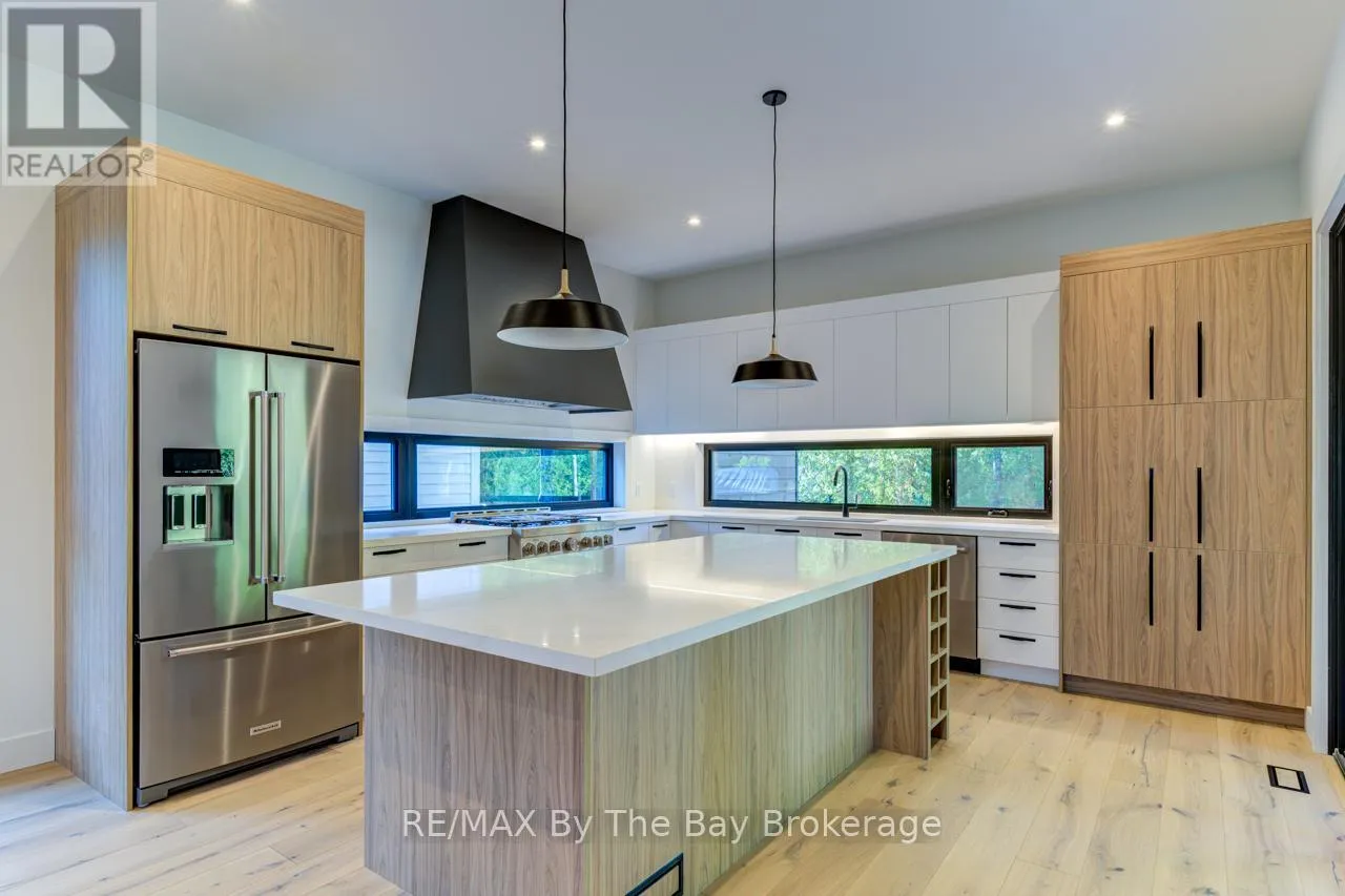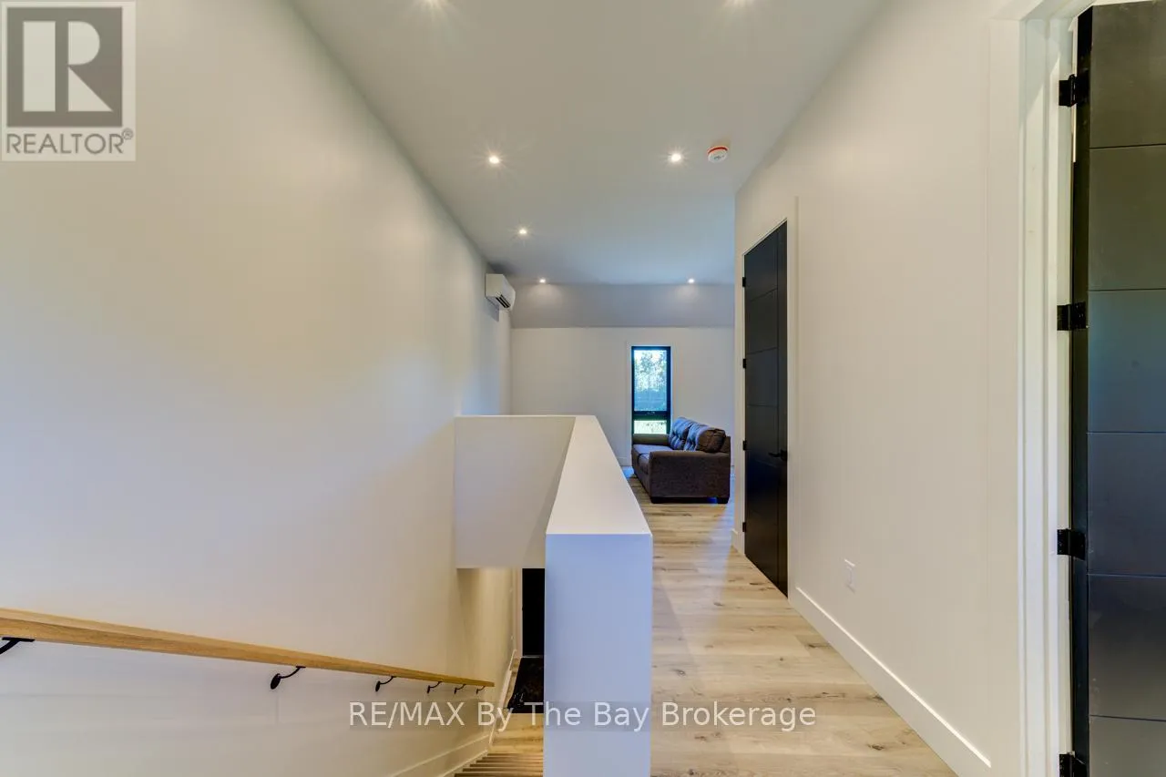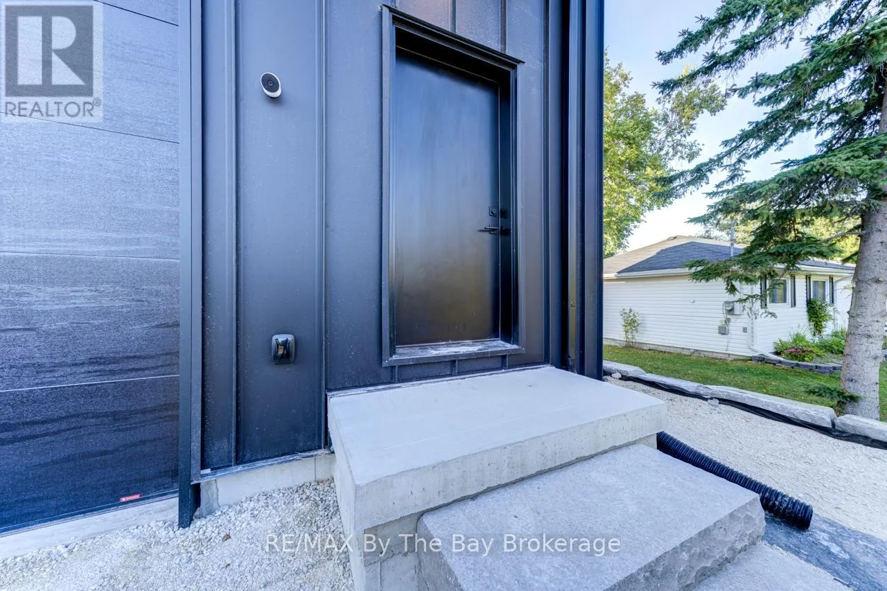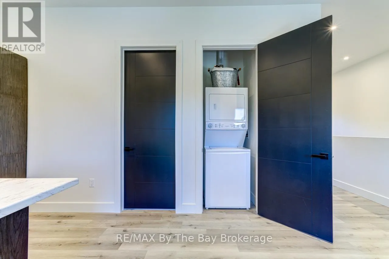 Cross Streets: Beachwood Rd. ** Directions: South on Beachwood Rd, Right onto Broadview Street, Property will be on your Right. Welcome to a masterpiece of modern design and meticulous craftsmanship. This luxurious Scandinavian-style residence, nestled on a generous 90ft by 200ft lot in Collingwood offers an unparalleled blend of elegance and functionality. The home's striking exterior features a sophisticated fusion of Scandinavian Spruce wood siding and 24-gauge standing seam steel siding and roof, crowned with a 50-year warranty. Step through the grand 40" front door into an impressively crafted entrance with heated floors. A well-appointed main floor laundry room, with Whirlpool appliances. The open-concept living, dining, and kitchen area exudes luxury with its 7.5" Muskoka Custom Finishing hardwood floors, a Napoleon fireplace, and a dramatic dark tile feature wall. The chef's kitchen is a culinary haven, showcasing high-end KitchenAid smart appliances and a Moen touch-less, WiFi-capable faucet. Adjacent to the kitchen, an office with pocket doors and access to the rear covered deck. The custom staircase by Stairhaus Inc. makes a stunning architectural statement, guiding you to the upper level. Here, a spacious family room complements 3 beautifully appointed bedrooms. The primary suite is a luxurious sanctuary, featuring a walk-in closet and a 6pc private ensuite, plus a walkout to a covered Duradek waterproof deck. A 4pc semi-ensuite bathroom and a thoughtfully designed 2pc bathroom on the main floor cater to both privacy and convenience. Above the garage, a legal second-dwelling apartment presents an excellent opportunity for additional income or guest accommodation. With its own private entrance, this charming apartment features an open-concept living, dining, and kitchen area with Frigidaire appliances, a stackable washer and dryer, a cozy bedroom, and a stylish 3pc bathroom. A set of 9ft x 10ft garage doors with drive-through provides an ample amount of garage and storage needs. This custom-built Scandinavian-style home stands as a testament to superior quality and refined livin (id:27476)
