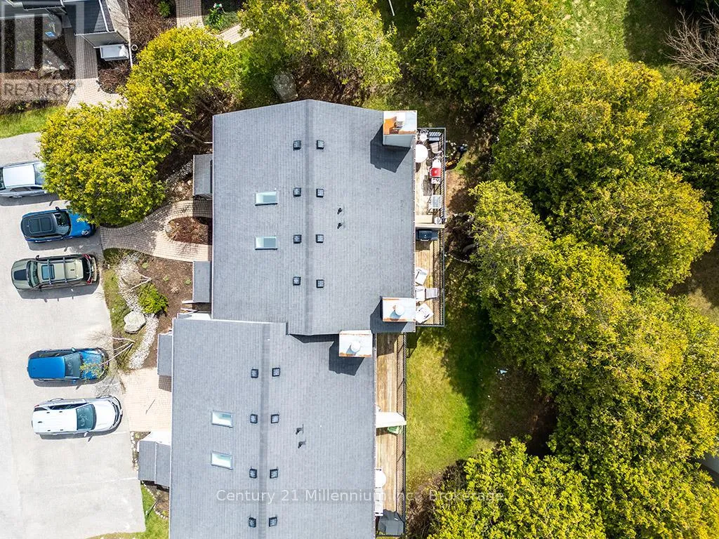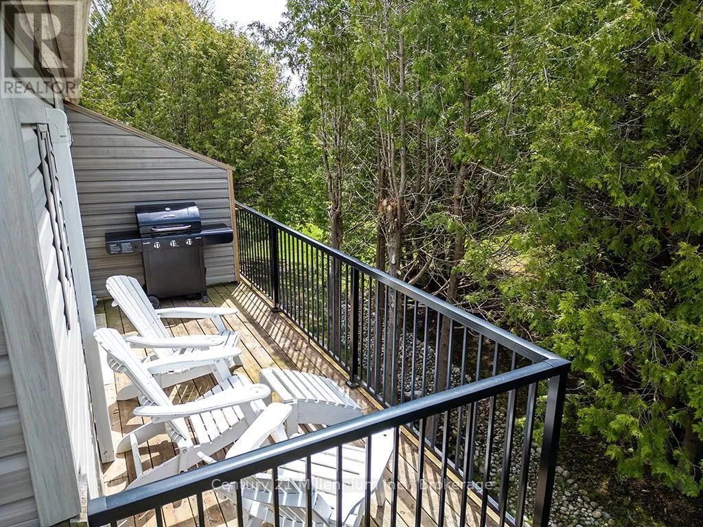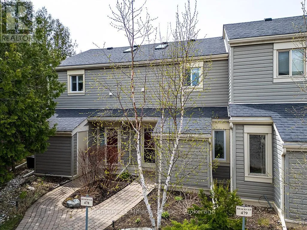 Cross Streets: Dawson Drive & Oxbow Crescent. ** Directions: From Canadian Tire in Collingwood, head West on Highway 26 towards Thornbury, turn left on Keith, Right on Dawson, Left on Oxbow to 479 Oxbow Cres. The perfect home or getaway in Collingwood - Ontario's Four Season playground. This remarkable condo townhome is located in Living Stone Community (formerly Cranberry) - close to waterfront, trails, golf, beaches and ski hills. Enjoy a reverse floor plan with a bright and open upper main floor - featuring vaulted ceilings with a sky light, a cozy wood burning fireplace, and a large private balcony backing onto mature trees. The ground floor offers two sizeable bedrooms and two updated four-piece bathrooms with a recently installed walkout to your private deck from the primary bedroom. Ample storage is available under the stairs and in your exterior personal shed. Control your temperature efficiently with 2 recently installed ductless cooling and heat pump systems - one on each floor, plus baseboard heaters for backup. A rare opportunity for a lovingly maintained home with reasonable condo fees, a well managed community, visitor parking, and beautiful, mature trees surrounding the property. Your Collingwood Lifestyle awaits! (id:27476)
