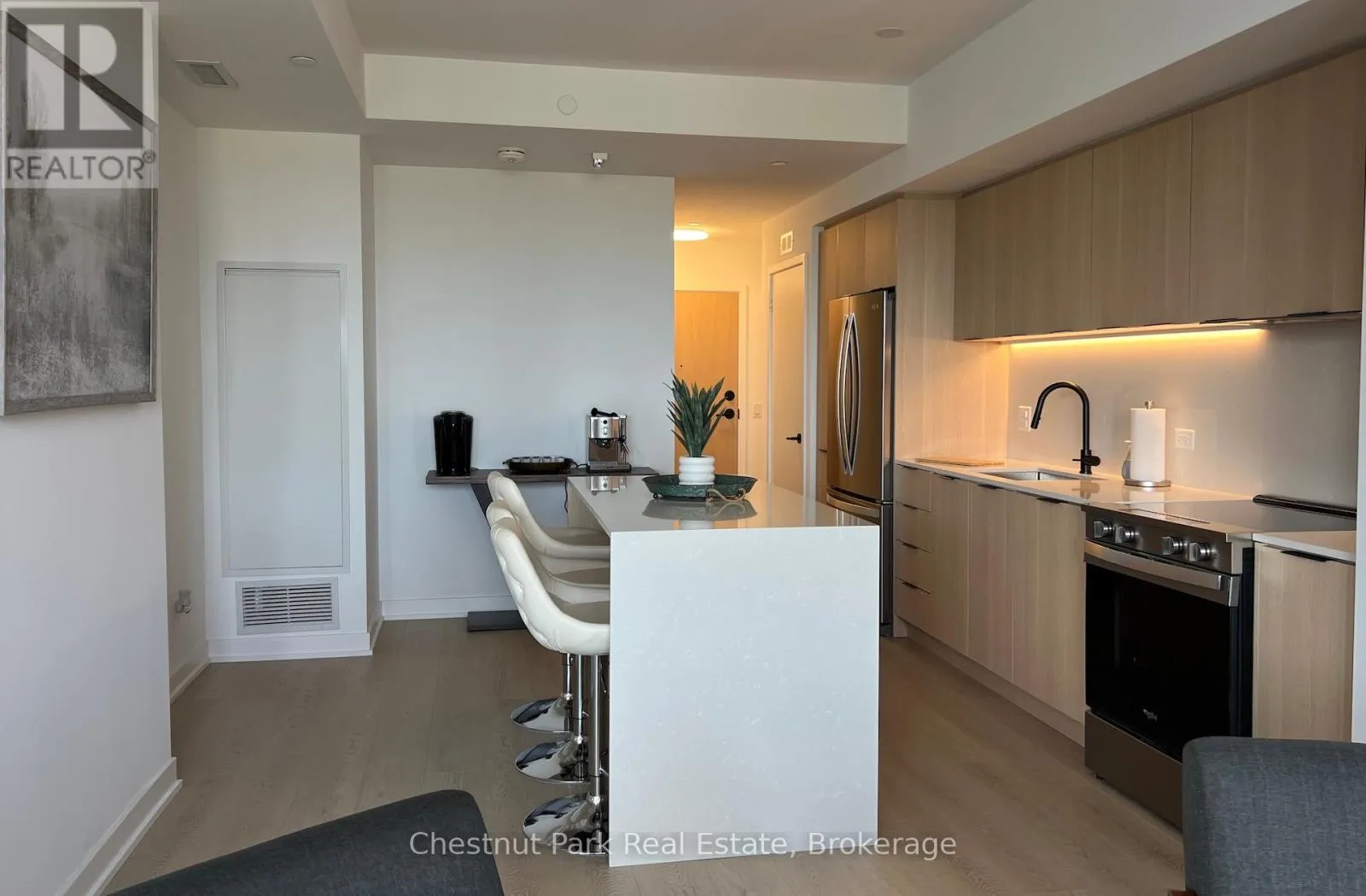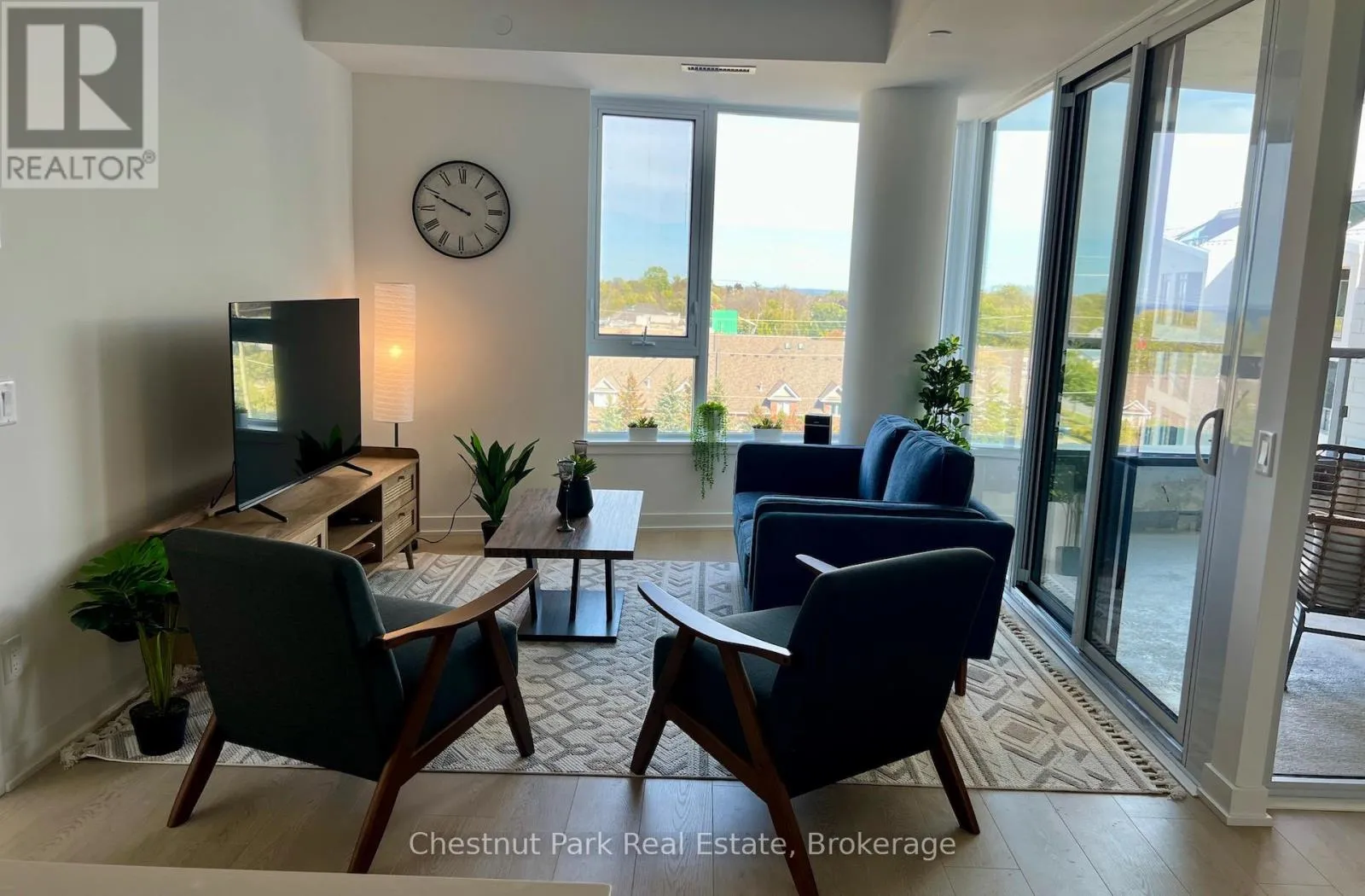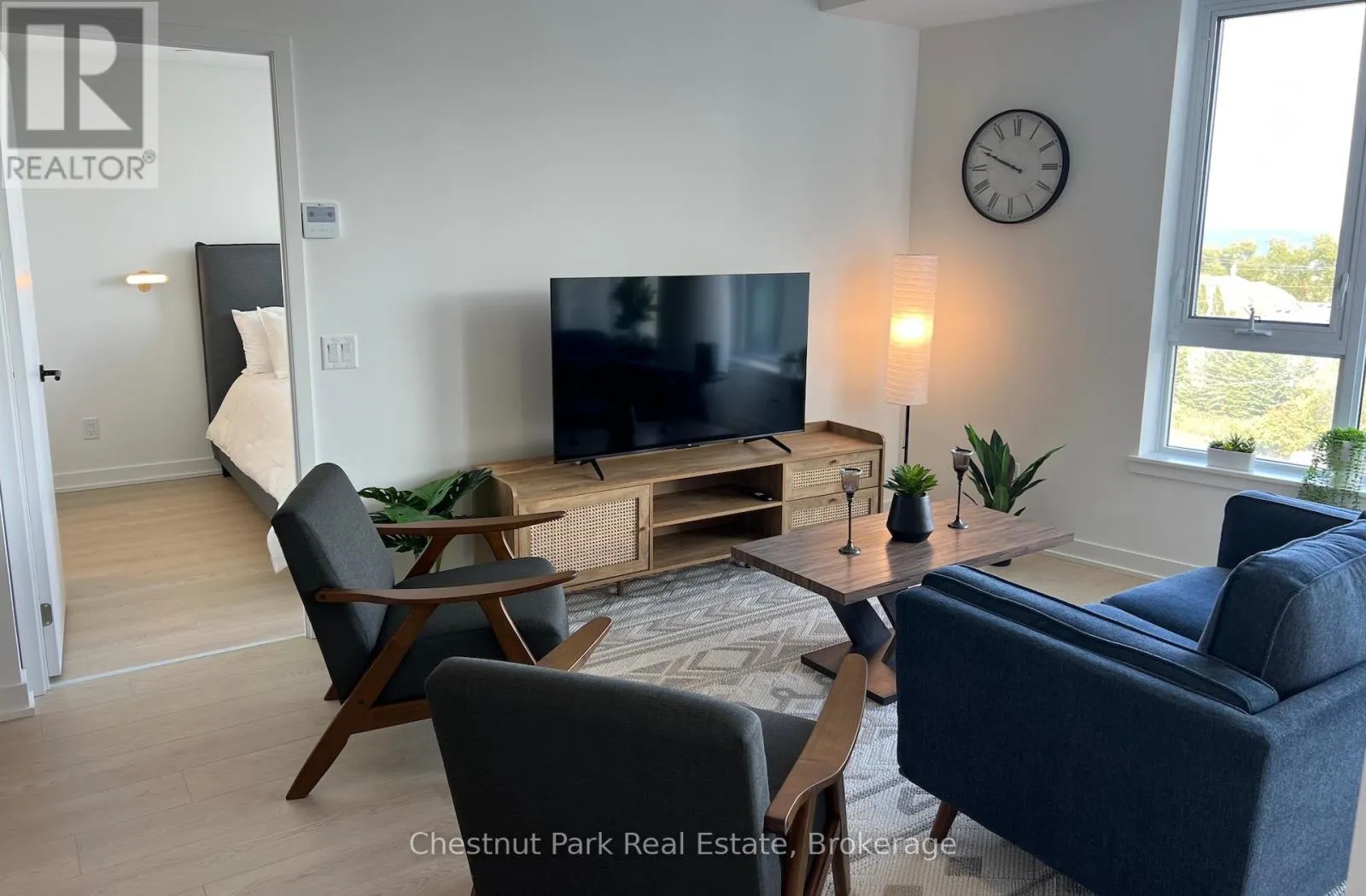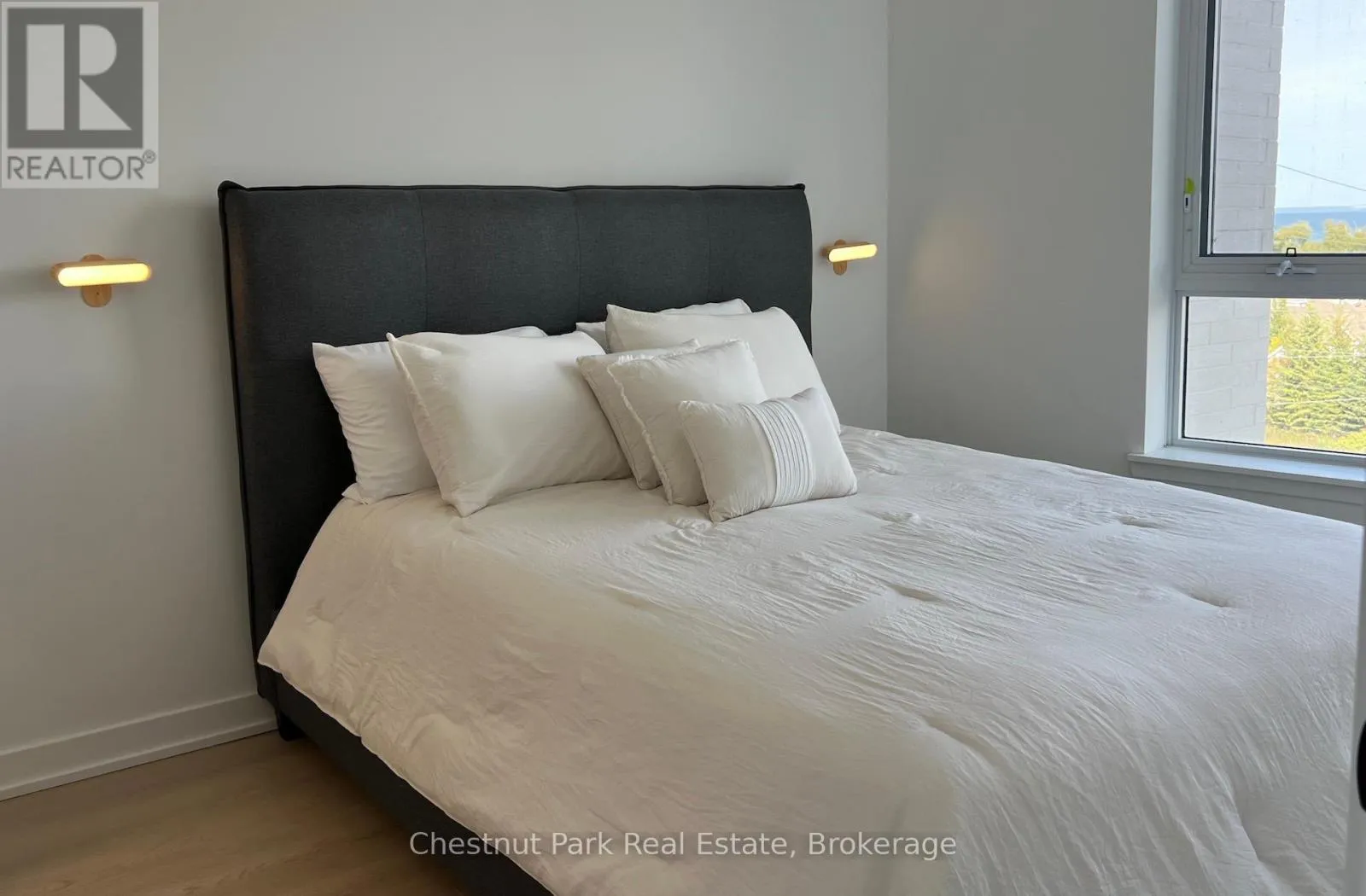Cross Streets: Huron Street & Heritage Drive. ** Directions: Highway 26 west to Collingwood to Heritage Drive. Welcome to your dream home in the heart of Collingwood - this never-lived-in, fully furnished 2-bedroom, 2 full bathroom condo offers the perfect blend of luxury, convenience, and lifestyle. Step inside to discover 865 sq ft of beautifully designed living space, with a modern kitchen featuring a large island with bar seating included, stunning waterfall quartz countertops, and a matching quartz backsplash - all part of a thoughtfully upgraded interior. The open-concept layout flows seamlessly to your 100 sq ft covered balcony, where youll enjoy unimpeded and protected east-facing views of Georgian Bay every morning. This turnkey unit includes all furniture and furnishings, so you can move in immediately and start enjoying your new lifestyle from day one. Perfectly located just 300 meters to both Farm Boy and Loblaws, and only steps from LCBO, Starbucks, Rexall, and BMO, and only 180 meters to Downtown Collingwood where shops, cafés, and restaurants await right outside your door. Whether you're looking for a year-round home, weekend retreat, or investment property, this condo is a must-see. (id:27476)