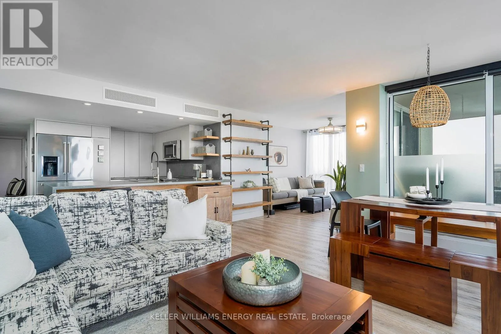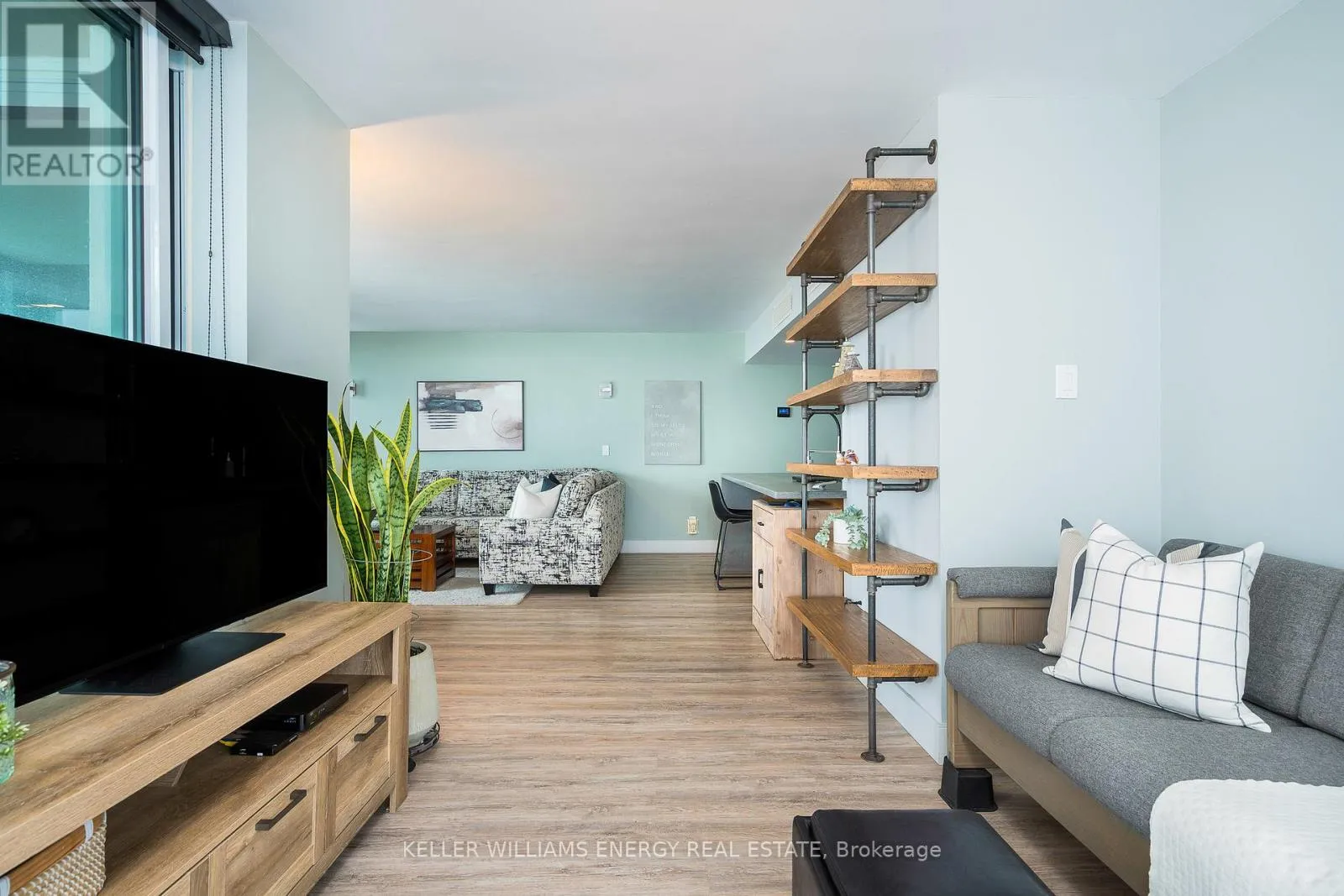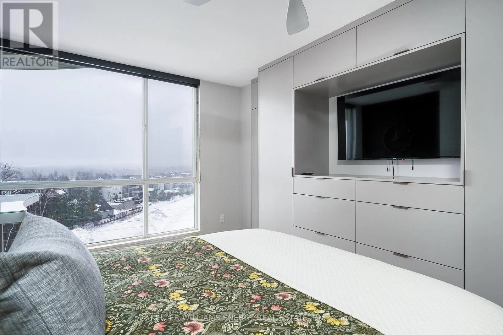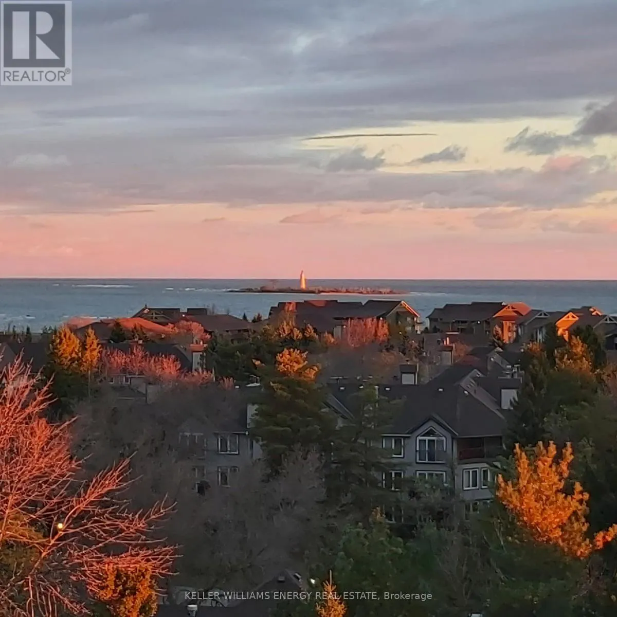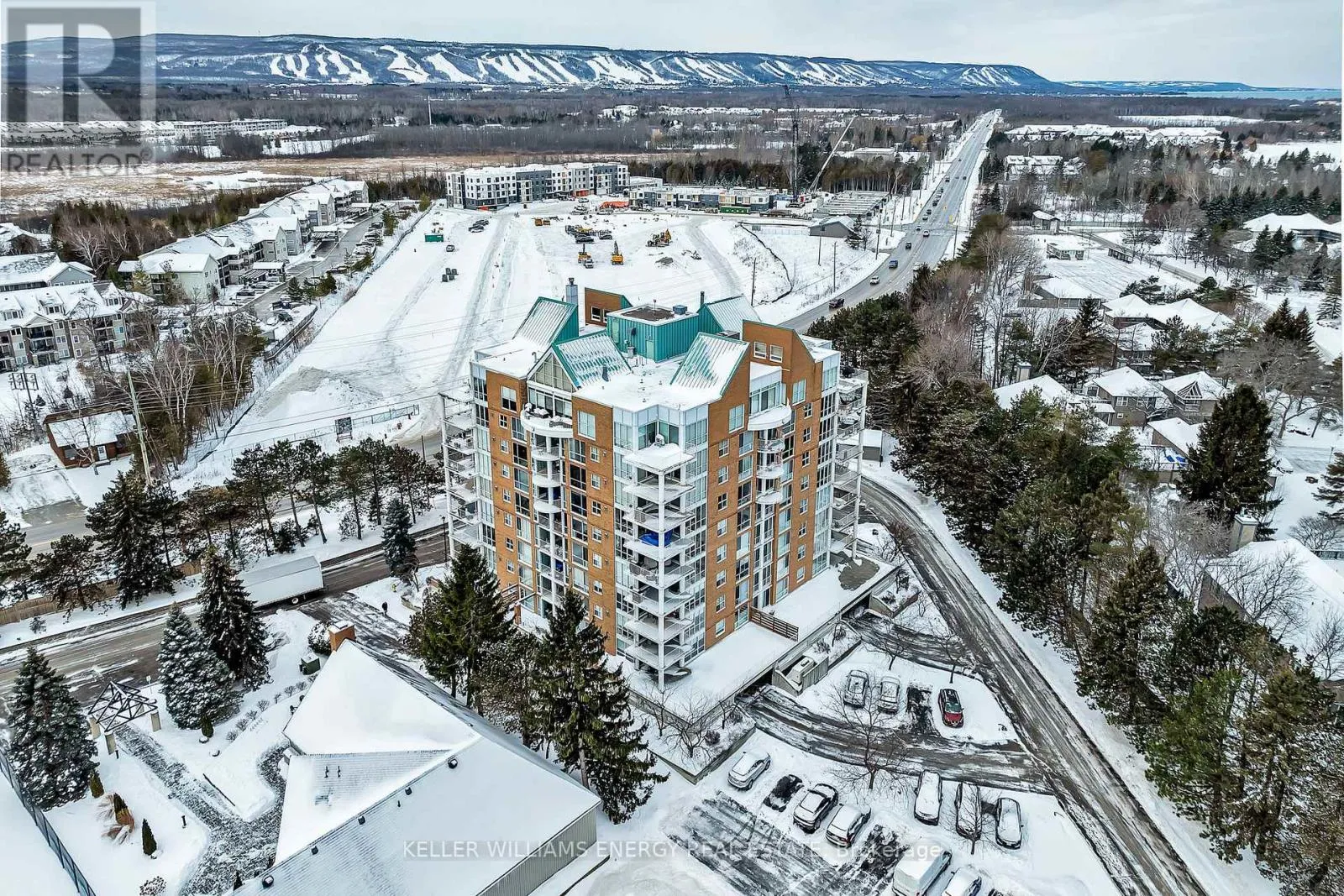 Cross Streets: Hwy 26 & Gun Club Road. ** Directions: Hwy 26 to Gun Club Road. Right on Gun Club Road. Left into the Rupert's Landing entrance gates. Welcome to the lifestyle you've been waiting for in Collingwood's prestigious Rupert's Landing. If you're ready to leave behind the hustle of city life - but not your love of style, space, and connection - this rarely offered 2-bed, 2-bath corner suite in one of Collingwood's premier gated waterfront communities is the perfect match. Perched on the 9th floor of Bayview Tower, this light-filled 1,300 sq ft residence offers panoramic views of Georgian Bay and the Niagara Escarpment, including front-row seats to Blue Mountain's seasonal fireworks from your private covered balcony. Inside, discover design that feels both elevated and effortlessly livable. Floor-to-ceiling windows flood the open-concept living, dining, and den spaces with natural light. The chef's kitchen features quartz waterfall counters, stainless appliances, custom cabinetry, and a built-in beverage centre. Whether you're entertaining or relaxing by the gas fireplace, every detail has been thoughtfully curated. The spacious primary suite includes modern built-ins, a designer feature wall, and a renovated 3-piece ensuite with walk-in shower and double-sink vanity. The second bedroom is bright and versatile-ideal for guests or a stylish home office. A generous foyer, in-suite laundry, and ample storage complete this refined, maintenance-free home. Enjoy access to an exclusive recreation centre with indoor pool, sauna, gym, racquetball court, tennis/pickleball courts, and a private marina with direct bay access for kayaking and paddleboarding. Minutes to Downtown Collingwood's boutique shops, restaurants, golf, trails, and ski hills, plus the year-round resort amenities of Blue Mountain. Collingwood is celebrated as a four-season playground on the shores of Georgian Bay-offering an unmatched blend of nature, community, and comfort. Don't miss this rare opportunity to experience waterfront living at its finest. (id:27476)