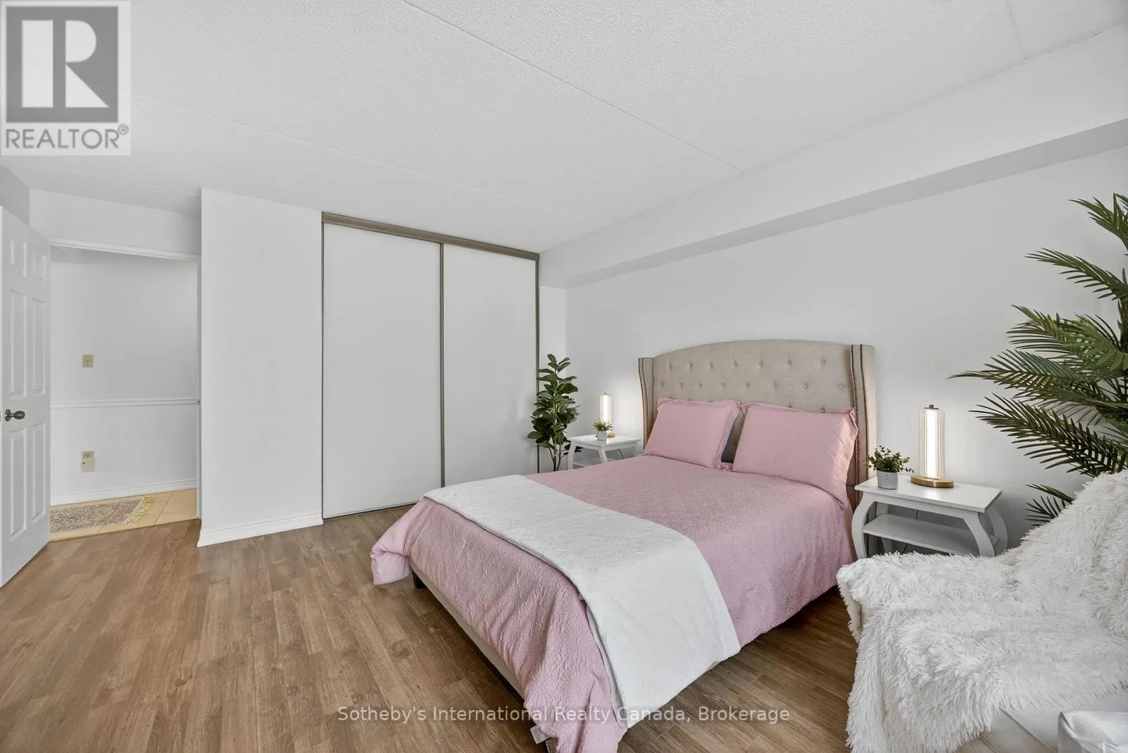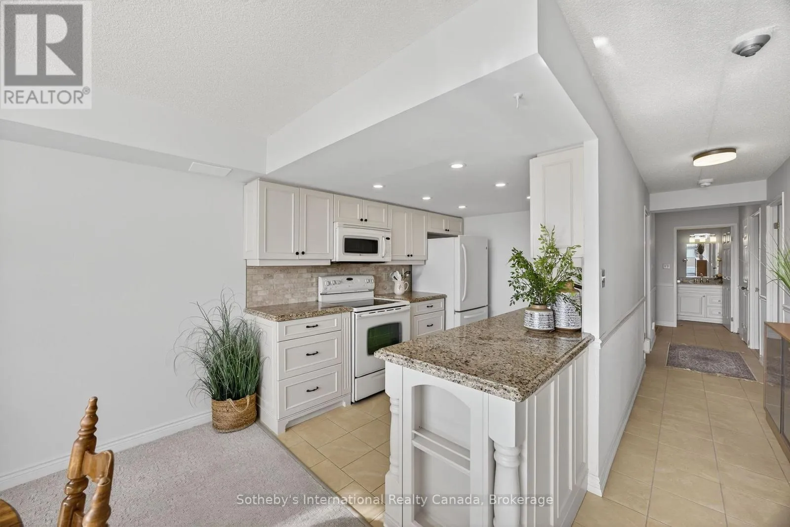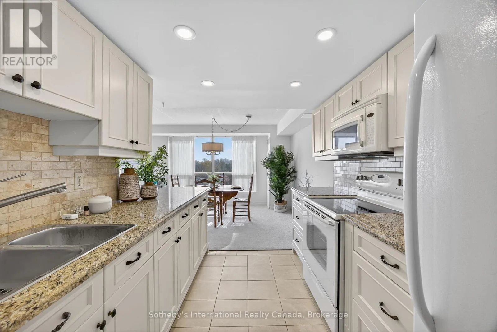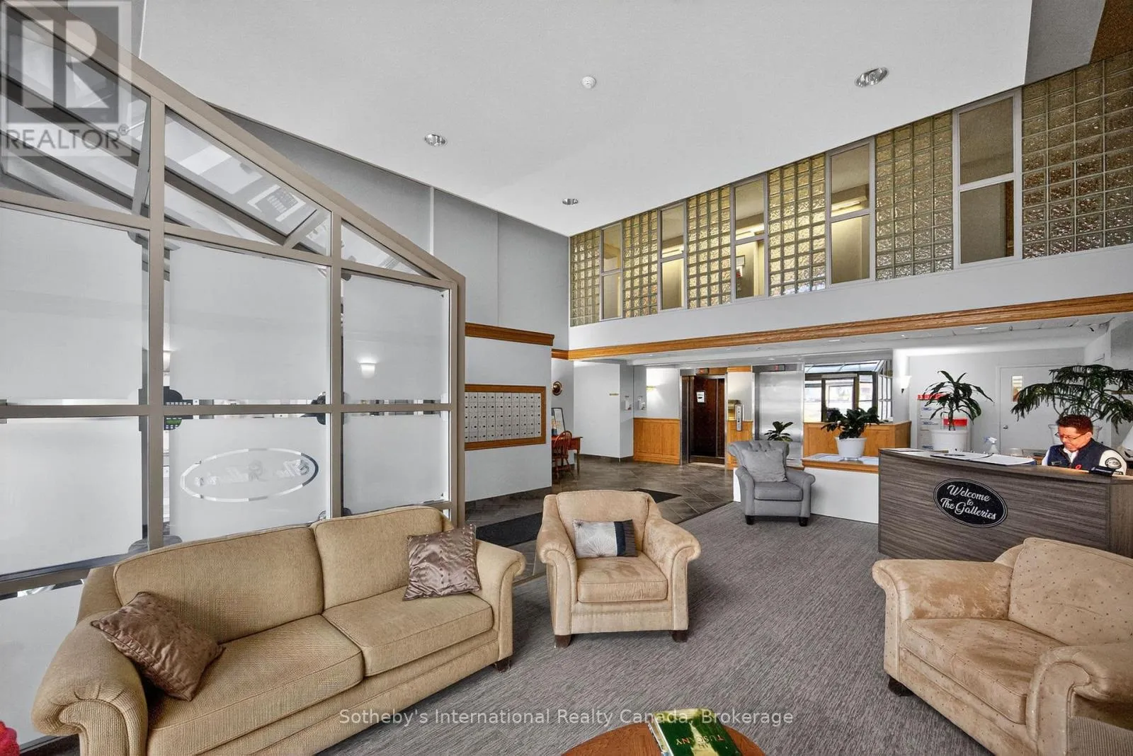 Cross Streets: Eighth/oak/walnut. ** Directions: From Oak to Eighth St to The Galleries. Light-filled corner unit in The Galleries with spectacular views of Blue Mountain from your private balcony! This spacious condo offers a beautifully updated kitchen featuring custom cabinetry, granite countertops, a dropped ceiling with spotlights, and a new sink and faucet (2025). The bathroom includes a walk-in shower and ceramic tile flooring, while the two generously sized bedrooms feature laminate flooring and abundant closet space. Enjoy the open-concept dining and living area, complete with walkout access to the balcony-perfect for taking in the views. The entry, hallway, living, dining, and kitchen areas were freshly painted in October 2025.This unit also includes a designated underground parking space and storage locker. The Galleries is a well-maintained, secure, and pet-friendly building (small pets only), offering a full suite of amenities: a fully equipped gym, sauna, party room, library, and a guest suite available for rent. Elevators and concierge service add to the convenience. Condo fees include heat, air conditioning, water, and sewer. Short closing available! (id:27476)
