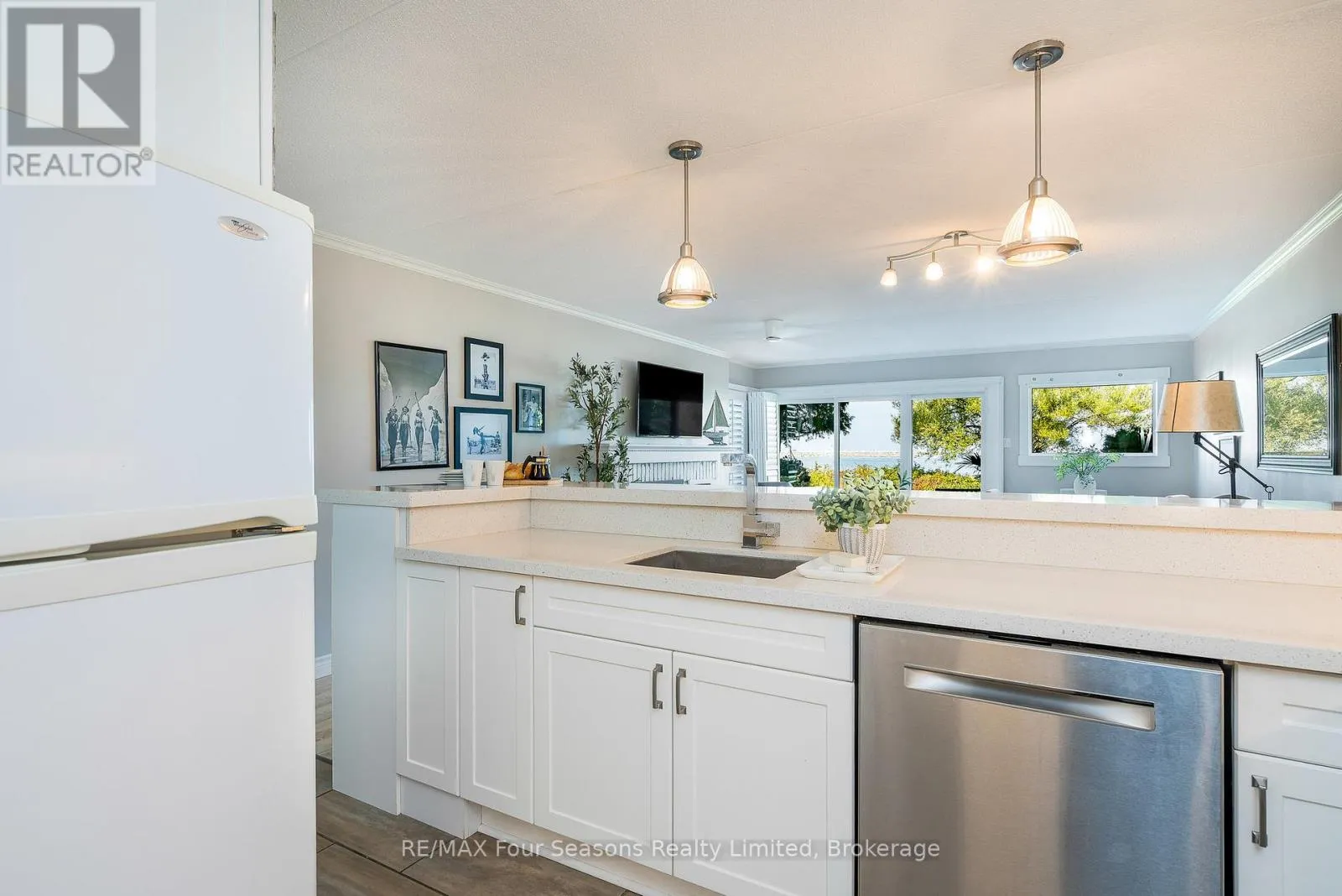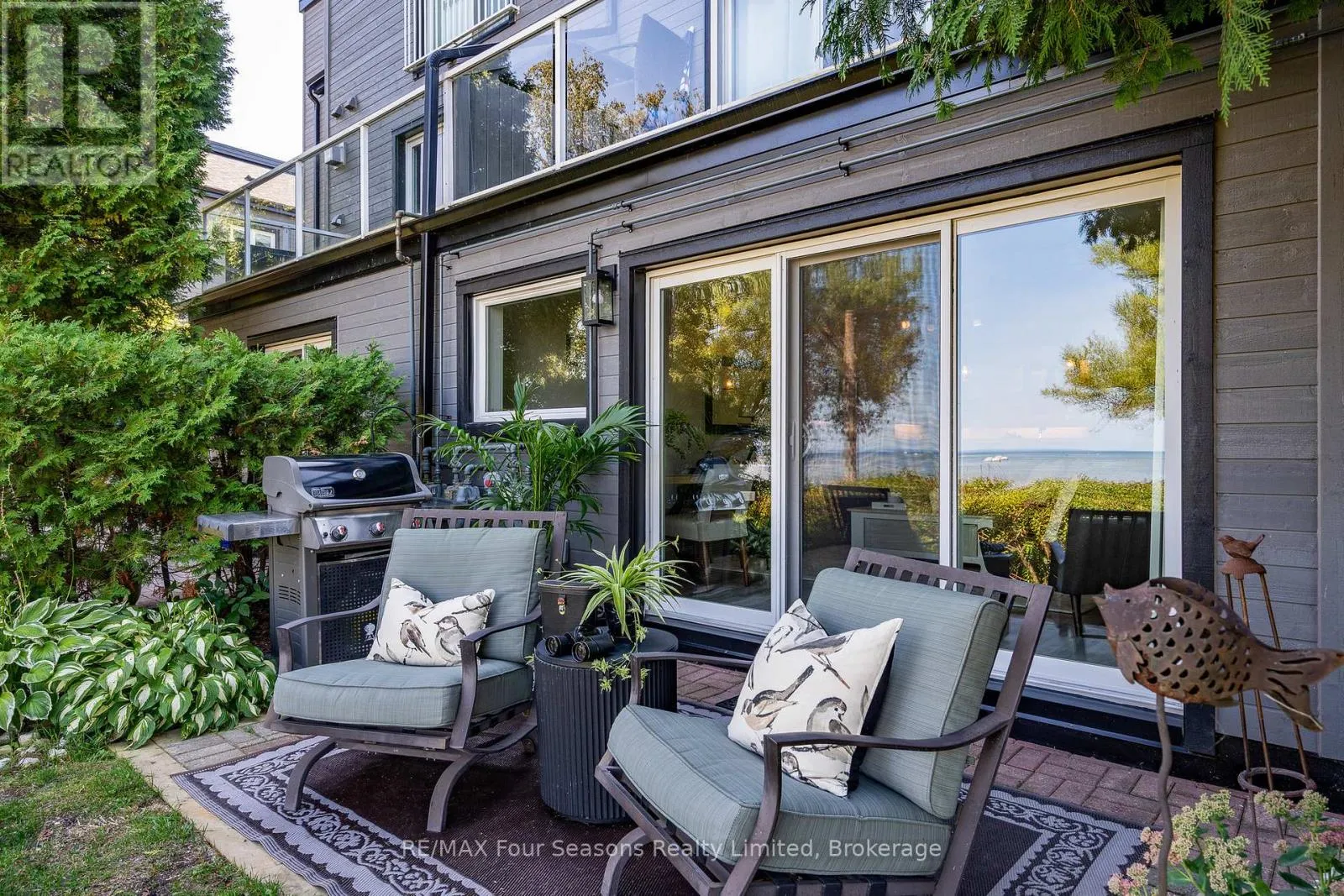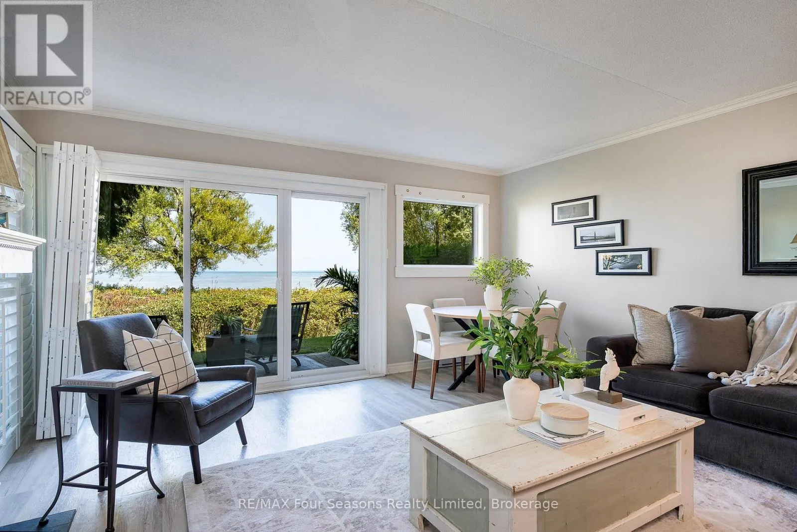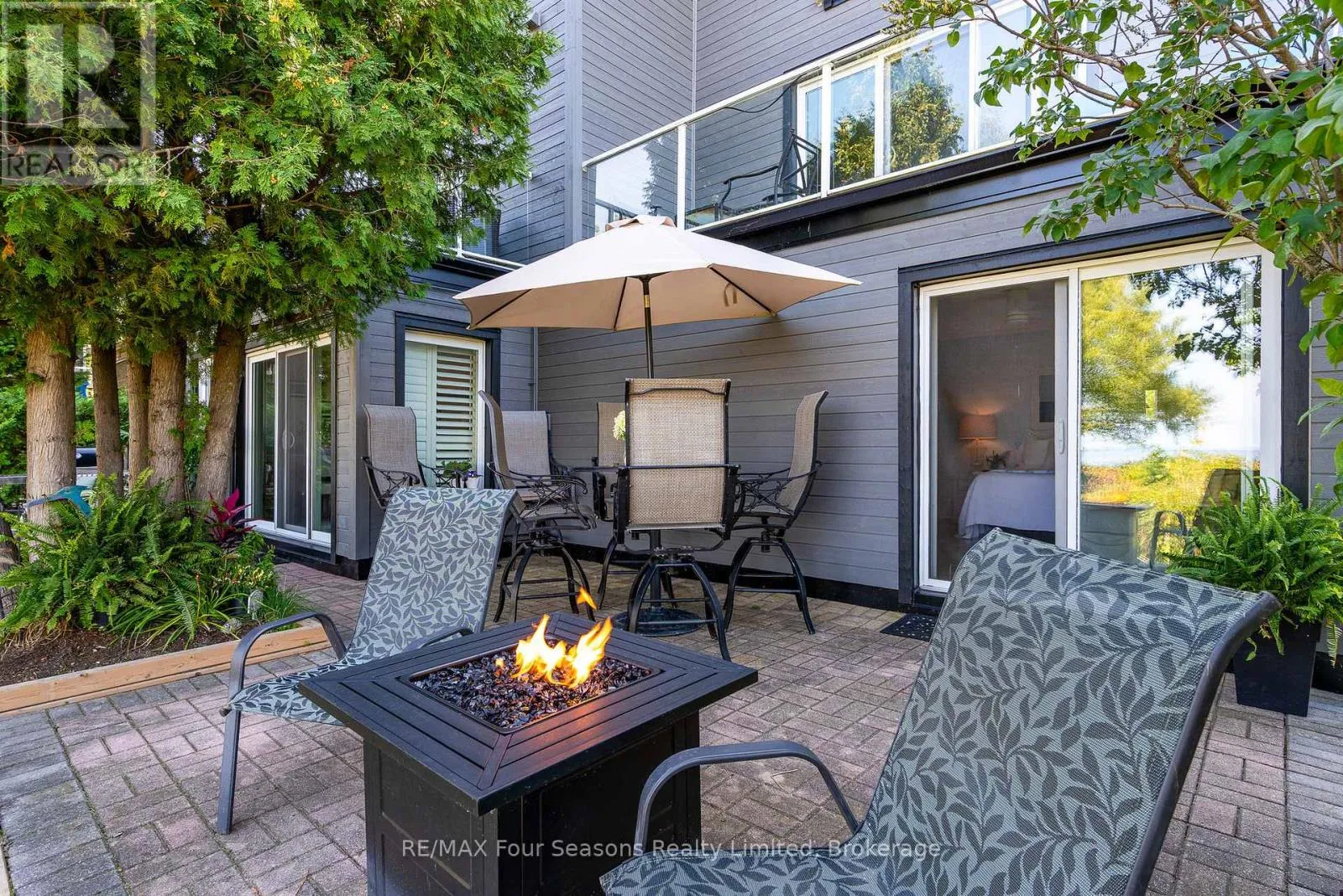 Cross Streets: Trott & Highway 26. ** Directions: Highway 26. Imagine waking up to the peaceful hush of winter-snow gently falling over Georgian Bay and the soft glow of sunrise painting the sky right outside your bedroom window. This rarely available 3-bedroom, 2-bathroom ground-level waterfront condo offers an intimate, year-round connection to the bay, with spectacular views from every room and direct access to the outdoors. Beautifully upgraded throughout, the condo features a modern kitchen with quartz countertops and high-end appliances, a bright open-concept living and dining area, and a cozy gas fireplace that makes winter mornings and evenings especially inviting. Two walkouts lead to an expansive patio overlooking the bay-perfect for bundling up with a hot coffee as you take in the serene winter landscape, and for dreaming about the warm summer days to come. Whether dusted in fresh snow or sparkling under a summer sun, the scenery here is breathtaking. Winter sunrises and sunsets feel magical, and as the seasons shift, you'll be ready to enjoy the private beach, kayak storage, and outdoor living that summer brings. Life at this condo is designed for comfort, convenience, and four-season enjoyment. Recently completed exterior improvements (all assessments fully paid) offer peace of mind, and Bell Fibre with unlimited internet-included in your condo fees-keeps you connected if you work from home. Step outside to enjoy the natural beauty of Georgian Bay, or take a short drive into Collingwood for boutique shops and great restaurants. With world-class skiing just minutes away in winter and exceptional golfing, hiking, and waterfront activities in summer, this is a true four-season retreat. Whether you're seeking a full-time residence, a weekend escape, or both, this waterfront condo offers a rare opportunity to embrace nature, comfort, and a lifestyle that feels like a getaway in every season. (id:27476)