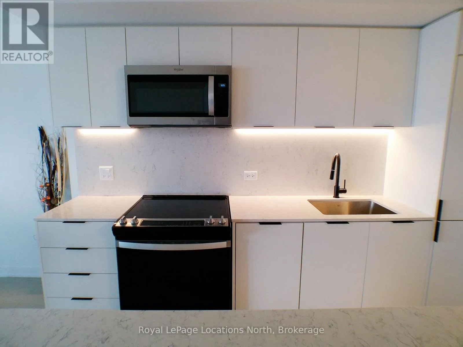 Cross Streets: Huron St & Heritage Dr. ** Directions: Huron St & Heritage Dr. Harbour House Building. Elevator to Third Floor. Stunning brand new Harbour House Condominium located in Collingwood. Just steps away from downtown Collingwood and scenic waterfront walking trails. This well-designed 1 bedroom condo offers 690 sq. ft. of living space along. The enclosed balcony encompasses 70 sq. ft and offers a side view of Blue Mountain. The condo is ready for immediate occupancy, and the rental price includes the furniture as shown. The suite boasts high-end finishes such as premium flooring, quartz kitchen countertops with a matching backsplash, built-in appliances including an over-the-range microwave and refrigerator. In-suite laundry. 4-piece bathroom with stone countertop and lavish bathtub. There is one designated underground parking space along with visitor parking available. Building amenities include bike storage, an exercise room, a pet wash area, and guest suites. It is conveniently located just a short distance from skiing, hiking, golfing, and fantastic restaurants in the downtown core of Collingwood. (id:27476)