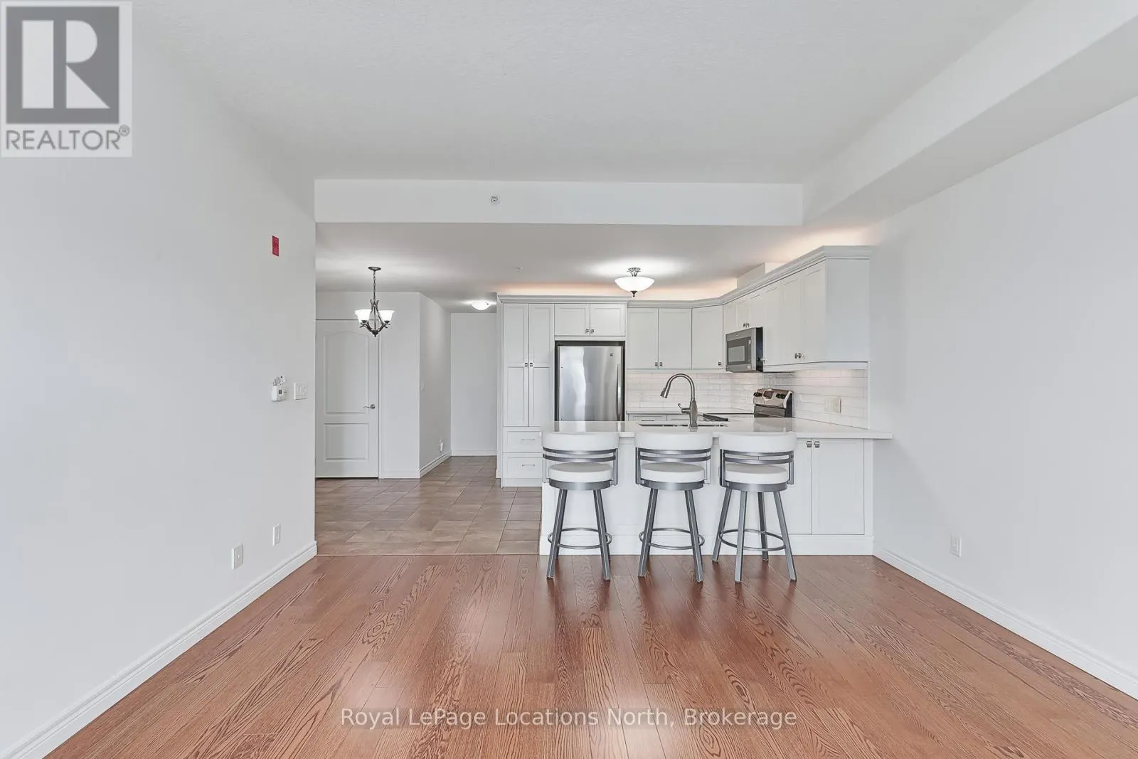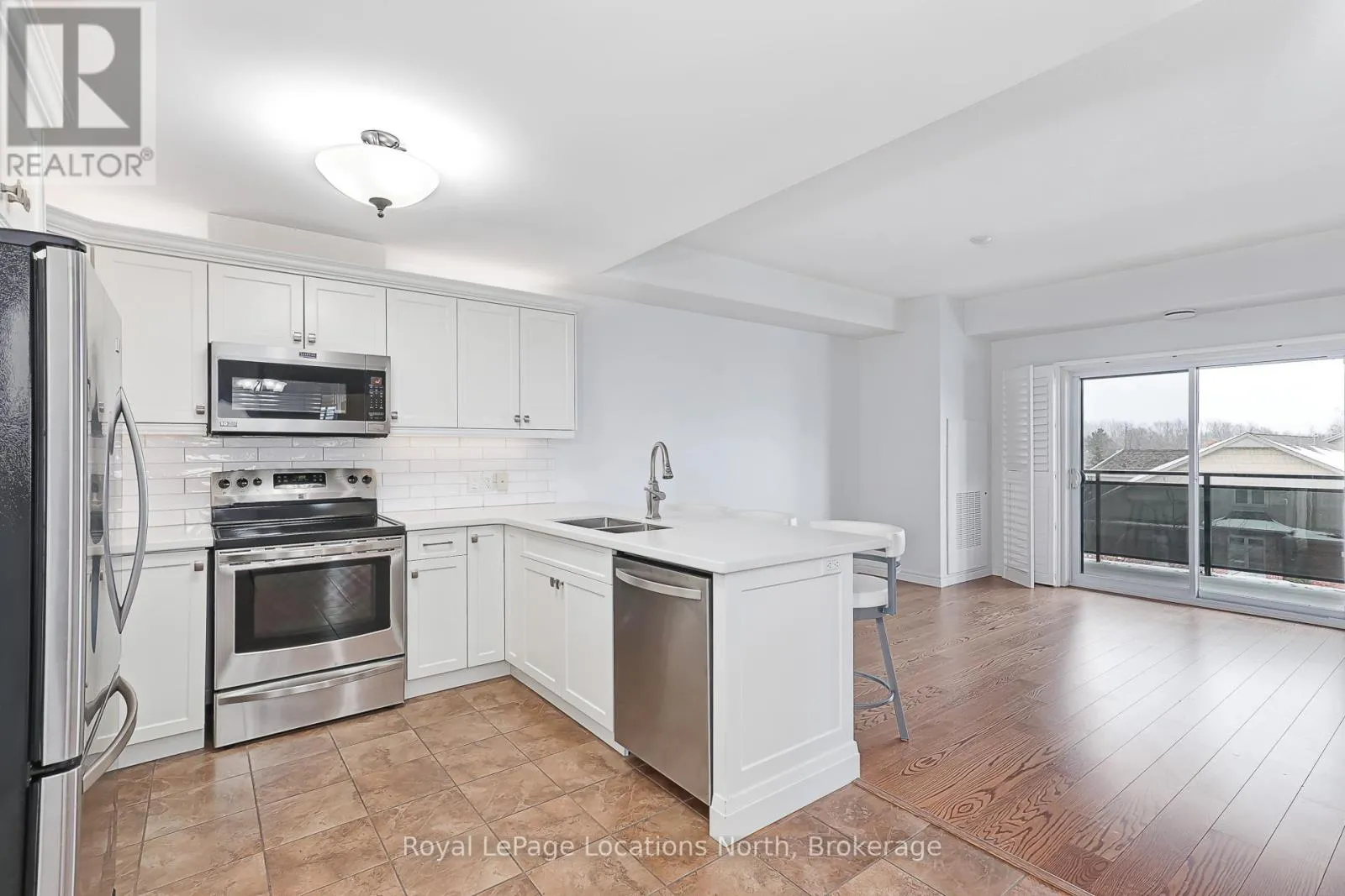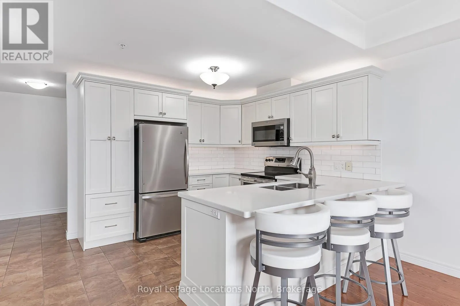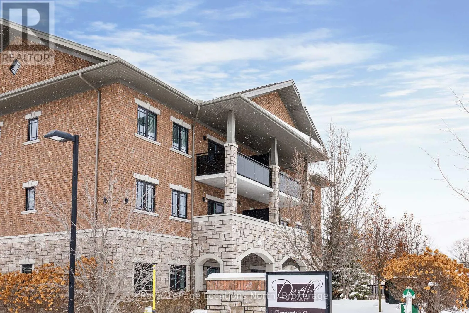 Cross Streets: Chamberlain & Barr. ** Directions: Hight St. to Chamberlain. Welcome to the luxury residence known as Dwell at Creekside. Built by Devonleigh Homes this Linden model offers 2 bedrooms, 1 bath and 924 square feet of comfortable living space. Open concept with a walk-out to a covered terrace. Great location on the top level, end unit with south facing views! Kitchen updated by Cabneato approx 5 years ago including cupboards, counters and tile backsplash. Over-sized pantry cupboard. Stainless steel appliances, bar stools and small freezer included. In-suite laundry has a laundry tub. Primary bedroom offers double windows and walk-in closet. 2nd bedroom is west facing and has a huge closet for storage. Parking space located just outside the main door! Additional parking space is $50 per month. Assigned storage locker included and additional bicycle storage available. There is also an elevator, mail room, garbage/recycling room and ample visitor parking. Located next to the lobby is the owner's meeting room with kitchenette that may be booked for use at no cost. Dwell is a very quiet building consisting of retirees, snowbirds and weekenders. Located close to shopping, trails, skiing, golf and Georgian Bay. Come and check out this well appointed unit available for immediate possession today! (id:27476)