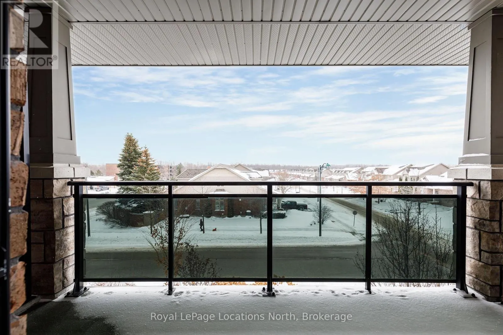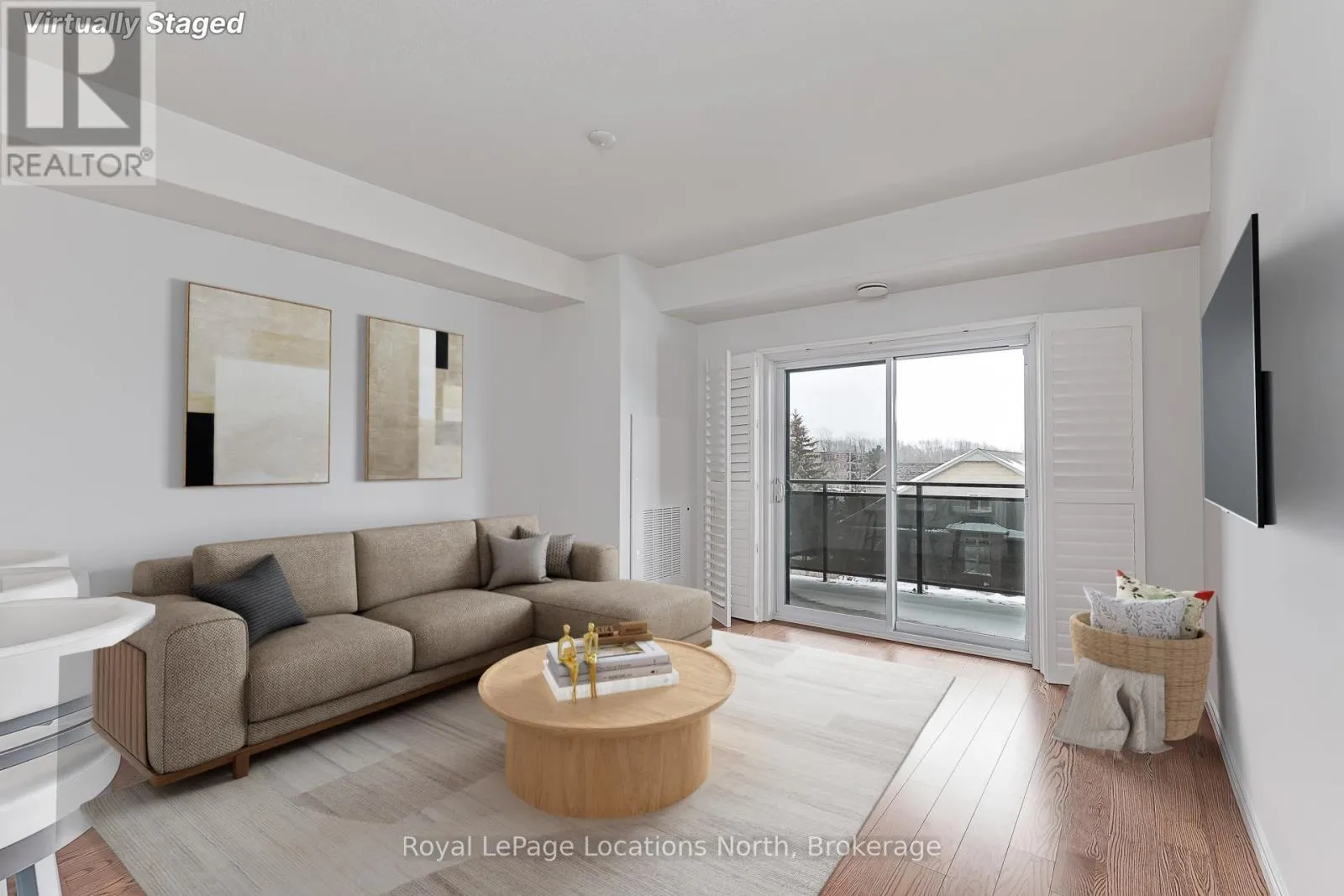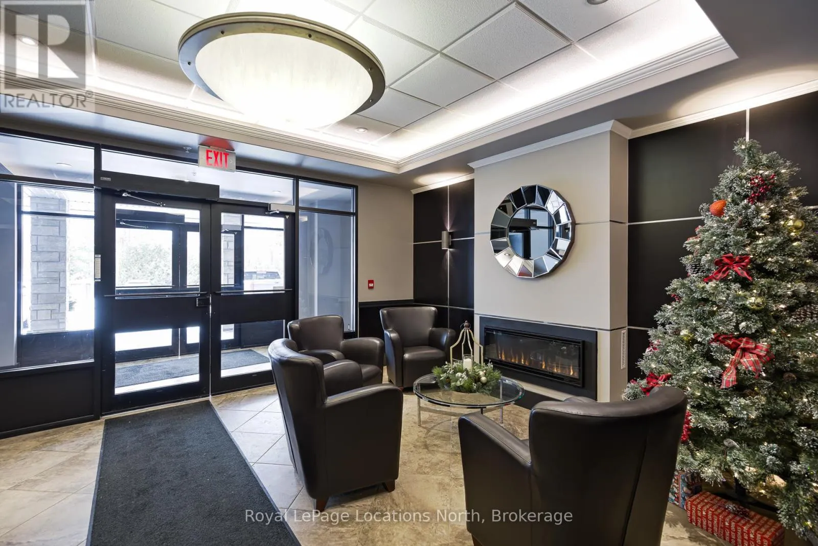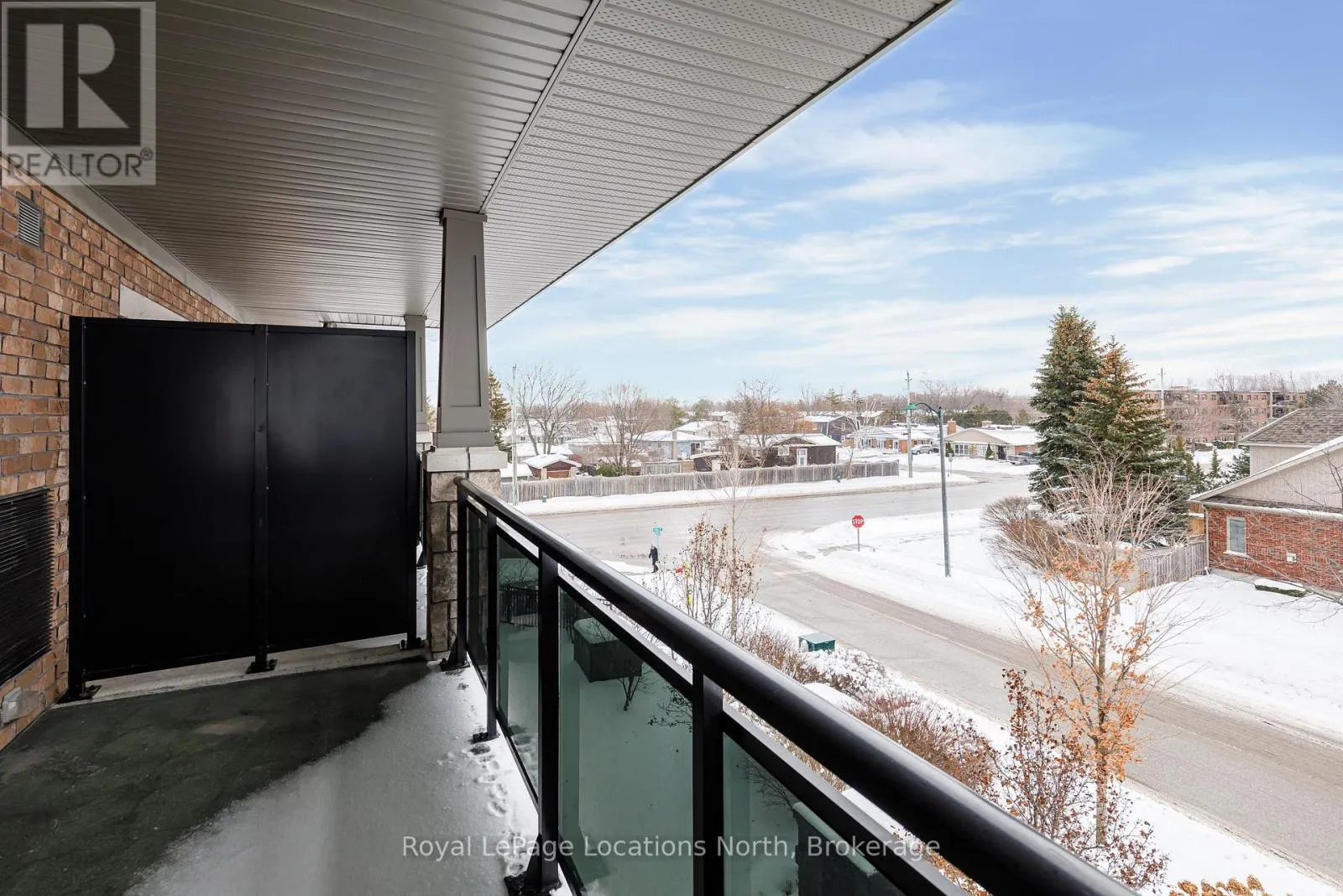 Cross Streets: Chamberlain & Barr. ** Directions: Hight St. to Chamberlain. Welcome to the luxury residence known as Dwell at Creekside. Built by Devonleigh Homes this Linden model offers 2 bedrooms, 1 bath and 924 square feet of comfortable living space. Open concept with a walk-out to a covered terrace. Great location on the top level, end unit with south facing views! Kitchen updated by Cabneato approx 5 years ago including cupboards, counters and tile backsplash. Over-sized pantry cupboard. Stainless steel appliances, bar stools and small freezer included. In-suite laundry has a laundry tub. Primary bedroom offers double windows and walk-in closet. 2nd bedroom is west facing and has a huge closet for storage. Parking space located just outside the main door! Additional parking space is $50 per month. Assigned storage locker included and additional bicycle storage available. There is also an elevator, mail room, garbage/recycling room and ample visitor parking. Located next to the lobby is the owner's meeting room with kitchenette that may be booked for use at no cost. Dwell is a very quiet building consisting of retirees, snowbirds and weekenders. Located close to shopping, trails, skiing, golf and Georgian Bay. Come and check out this well appointed unit available for immediate possession today! (id:27476)