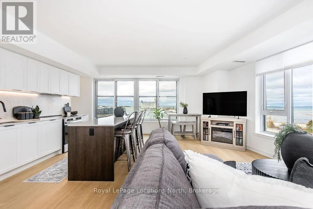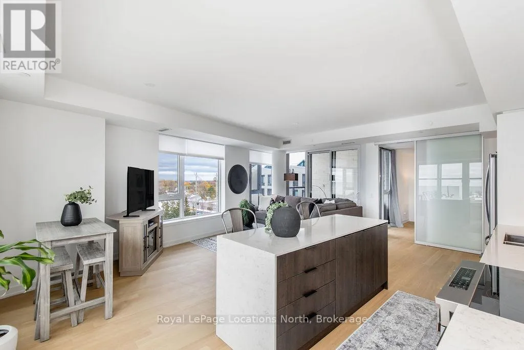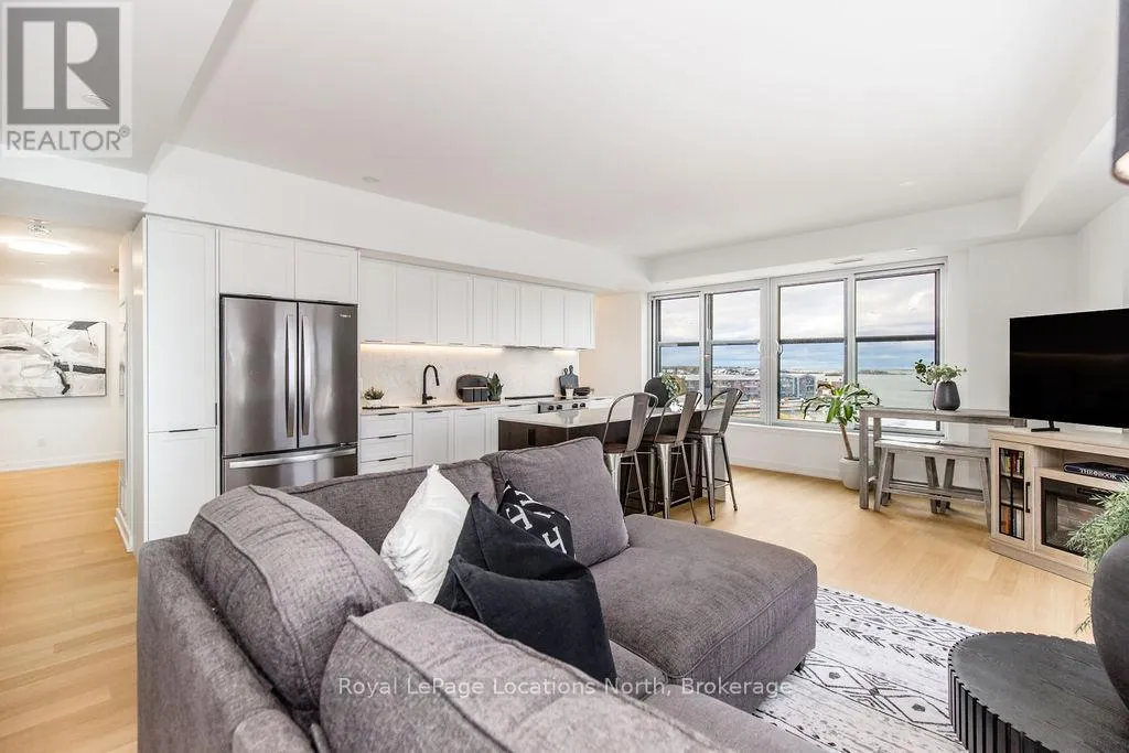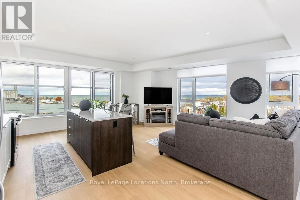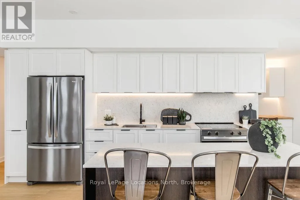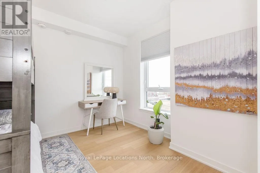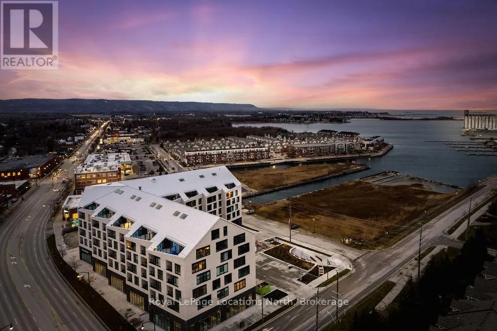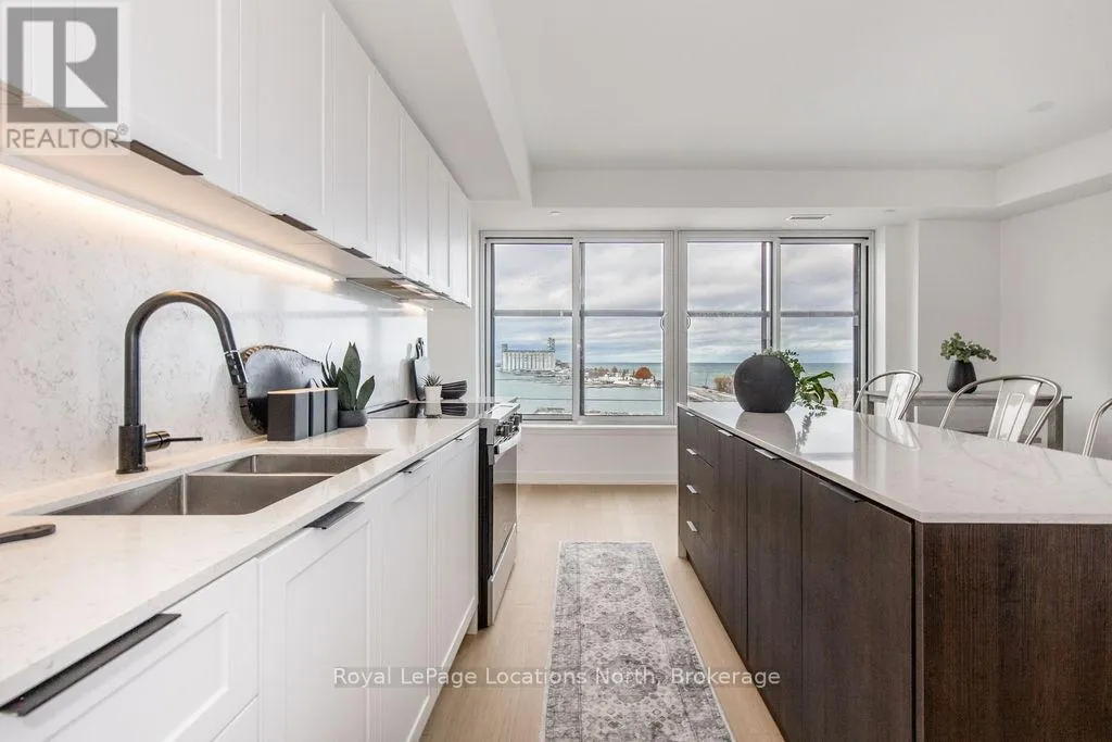 Cross Streets: Hurontario St and Huron St. ** Directions: Hurontario Street to Huron Street. The Best Views in the Building | Day or Night. This is the one everyone talks about. From this unit, you'll watch downtown Collingwood light up at night, see the hills of Blue Mountain glowing in the distance, and take in the harbour with boats and shipyards below. It's a view that never gets old.Set in a modern boutique building completed in 2022, this waterfront condo offers approximately 1,200 sq ft of well-designed living space with 2 bedrooms and 2 bathrooms. The layout is open and inviting, with oversized windows that flood the home with natural light and frame those incredible views from nearly every angle.The kitchen is bright and timeless, finished with classic white cabinetry, quartz countertops with a waterfall edge, a matching quartz backsplash, and a large island that's perfect for both entertaining and everyday living. The open living and dining space flows effortlessly to a 100 sq ft private terrace, creating an ideal spot to enjoy your morning coffee or unwind in the evening as the sun sets over the bay with a glass of wine. A thoughtfully designed built-in desk overlooking the water offers a beautiful and functional space for a home office or creative workspace.Every detail has been thoughtfully finished to create a comfortable, low-maintenance home that suits Collingwood's four-season lifestyle. The building offers excellent amenities including a fitness room, social lounge, guest suites, pet spa, and a rooftop terrace with panoramic views. Secure underground parking adds convenience and storage locker for all your outdoor sporting gear. Just outside your door you're instantly connected to the best of downtown, restaurants, shops, galleries, waterfront trails, and the marina are all just steps away. This is true walkable living, where you can leave the car behind and enjoy everything Collingwood has to offer. (id:27476)