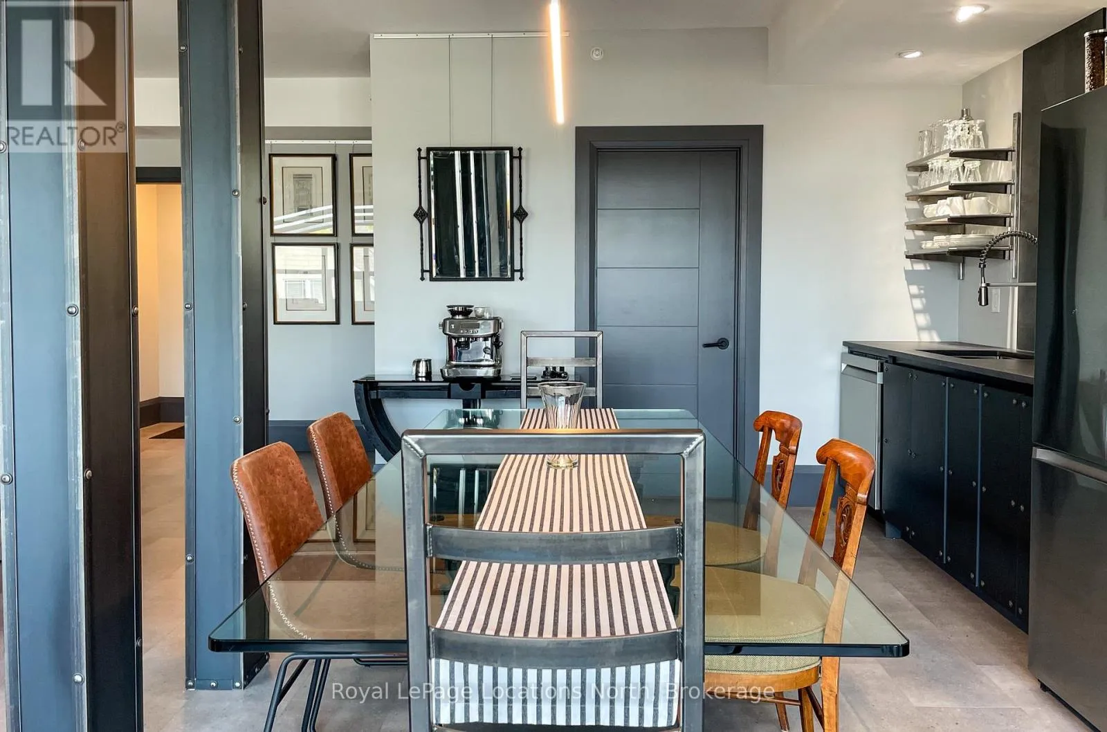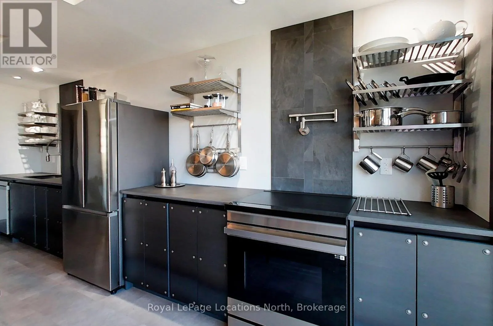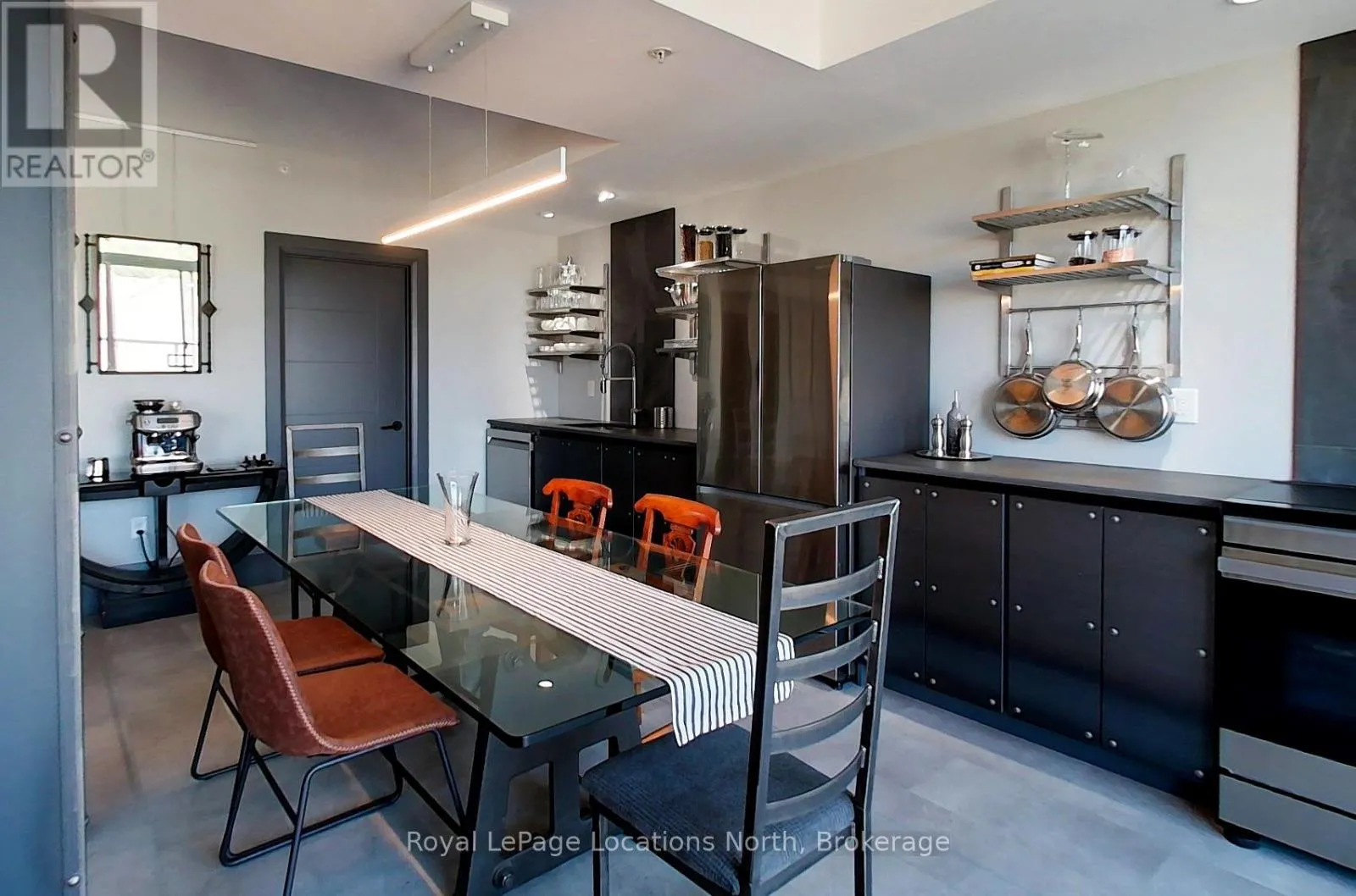 Cross Streets: North Pine St/Shipyard Lane. ** Directions: First St to North Pine St to Shipyard Lane. PENTHOUSE CONDO IN THE SHIPYARDS - Side Launch Building. Enjoy year-round views of the Escarpment. The FOUNDRY, as it was named by the architects, a 1,050 (approx.) square foot, one-bedroom condo, with 1.5 bathrooms, has been reimagined and completely renovated by KDT designs. Its unique minimalist style maximizes space and light. Steel clad cabinetry, custom concrete bathroom sinks, open concept closets, and new concrete style flooring create a calm, clean, airy environment from which to watch the Escarpments changing seasons. Did we mention you can view them from inside, in front of the fire during the winter, or from one of your two balconies during the summer? New Samsung appliances, a smart toilet in the ensuite, and a new, owned HW tank, complete this move in ready condominium. The SIDELAUNCH building is a secure, well-maintained building. The buildings main floor has a renovated social room with a full kitchen, dining and sitting area with a TV, and an outdoor dining and BBQ area. The elevator takes you to/from your unit on the third floor, and the underground parking garage where you have a dedicated parking space, and storage locker, along with a common bike and kayak storage room. (id:27476)