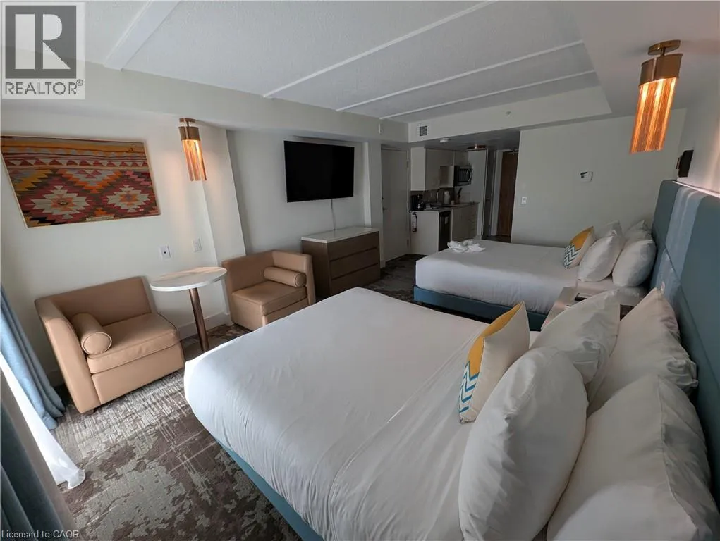 North on 26 Balsam/Harbour Street Start your Collingwood getaway each year with fixed Weeks 1, 2 and 14 in this spacious mountain-view resort suite at Living Water Resort & Spa.Suites 4403 & 4405 combine to offer approximately 1,200 sq ft in a versatile lock-off layout, allowing use as one large two-bedroom, two-bath retreat or two fully self-contained spaces. The primary suite features a king bedroom with private ensuite, full kitchen, in-suite laundry and comfortable living area, while the adjoining studio includes two queen beds, kitchenette and its own balcony access. Ideal for hosting guests or flexible use. Unused weeks may be placed into the resort rental pool or exchanged within the ownership program, offering flexibility year to year. Ownership is fully managed by the resort for a convenient, maintenance-free experience. The 2026 annual fee is $3,277.61 and includes property taxes, utilities, insurance, maintenance and management. Enjoy on-site amenities including pool facilities, spa services, waterfront dining, marina access and easy proximity to downtown Collingwood, Blue Mountain, trails, beaches and Georgian Bay. A practical way to secure consistent annual vacation time in one of Collingwoodâs premier waterfront resort locations. (id:27476)