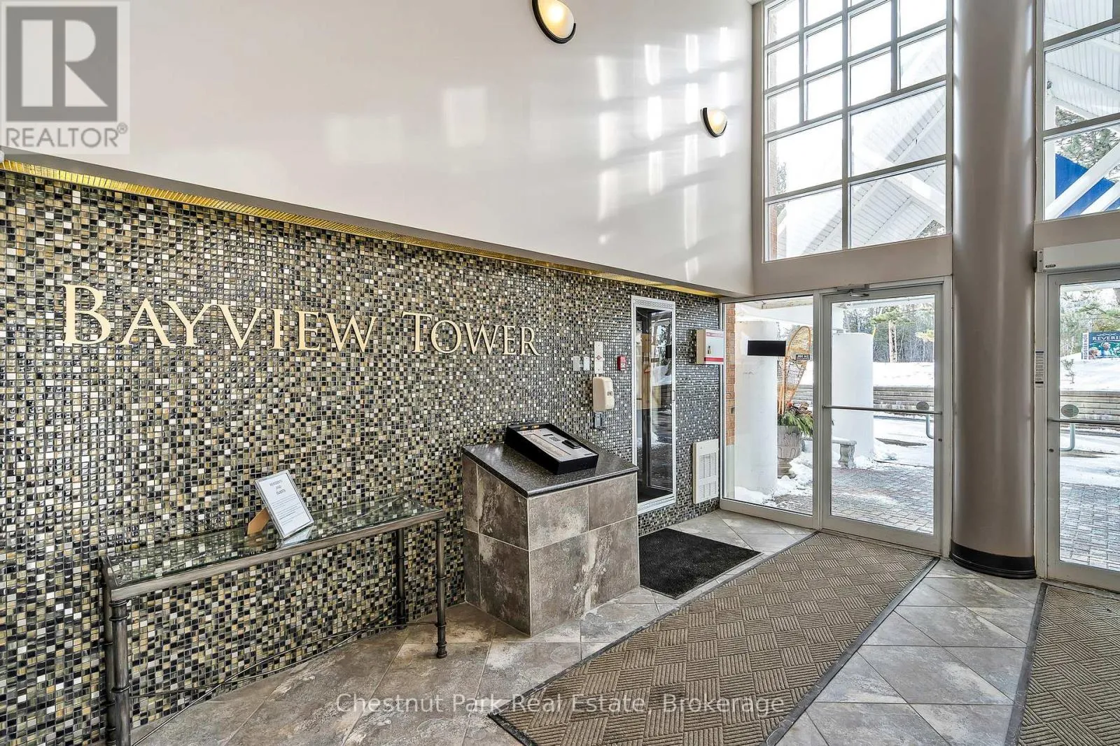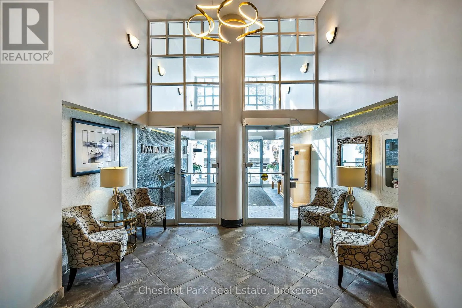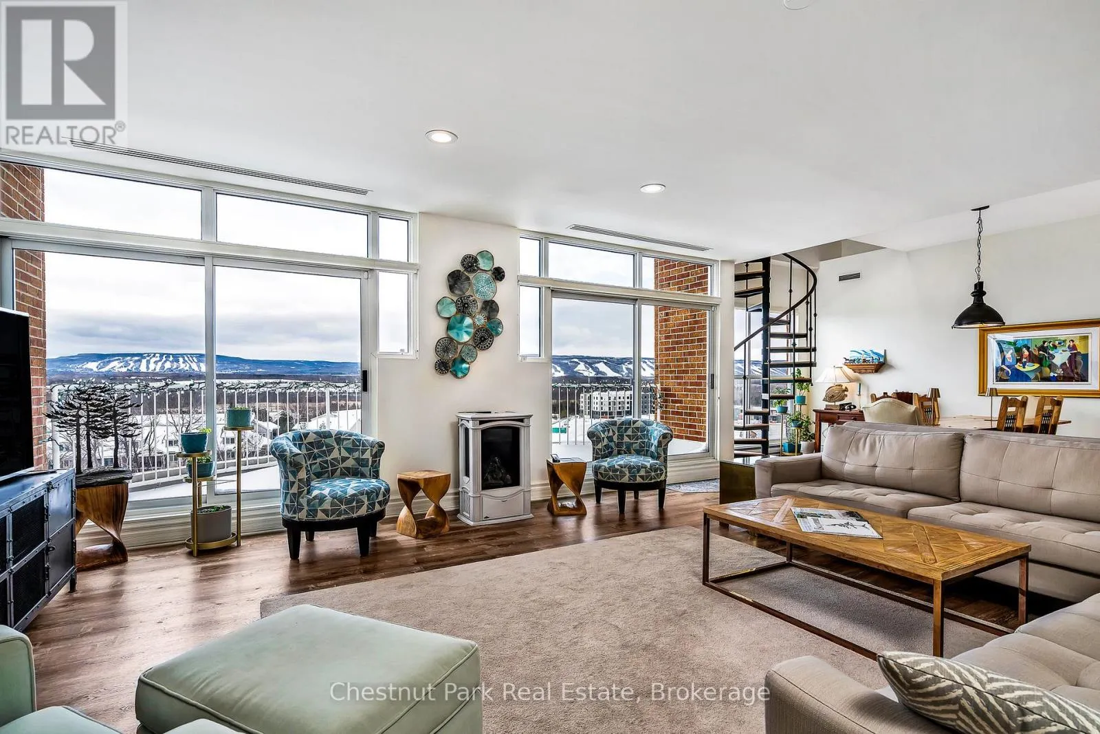 Cross Streets: Highway 26 West and Gun Club Road. ** Directions: Highway 26 west from Collingwood to Gun Club Rd, turn right to main gate on left to Ruperts landing, once inside the gate turn left and drive around to the tower. Parking is past the front entrance to the tower. Experience premier penthouse living at its finest in this breathtaking 1894 sq.ft. condo offering panoramic views of the Escarpment, ski hills and the iconic Lighthouse Island. This is the tallest penthouse in this Southern Georgian Bay area - a home that truly makes a statement. Two deeded, covered parking spaces with inside entry to the building provide convenience during the rain or winter months. Here, the value of your monthly maintenance fees lies in what you gain. Water, cable, high-speed internet and premium amenities are all included, saving you thousands annually on outside services you'd pay for separately. Forget monthly gym memberships, court fees, or driving in town for recreation - everything is right here. Enjoy the marina, indoor pool, sauna, tennis, pickleball, squash, fitness centre plus social lounges and more. This is a home designed for those who value comfort and a worry-free lifestyle. Every season brings a new masterpiece outside your window; snow covered ski hills glowing at night, the fiery colors of autumn across the escarpment, and the shimmering blues of summer water. Inside the penthouse is just as impressive as the views. Floor-to-ceiling windows in the living room and bedrooms flood the space with natural light and frame the changing scenery like works of art. The open-concept kitchen, dining and living areas are perfect for entertaining, complete with a Napoleon gas fireplace and seamless access to one of two spacious decks. The primary suite feels like a retreat of its own, offering a private deck, gas fireplace in the office/sitting area, a spacious walk-in closet, and a beautifully updated 3 pc ensuite. The guest bedroom captures the western sunsets while a versatile loft space, reached by a circular staircase off the dining room is ideal as a home office, yoga studio or quiet hideaway. This is a rare opportunity to own a home that simplifies life, while offering the best of Collingwood living. (id:27476)